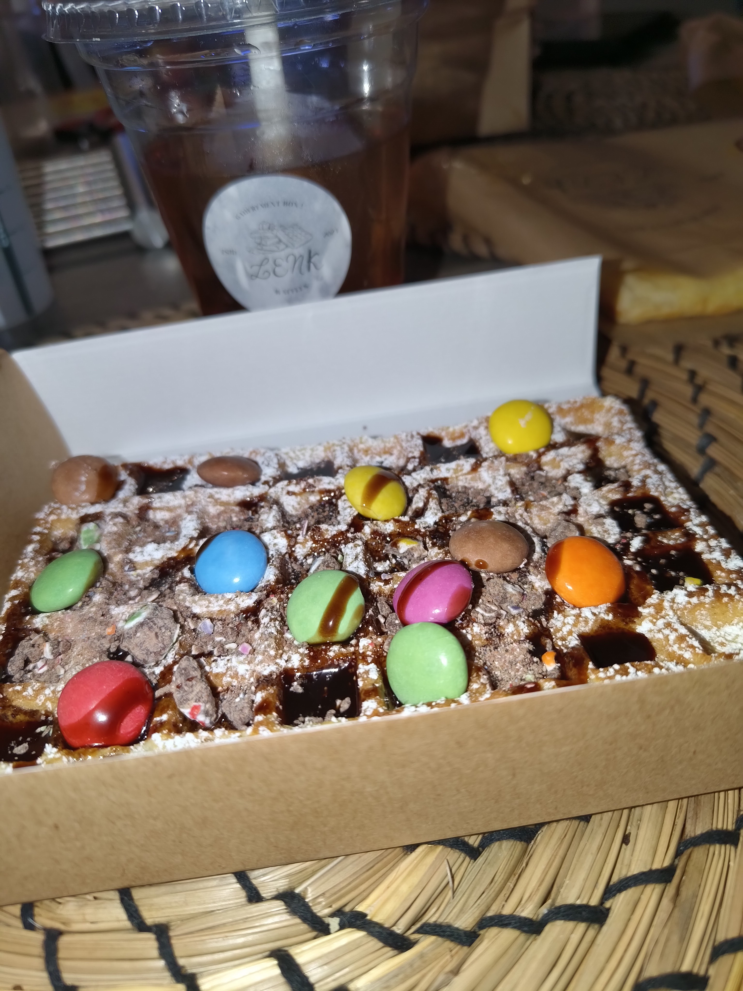 1ère commande faite, découverte gustative, waffle indian super bon avec un dessert bueno Chantilly,une petite salade en accompagnement et un p'tit verre, Super bon