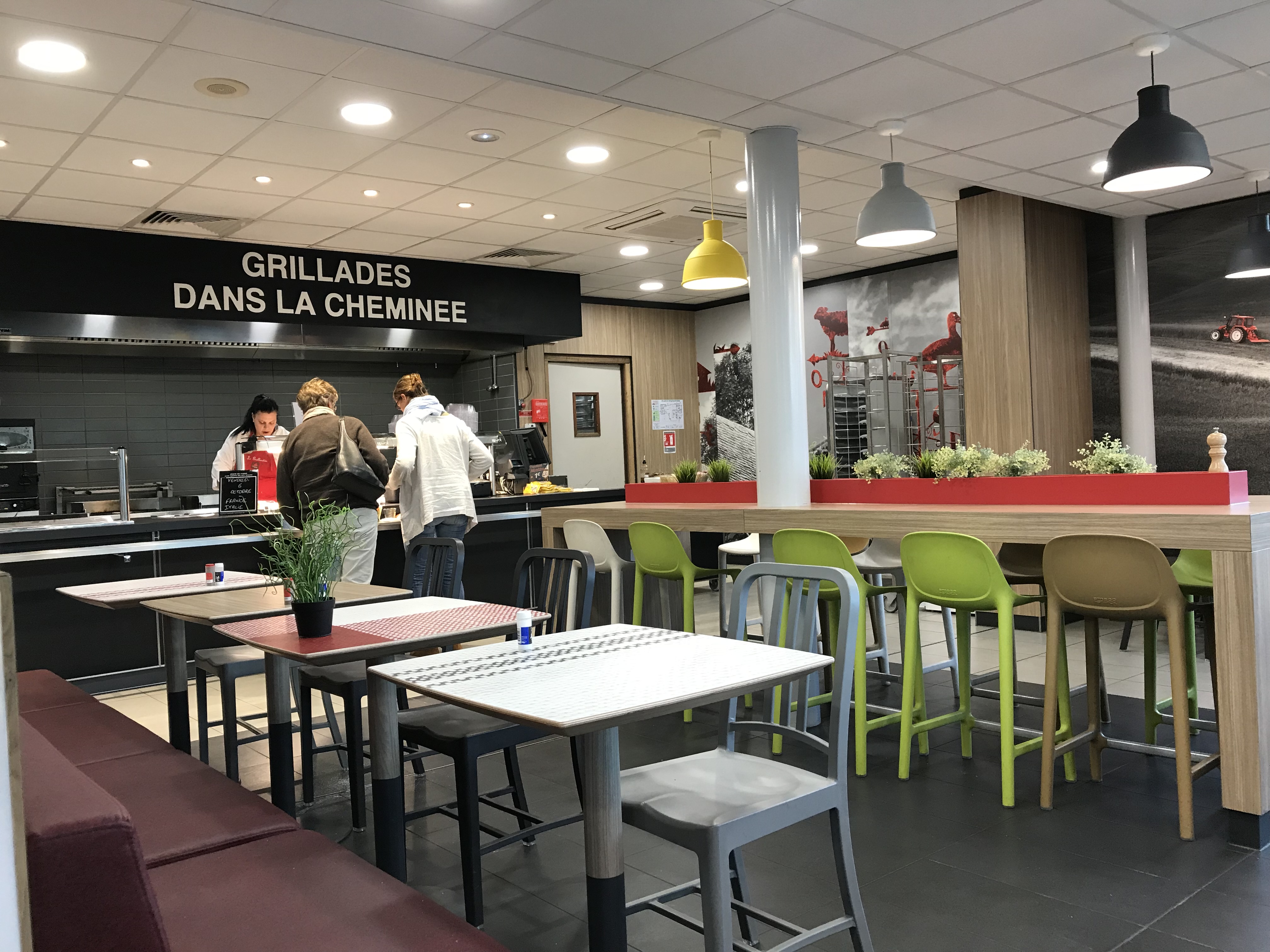 Nous avons fait une pause déjeuner dans ce restaurant lors d'un grand trajet. Le service est rapide, on prend un plateau on choisi et on paye. Ensuite pour les places assise il y avait le choix, pas grand monde à l'heure où on y était. Il y a des chaises bébés à disposition pour les plus petits. Pour ce qui est du repas : On a prit un parmentier de canard aux trois pommes. Une déception c'était de la purée mousseline, et le canard n'avait pas beaucoup de goût. Pour les enfants un poulet sauce poivre avec des frites. En fromage un chèvre, qui lui était bon. En conclusion c'est mieux qu'un sandwich mais attention à bien choisir vos plats.