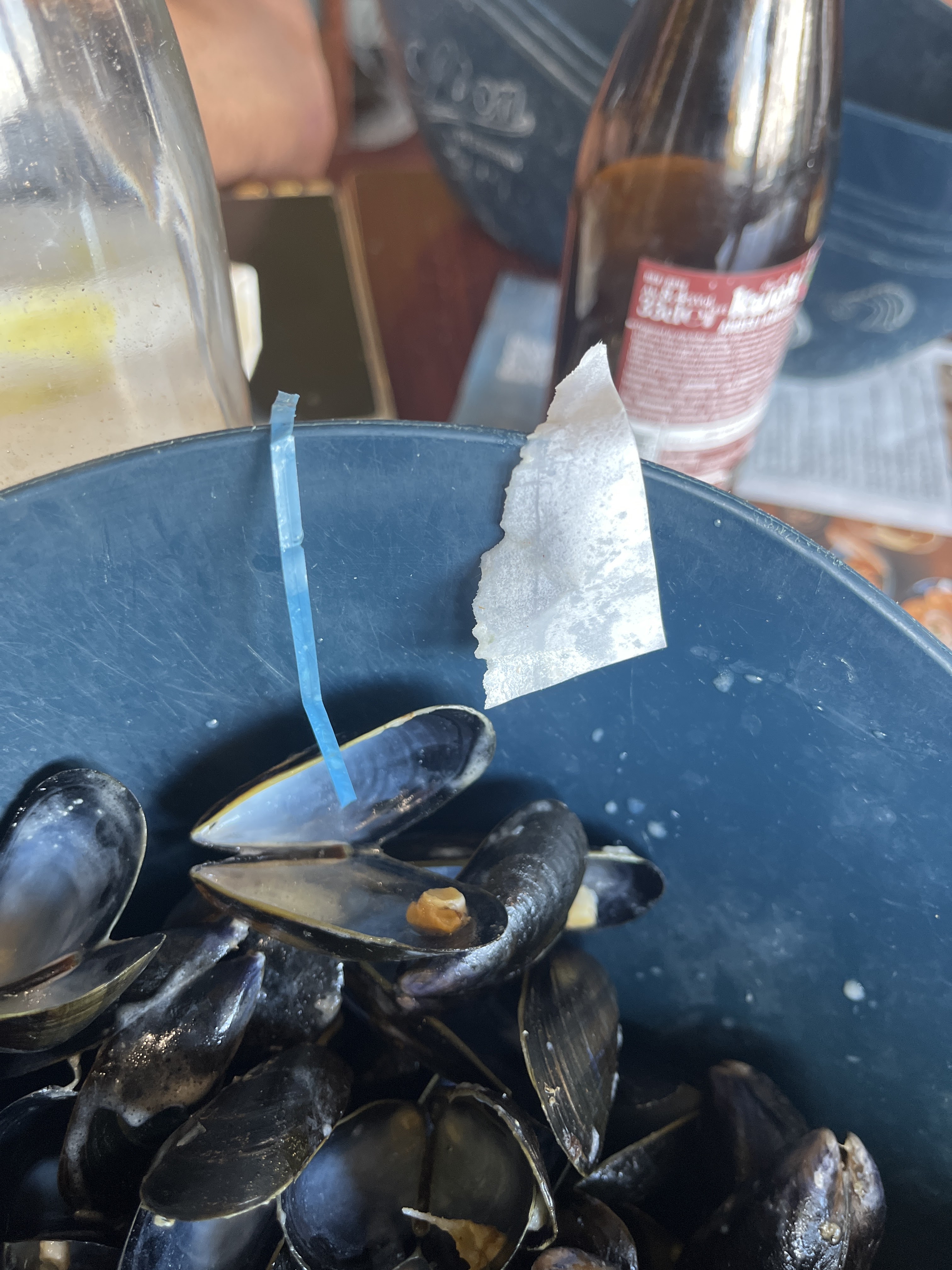 Le personnel est très sympathique. Le bac à coquilles de moules était sale avant son utilisation. Le verre de vin est servi glacé et c'est le fond de bouteille.