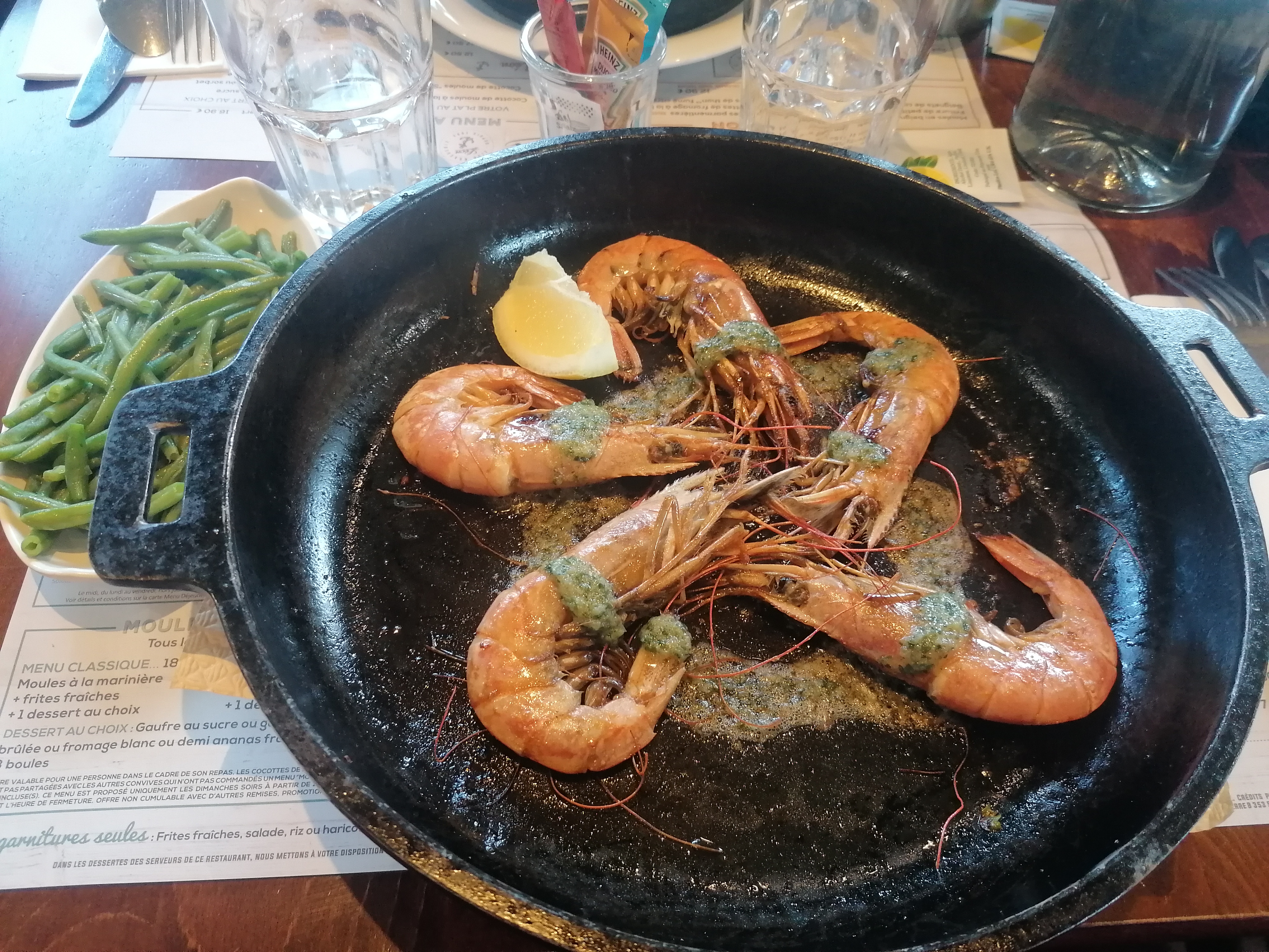Repas en famille. Ambiance conviviale et chaleureuse. Cependant nous trouvons que l’assiette d’entrée de 6 crevettes à 6,50 € était trop chère. Les moules sont bien cuisinés et les frites classique.