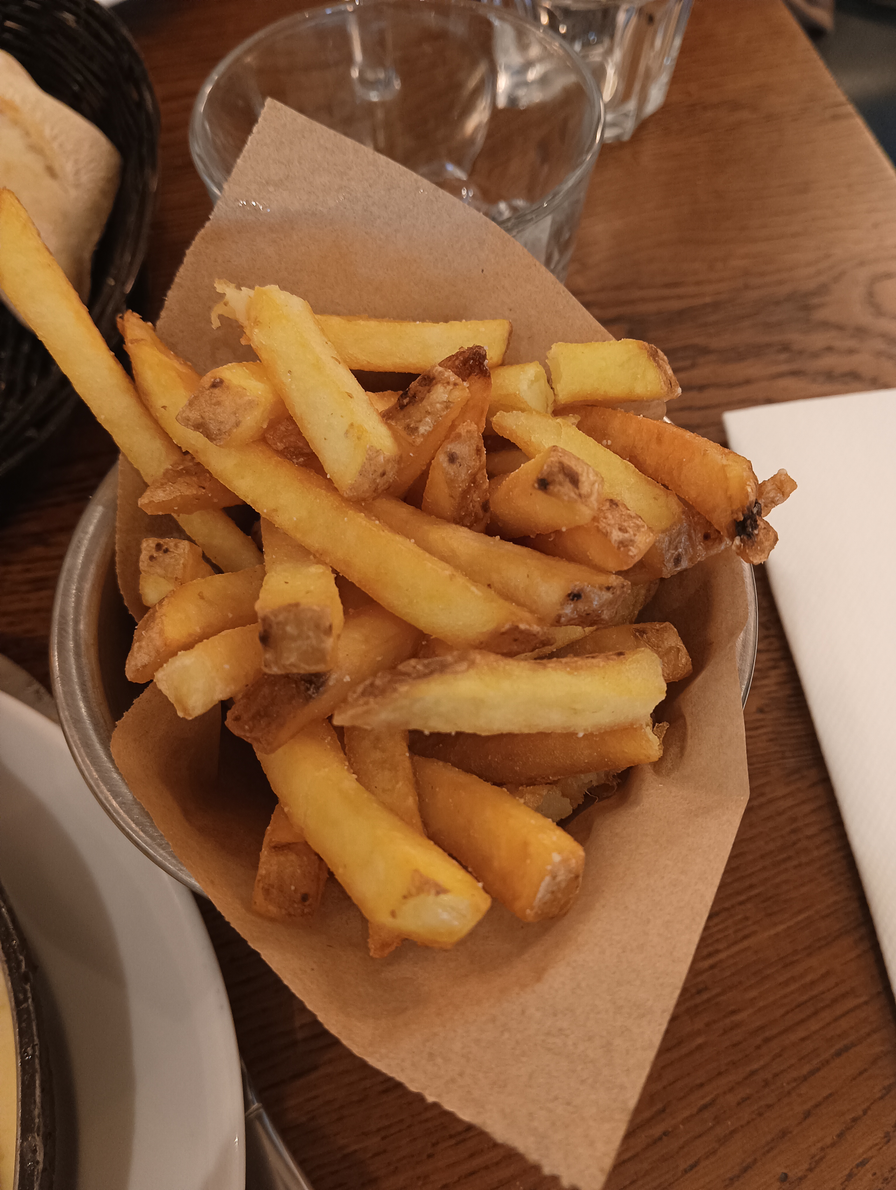 Moules marinières très bonnes, par contre frites peu goûteuses car tièdes, dommage. Excellent service