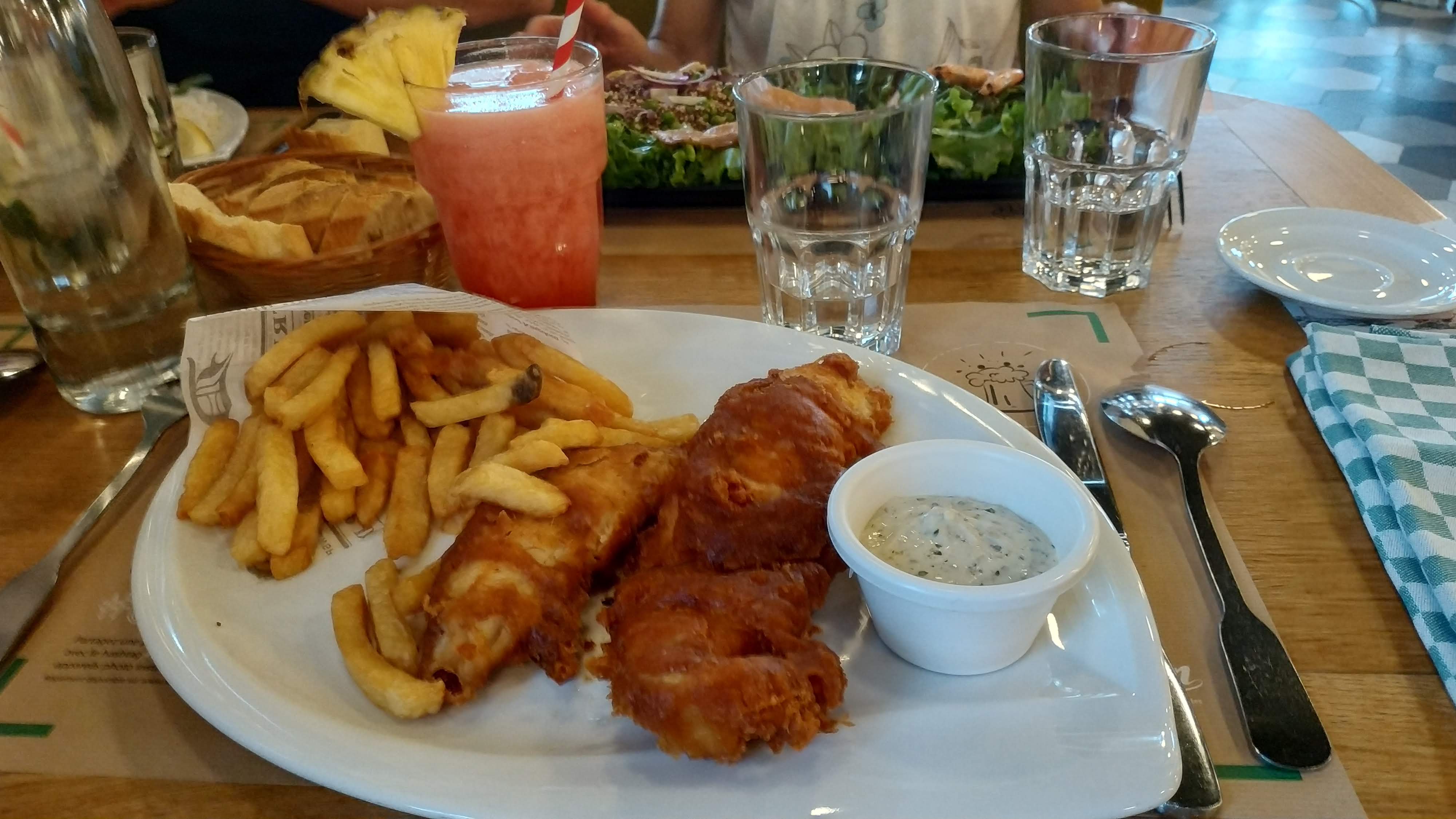 Très en colère. Mon mari a pris un fish and frites maison et oh surprise le 1er beignet est remplit d'arêtes, j'en fait part à la serveuse qui fort désolée me dit d'essayer le 2 ème beignets même chose et me dit qu'elle en fait part au chef. Elle repasse me demander si j'en veux un autre sur la proposition de son responsable mais nous lui répondons non. Au moment de régler l'addition j'avertis le responsable qui me répond que c'était normal et que le poisson était cuit avec les arêtes. Drôle de réponse.....et me demande même si on avait déjà mangé des fish and ships !!! Je me permets d'attirer l'attention auprès des clients qui pourraient se blesser avec ces arrêtes cachées dans la panure puisque cela parait normal aux yeux du responsable.