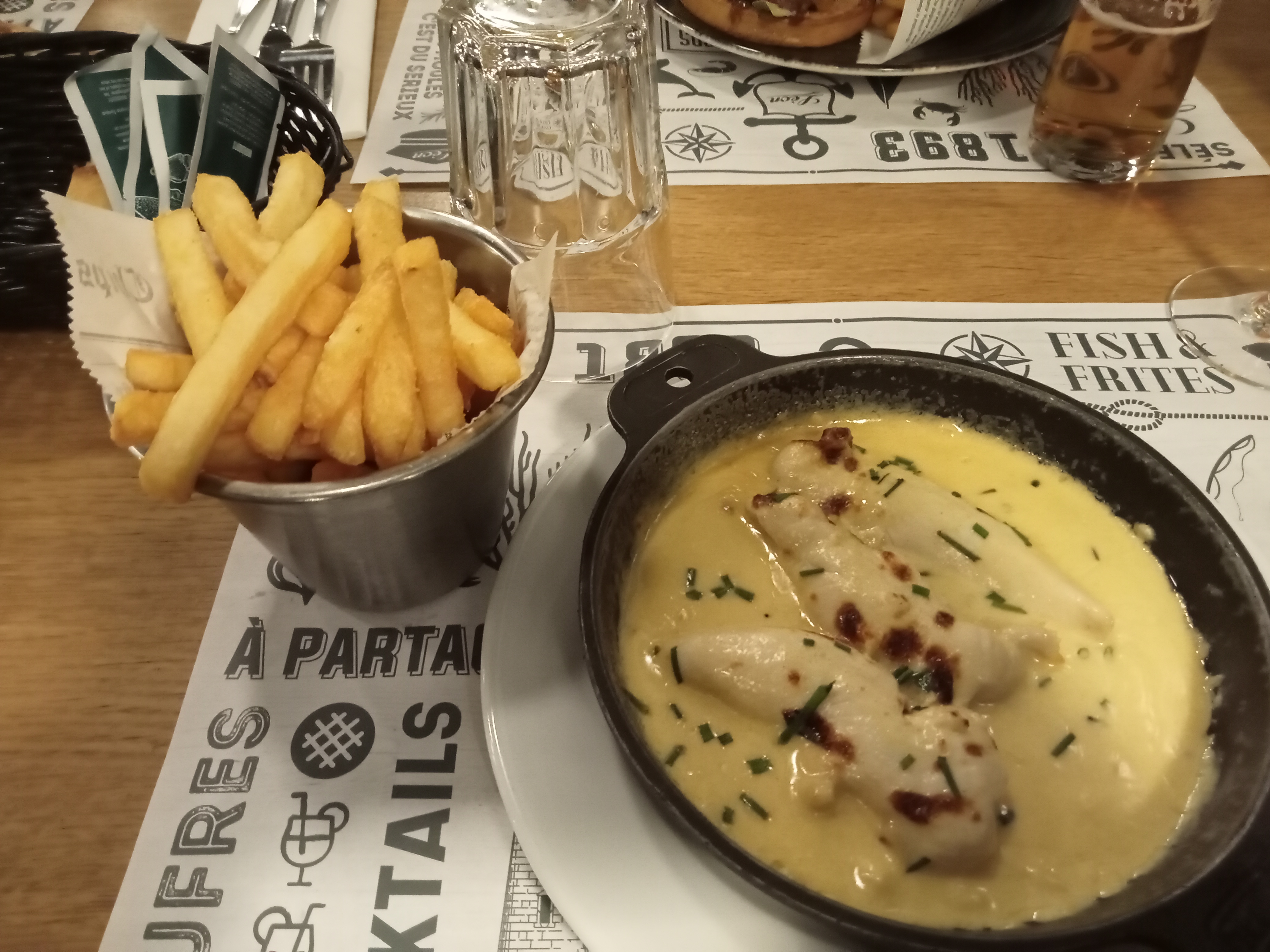 Soirée passée hier soir en amoureux, nous commandons le fish and frites et la quelle ne fut pas ma surprise de trouver plusieurs grosses arrête dans mon plat. En soit, ce n'est pas cela qui nous a le plus dérangé mais la réponse du responsable qui nous a simplement dit que c'était du poisson et qu'il fallait s'y attendre !!! Vous pourriez quand même prêter attention à la qualité de vos produits, surtout si vous servez du poisson, c'est quand même la spécialité... Bref décevant