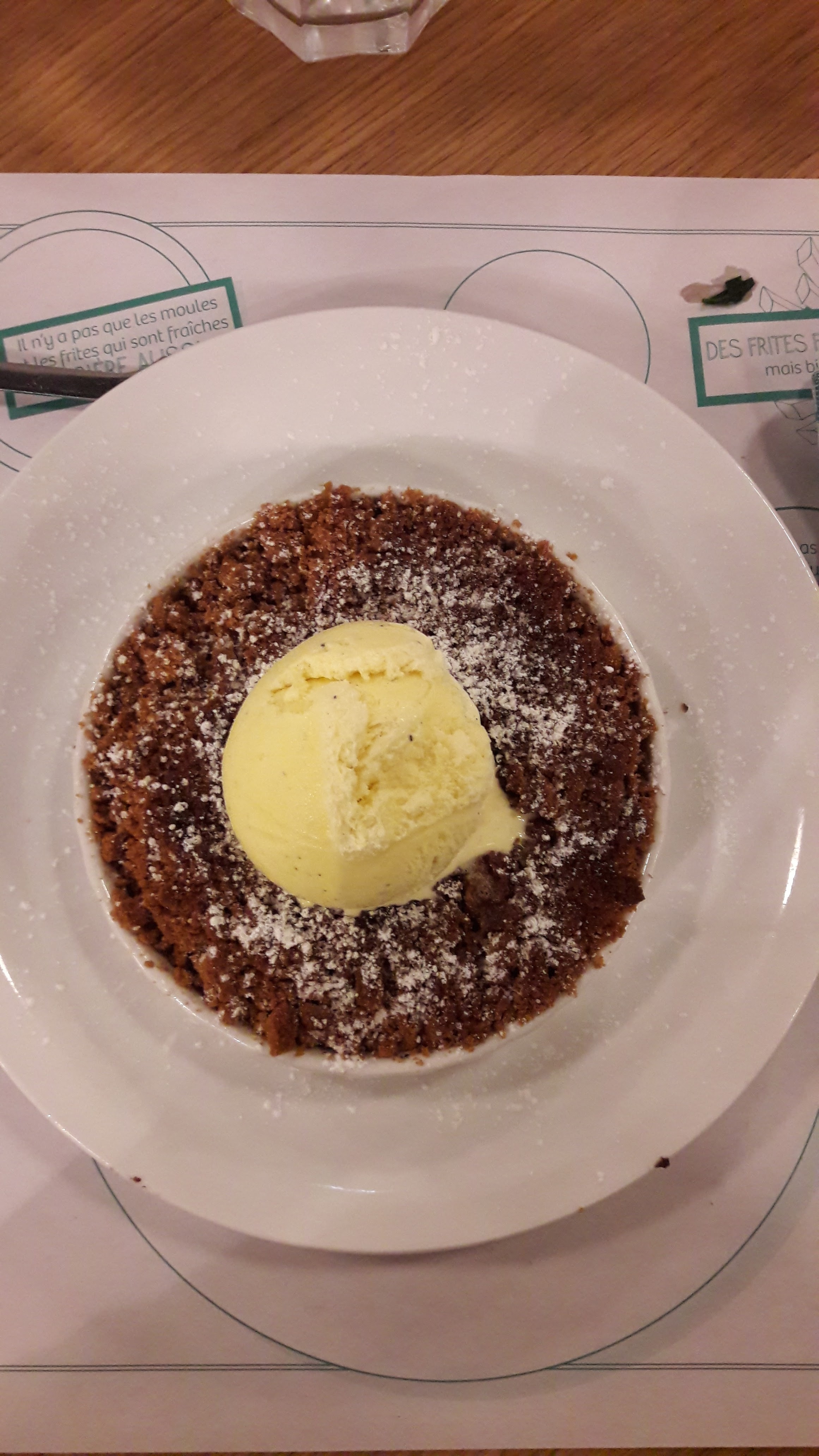 Les plats sont arrivés chaud et servi avec le sourire. Nous avons commandé des moules et nous les avons trouvé très bonne les frites sont excellentes. Le Café gourmand accompagné d'un fond au chocolat savoureux et crème brûlée excellente. Nous avons déjeuné en 1heure ce qui est rare vu le monde présent en salle. Je recommande ce restaurant.