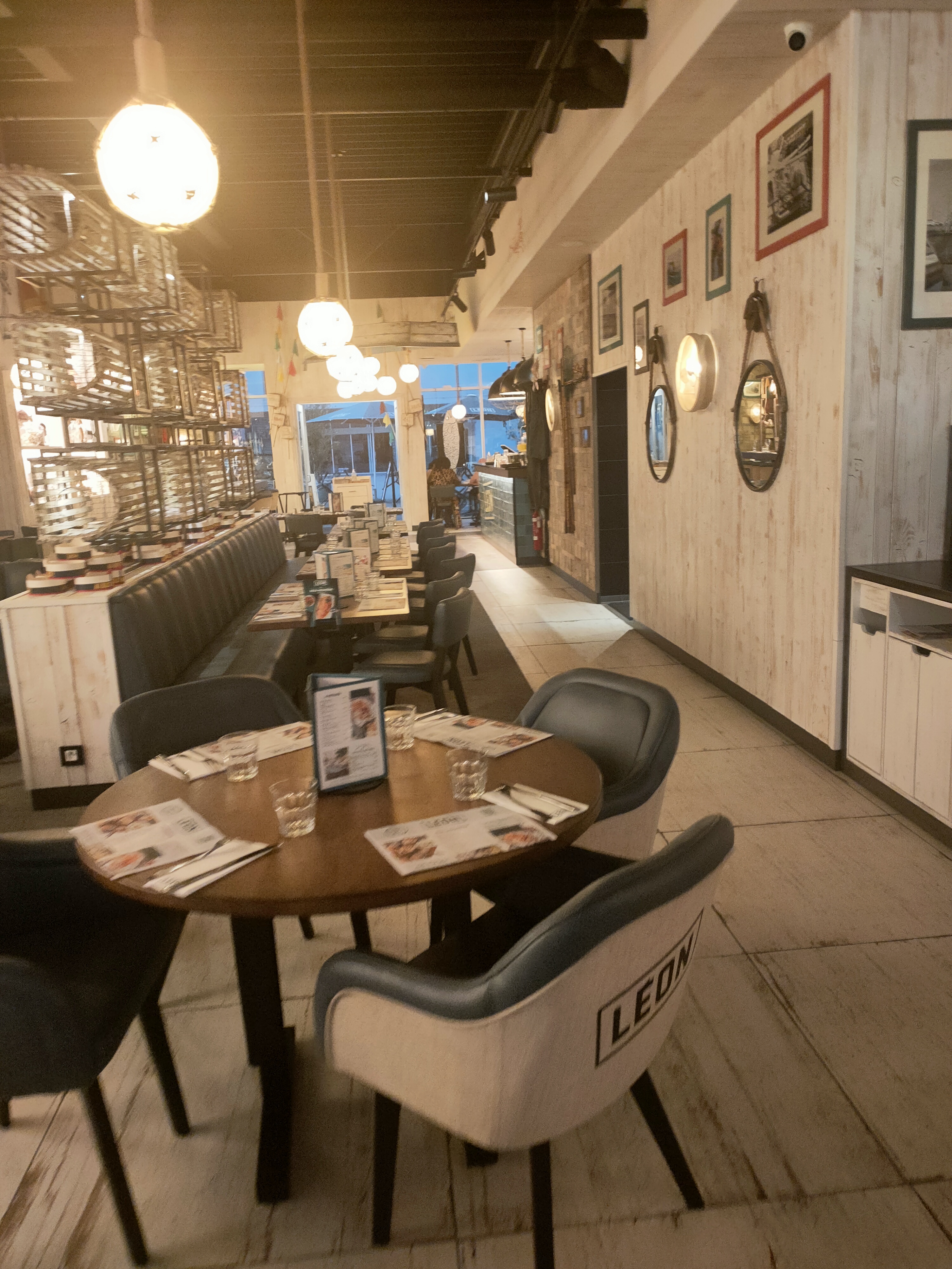 Très beau restaurant Leon. La décoration est très belle. C'est un des plus jolies Leon de la région. Les plats sont bons et correctes. Il faut juste que les frites soient faites maison et ça sera top. Le burger est très bon et les plats de mer ( moules...) sont excellents.