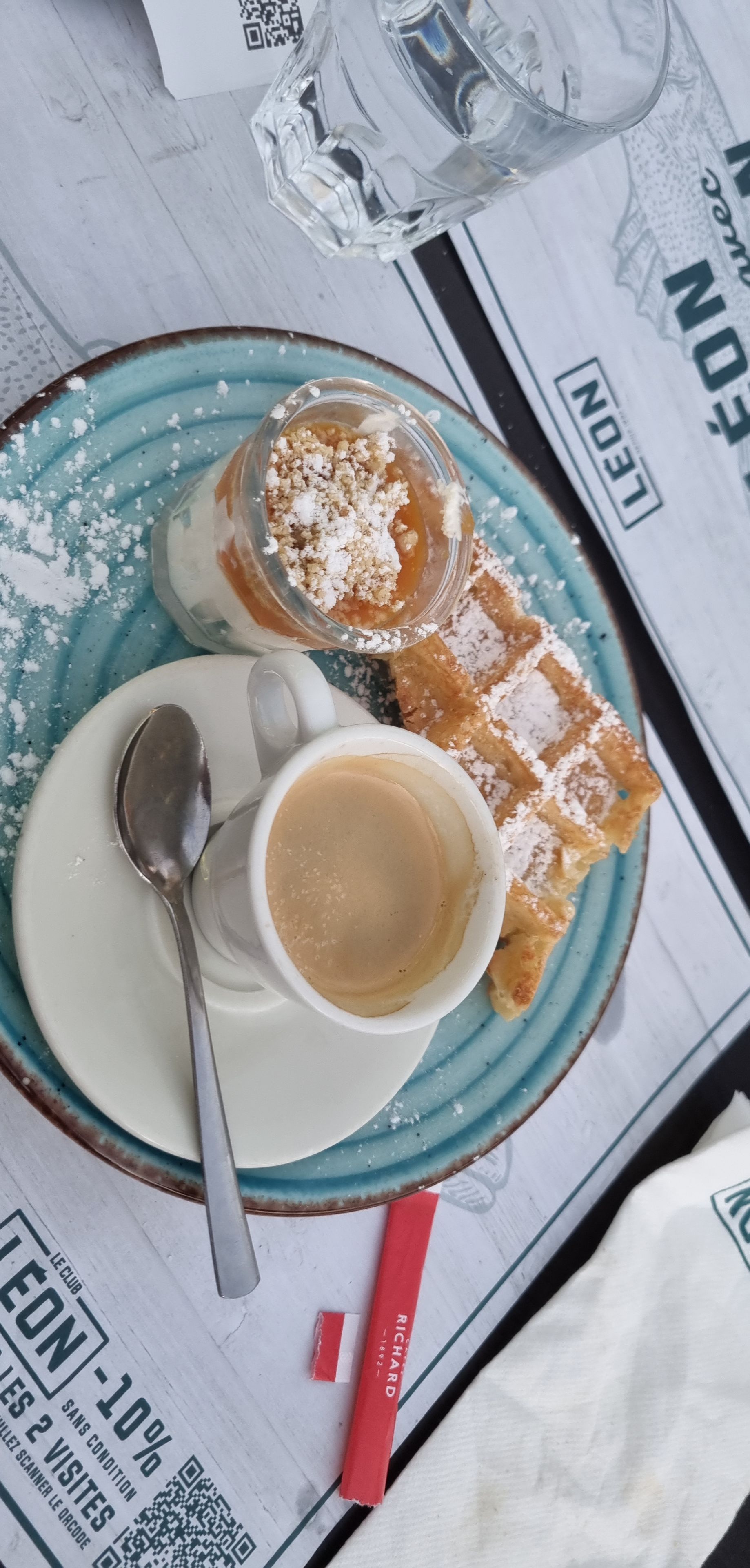 Il y a longtemps que je n'avais mangé à Léon. Les moules étaient très bonnes, mais plus pareil qu'avant le Covid. Et par contre, moi qui mange toujours ma petite gaufre à la fin du repas, j'ai été déçue que ma gaufre n avait aucun goût, toujours croustillante, et heureusement qu il y avait le sucre glace. On aurait une gaufre à l eau . Pâte fade. Ni sucrée, ni faite avec un ingrédient pour la mettre en valeur comme avant. Donc bien servie mais mitigé sur la touche finale. Je recommande quand même 😃