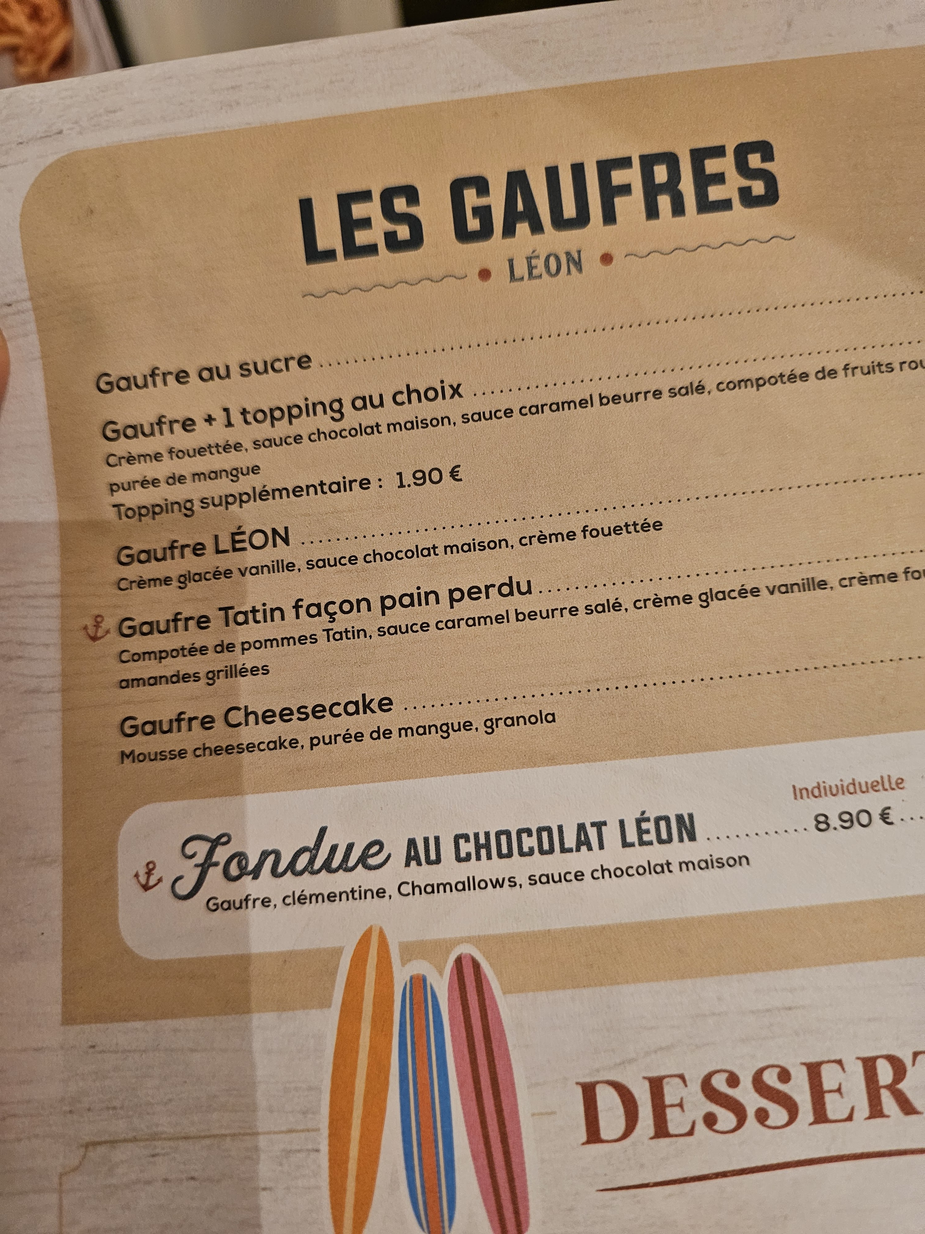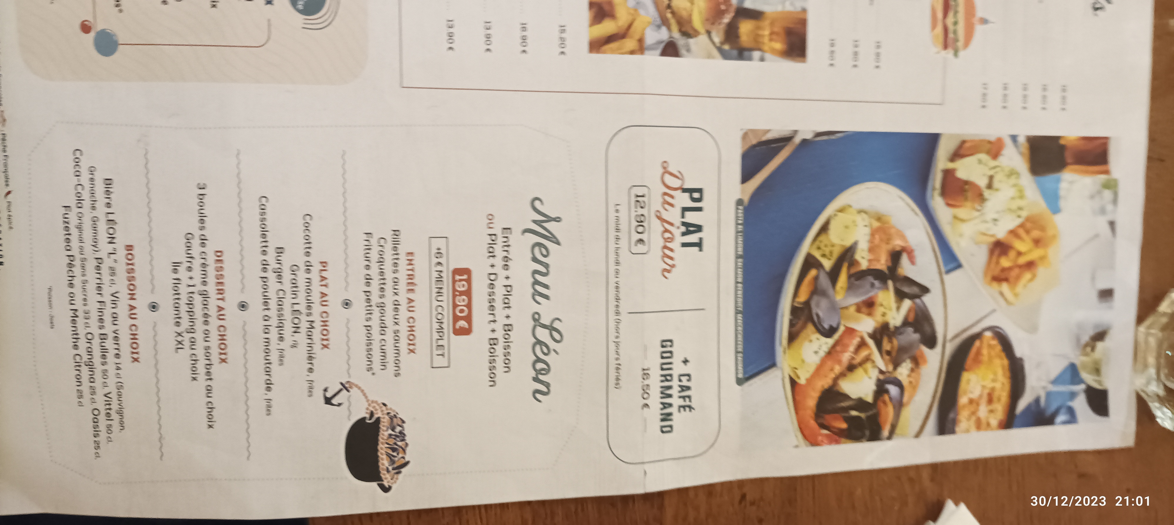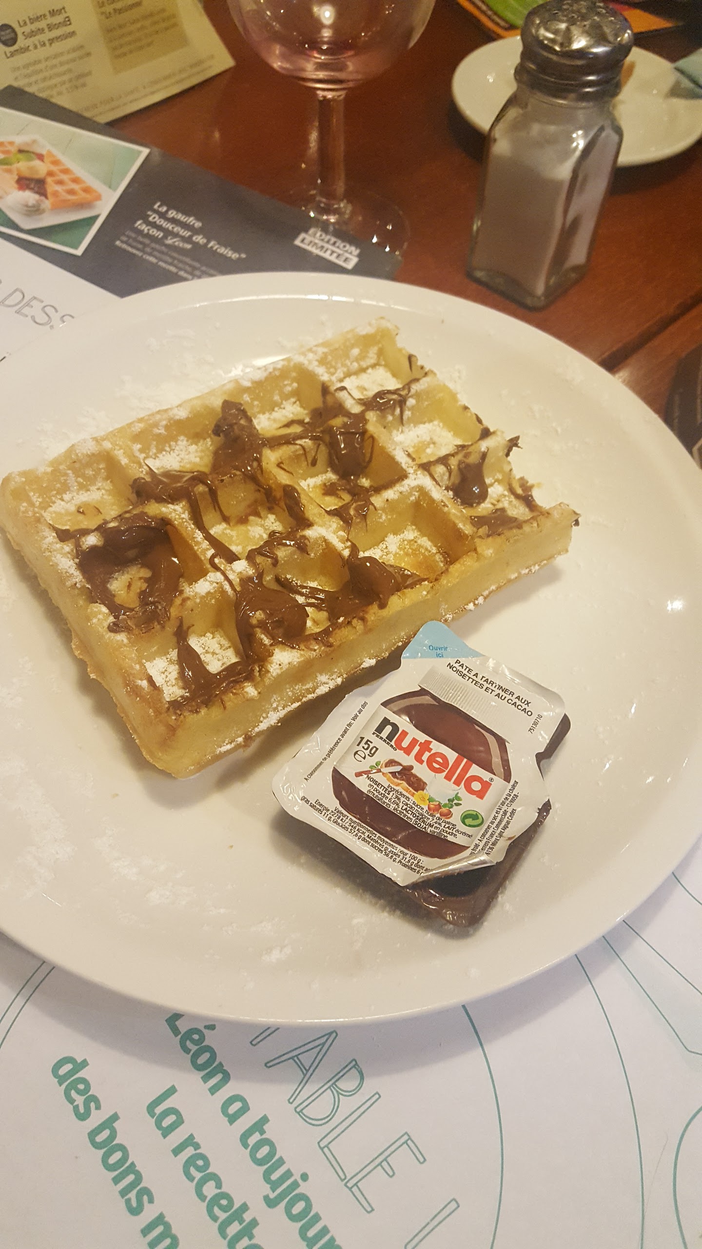 On a pris la Paella, c’était très juste côté quantité (tapisser l’assiette de riz et 10 moules et 3 crevettes c’est pas une paella), le service vraiment bof: la mayonnaise qui arrive après réclamation quand le plat est froid; la gaufre enfant avec du faux Nutella qui reste compact comme du beurre… Mauvais plan ce LEON !