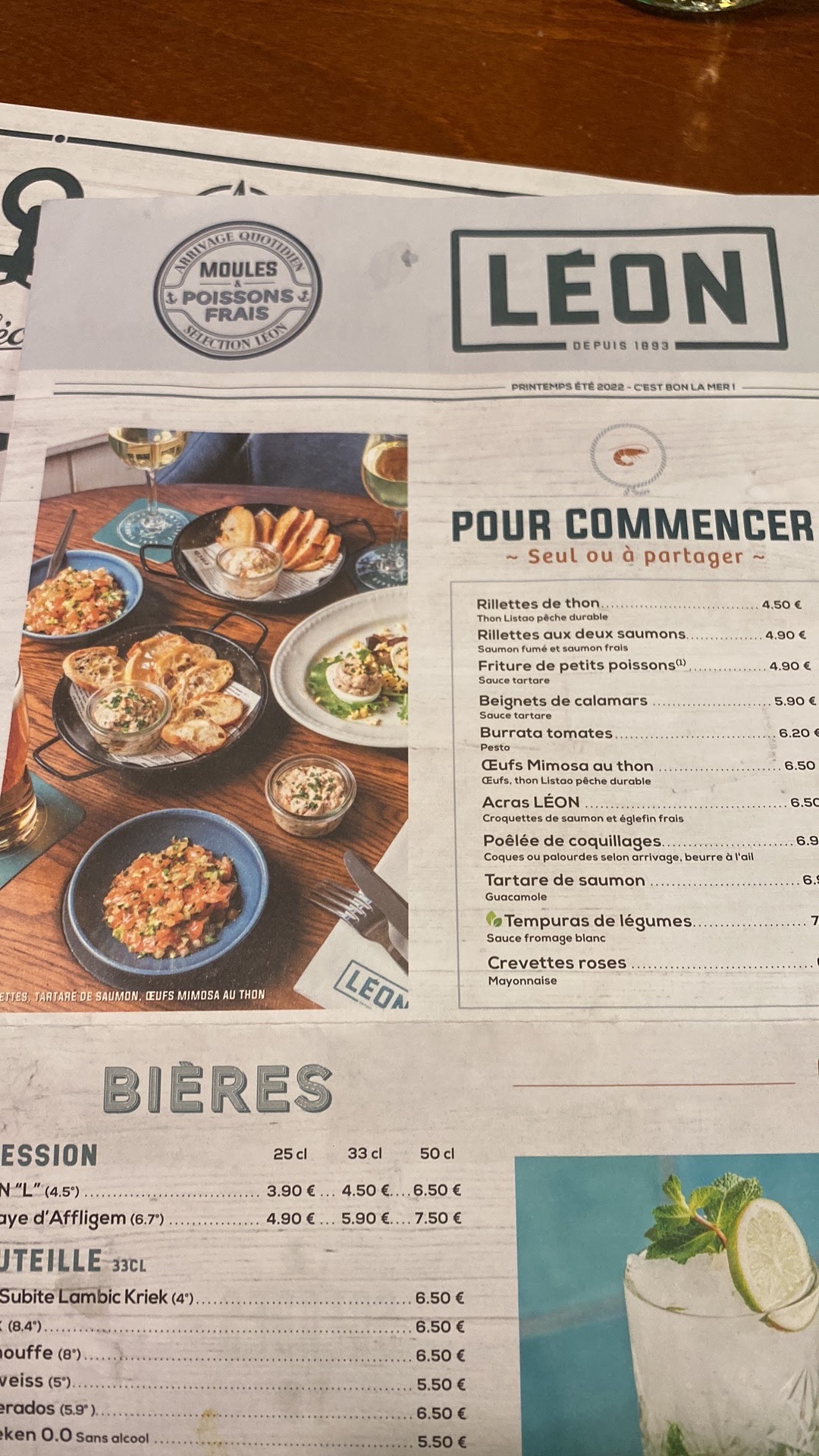 Lorsque j’ai vu la nouvelle carte je pensais me régaler…. Nouvelle déco … pas d’intimité, j’ai su que ma voisine de table avait des problèmes de santé … L apéritif, leon mule pour mon époux , à 8€50 ça fait cher la glace pilée 🫤. Le mien était correct un cocktail passion . L assiette à partager était sympa. Les plats le mien a peu près correct, je ne pense pas que les crevettes soient fraîches mais plutôt congelées 🤔. Mon mari prend un fish and chips, dans le plat il y a du papier imitation journal qui se désagrège et qui colle sur le poisson . Nous prenons du vin blanc en pichet qui était chaud , on nous le change et le nouveau est quasi pareil . On nous dit que les frigos fonctionnent 😂🤔. Pas de pain , pas d’eau …. Bon bien Léon , c’est terminé!!!