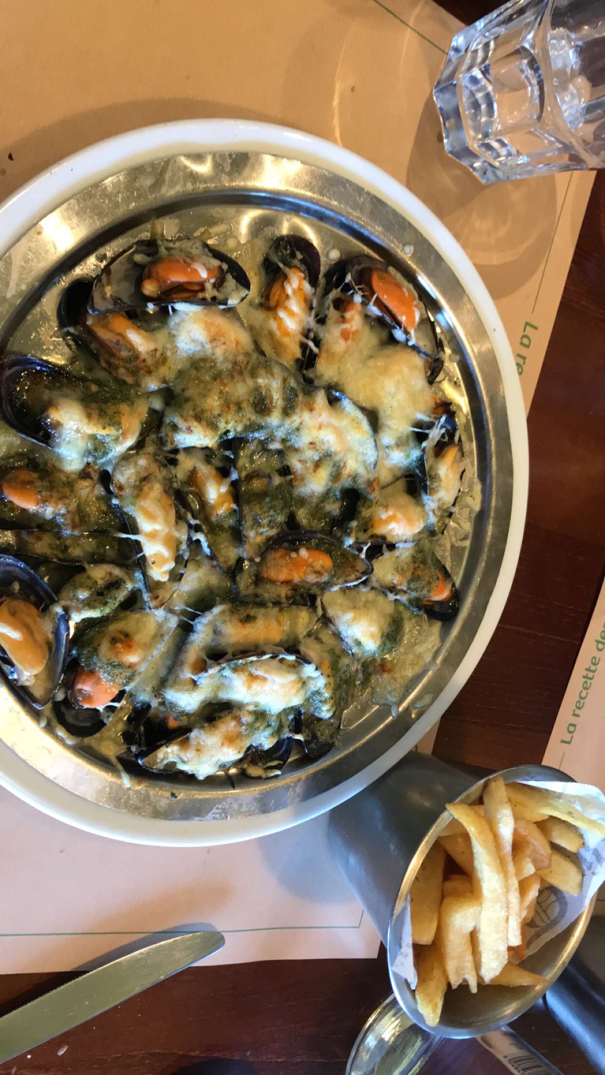 Repas à deux : moules marinières + frites, servies chaudes et excellentes le tout accompagné d'un petit vin blanc. Il y avait bien sur d'autres choix comme moules au curry, au roquefort, aux lardons ect Le service a été impeccable, pas d'attente, et avec le sourire ce qui n'est pas toujours le cas dans les restaurants. La réservation est conseillée.