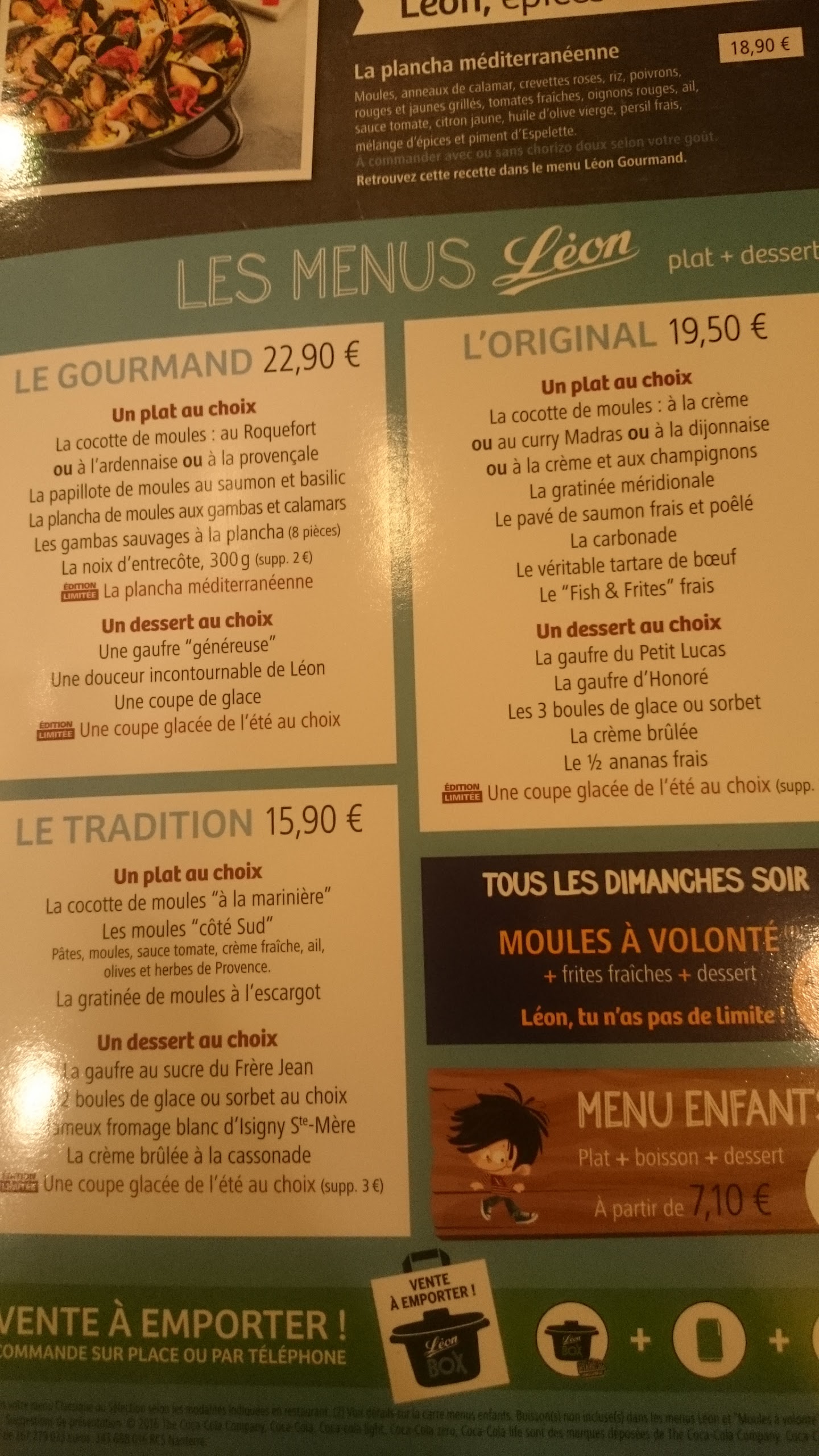 Ou est passé la qualité ? Nous aimions beaucoup venir manger des moules frites chez Léon et bien on ne reviendra plus... La qualité n'est plus au rdv. Les moules n'avaient aucun goût. La sauce ^Leon^ n'avait même pas le goût de la crème... On a plus le droit au rince doigt non plus? Et je parle même pas des gaufres en dessert horrible on les a pas fini...et pour le prix vraiment déçu...