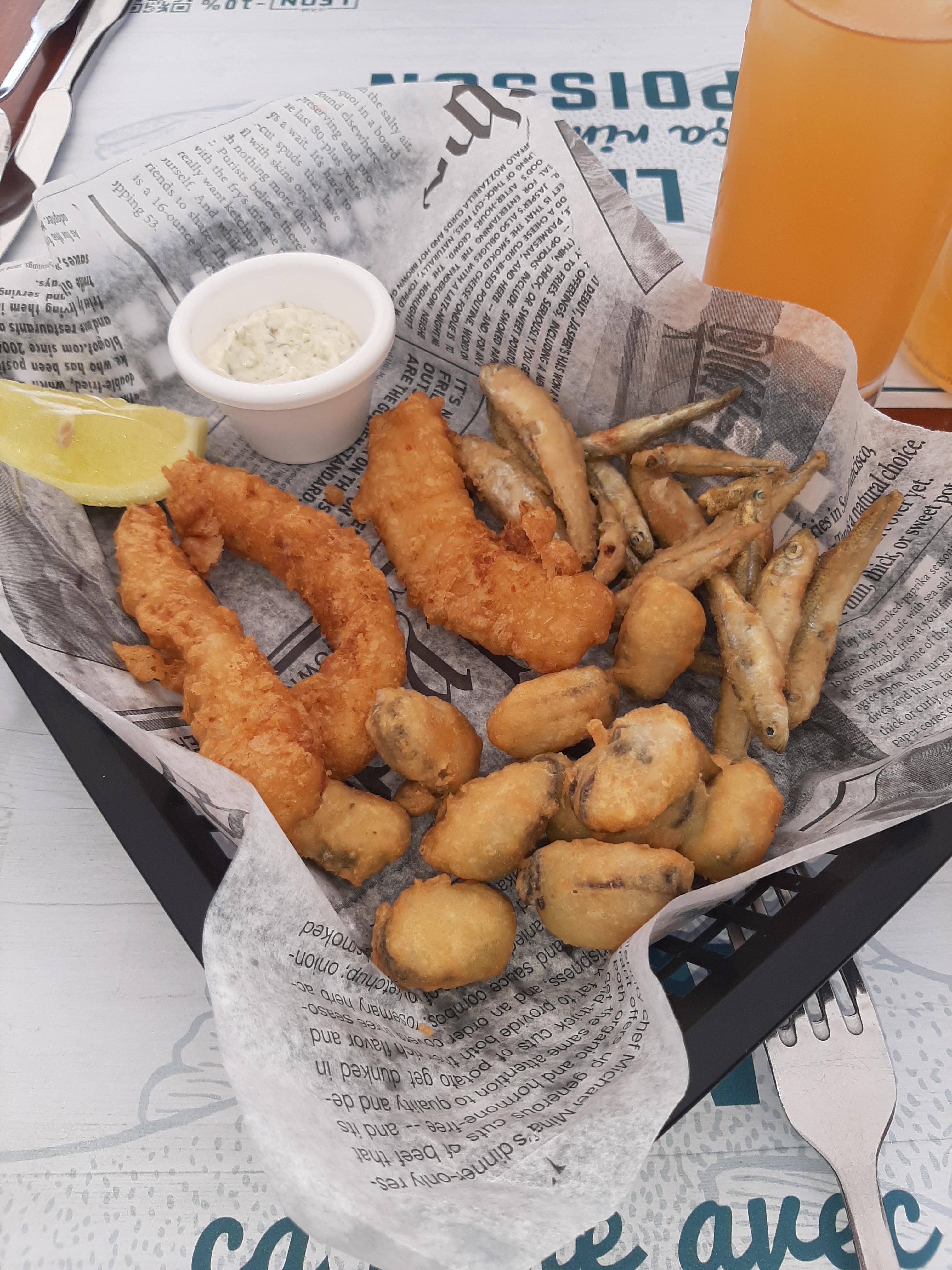 Les entrées était plutôt bonne Par contre le plat était vraiment horrible, j’ai commandé un fish and chips et pour vous dire j’ai l’habitude d’en manger dans les restaurants mais là il était blindé d’arête je peux comprendre que ça reste du poisson et qu’il peut en avoir une par-ci par-là mais là c’était trop ça on devenait limite dangereux. J’ai même pas pu finir par peur dans avaler .. et honnêtement, j’ai pas que ça affaires de dépiauter, mon poisson alors que c’est un fish and chips ..