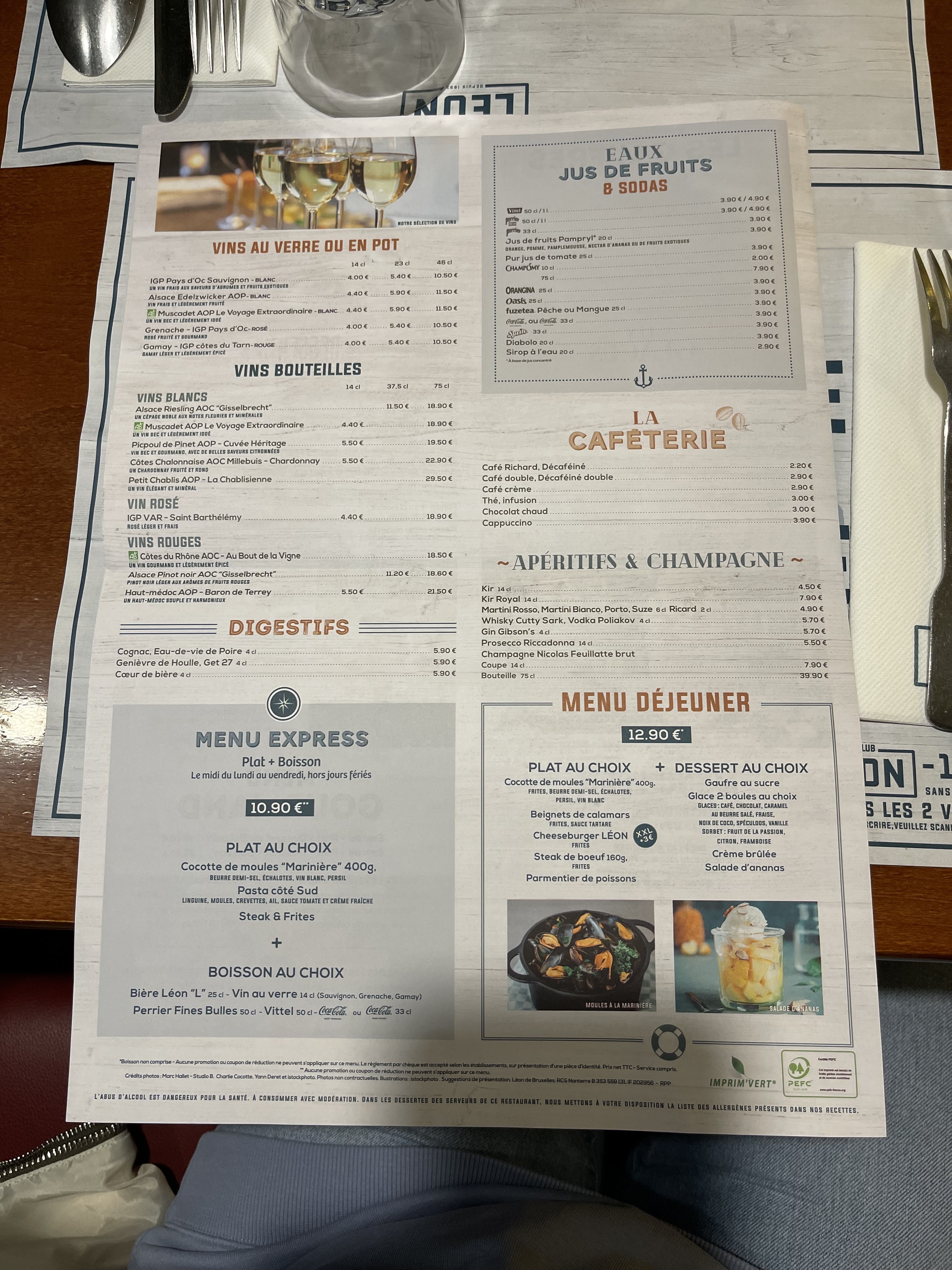 Cuisine pas terrible. Apéritif servi en même temps que les plats. Burger servi froid. Obligé de demander à réchauffer le plat. Quantité de moule largement réduit par rapport à avant très chère par rapport au tarif. Avant On demandais toujours au client si il voulait une seconde portion de frite il semble que ce temps soit belle et bien terminé... Merci au responsable de nous avoir tout de même fait une petite réduction au moment de l'addition. Nous ne reviendrons pas tout de suite chez Léon...