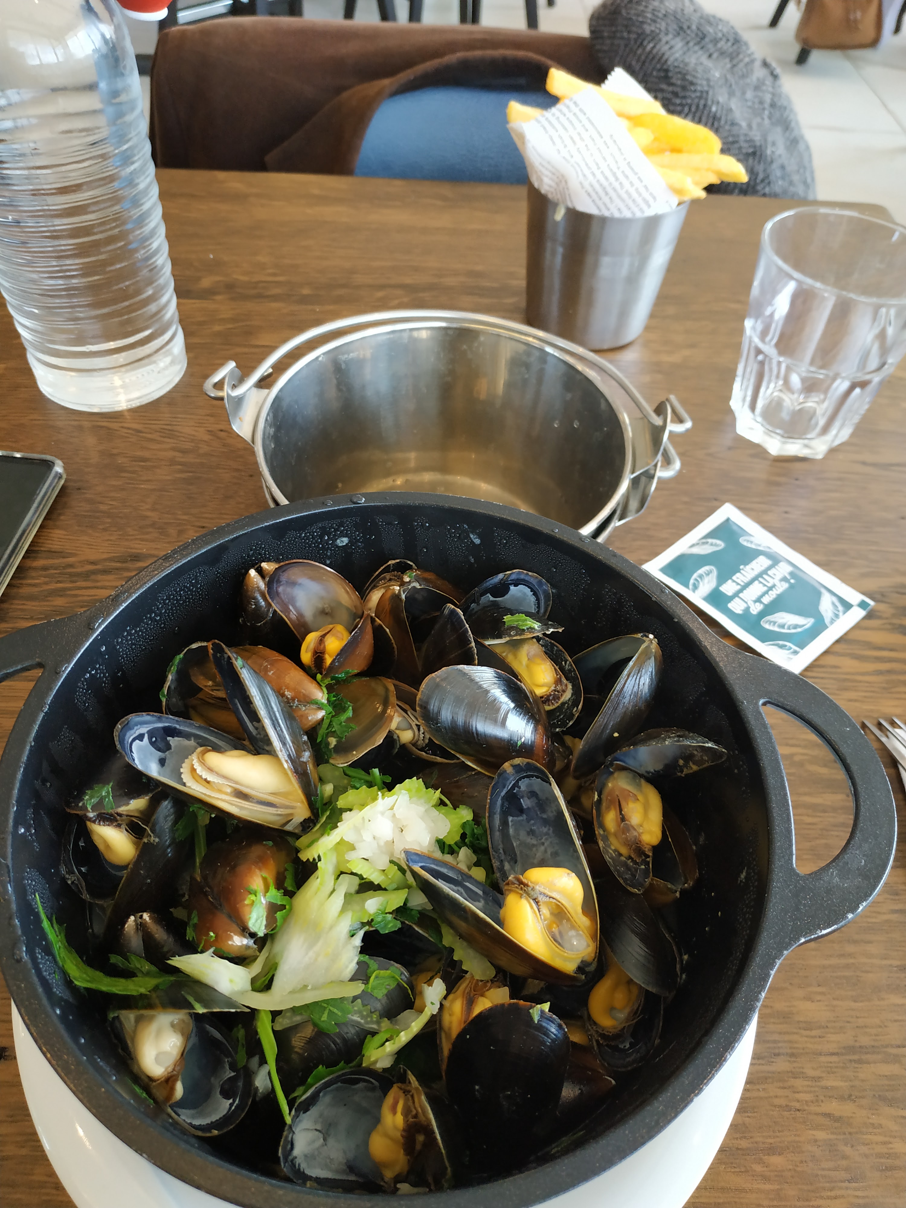 Commande moules marinière , trouvé baignant dans le plat une moitié de moule remplie de boue noire et nauséabonde .le responsable à généreusement offert une ristourne de 5% sur la note 😕😕