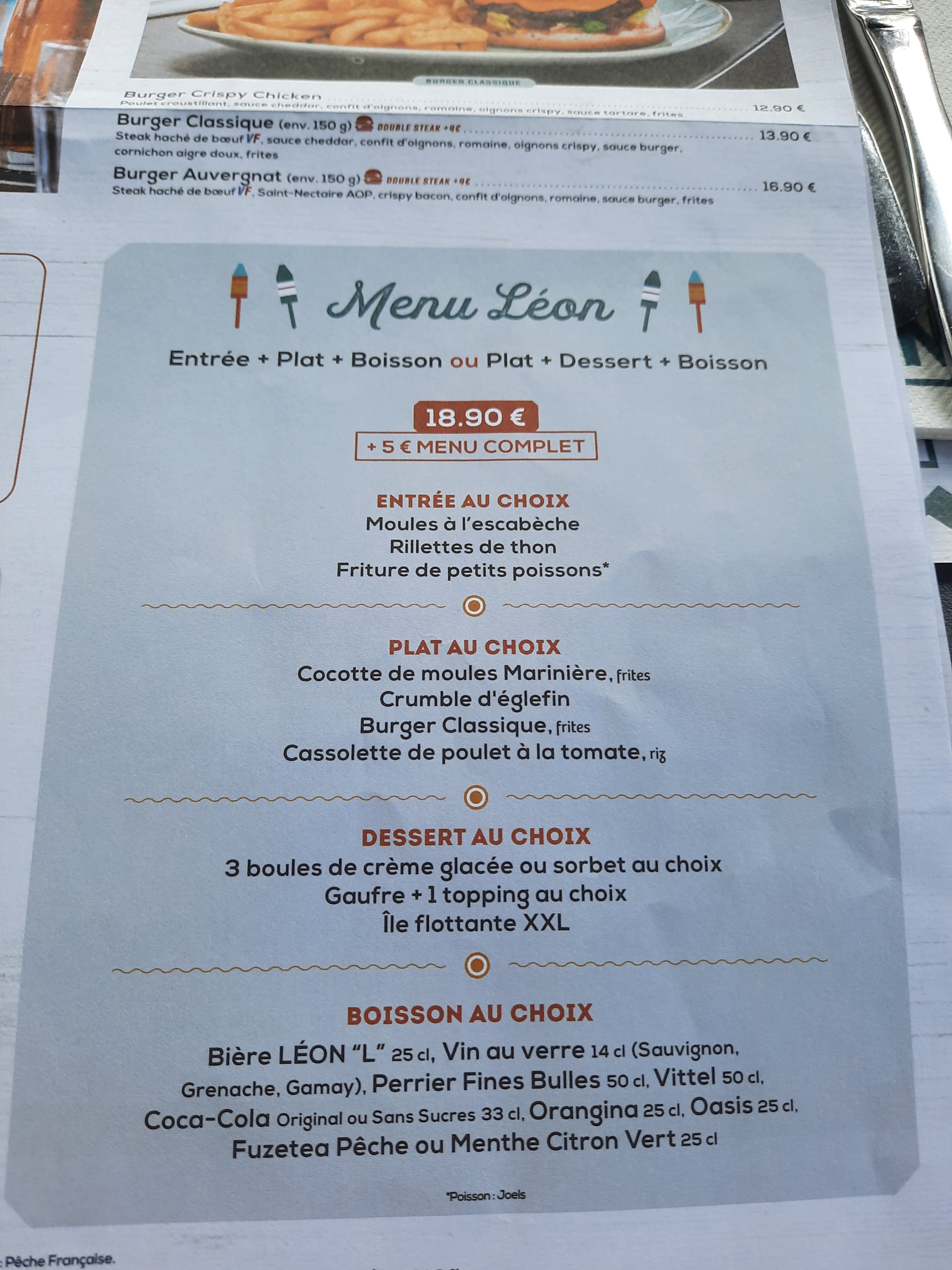 Venu le 9/08/2022 avis : Pour l'accueil et le service du restaurant, je mettrais 5 étoiles sans hésiter le personnel est vraiment très très agréable. 👍👍👍👍 Concernant, la cuisine j'ai pris une cocotte moules marinière fût un temps chez Léon les moules était bien plus charnu et l'on mangeait très bien, il y avait beaucoup de moules toutes petites 😔. Les frites à volonté sont vraiment cool !!! 😁 Cependant, le plus gros problème vient de la PROPRETÉ du restaurant ⚠️ au toilettes qui était pas très propre lors de mon passage pourtant venu en début de service, ⚠️ également les pieds de table qui colle au chaussures et vraiment ⚠️⚠️⚠️⚠️ aux couverts qui sont mal nettoyés donné des cuillères censé être lavé qui contienne encore des herbes collé c'est limite, des erreurs de nettoyage peuvent arrivé mais le serveur aurait dû regarder avant de la donner. Pour l'ensemble je met 3/5 étoiles. 😀
