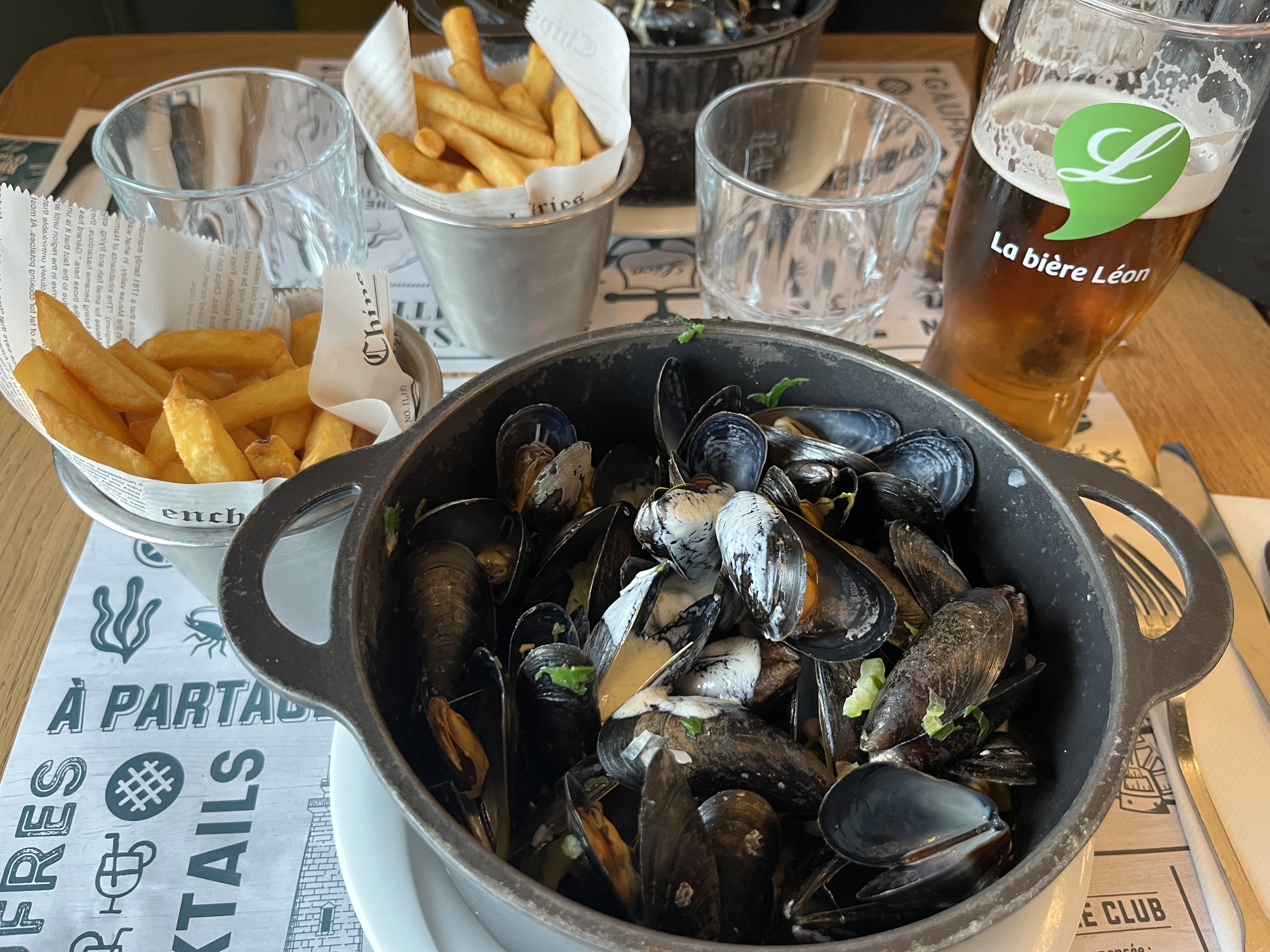 Je suis allée manger dans ce restaurant, aujourd'hui à 12 h 00 en famille. J'étais avec mon conjoint et mon fils ( il est bébé). Nous avons commandé pour ma part, des croquettes aux légumes en entrée, des moules au curry format XXL, avec frites en plat , et en dessert , une coupe Bounty. J'avais pris deux cocktails sans alcool, un exotico et un diabolo fraise. Pour mon conjoint, ça été des moules normandes avec frites en plat, et en dessert gaufre Léon, avec un coca cola zéro en boisson. La serveuse, une jeune brune à lunettes en formation, était professionnelle , très souriante et sympathique. Nous avons été très satisfait du service. Le coût plutôt abordable.