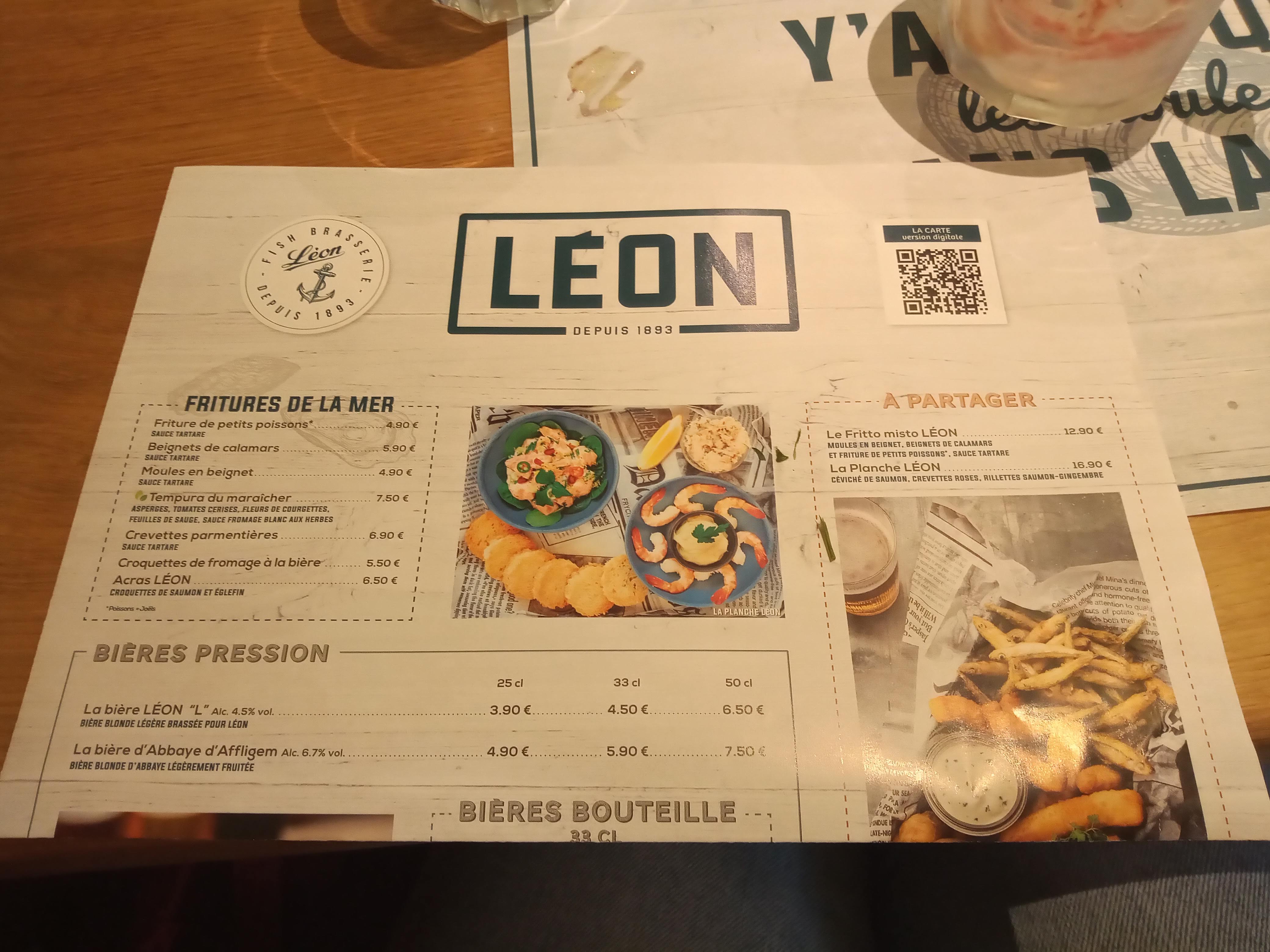 encore decus, nous avions stopper nos visites, puis la, l'envie de de retenter, leon, avec l'apero (qui est bof) nous prenons une friture de petits poissons, meme pas tiede, ils étaient secs, on aurait dit que c'etait un reste de la veille, puis suivent 2 soles meuniere a 26,90€ quand meme, nous ne sommes pas en bord de plage, loin de la, car la vue sur des immeubles industriels n'est pas top, une sole meunière servie avec un simple ramequin de ratatouille (industrielle) et pas un petit ramequin de riz ... franchement , au prix du riz?? manque de diversité sur la carte, pas grand choix, ou est le temps ou nous avions des gambas grillées .... de plus, la serveuse se trompe , elle nous ramene deux verres de vin blancs, ce n'est pas ce que l'on a commandé, retour cuisine, elle revient avec une bouteille de vin blanc mais ce n'est pas celui que nous avions choisi, pitié pour la serveuse, on garde la bouteille de vin qu'elle penne a déboucher, mais, la aussi , on ne nous ramene pas un sceau de glaçon pour garder le vin au frais, forcement au bout d'une demi heure il est a temperature ambiante. de plus, j'avoue que les marmites de moules sont petites, un couple a coté de nous, bien oui , forcement, comme il n'y a pas beaucoup de monde, on tasse tout le monde dans le meme coin, tant qu'a faire!!! le monsieur a coté de moi a fini la corbeille de pain en trempant le pain dans le jus de moule.... je vais souvent a frejus l'ete, les moules sont a 13€50 A VOLONTE... il y a qq annees il y avait du monde chez LEON, dans qq années il n'y aura plus de LEON.... IL FAUT TOUT REVOIR;;;;