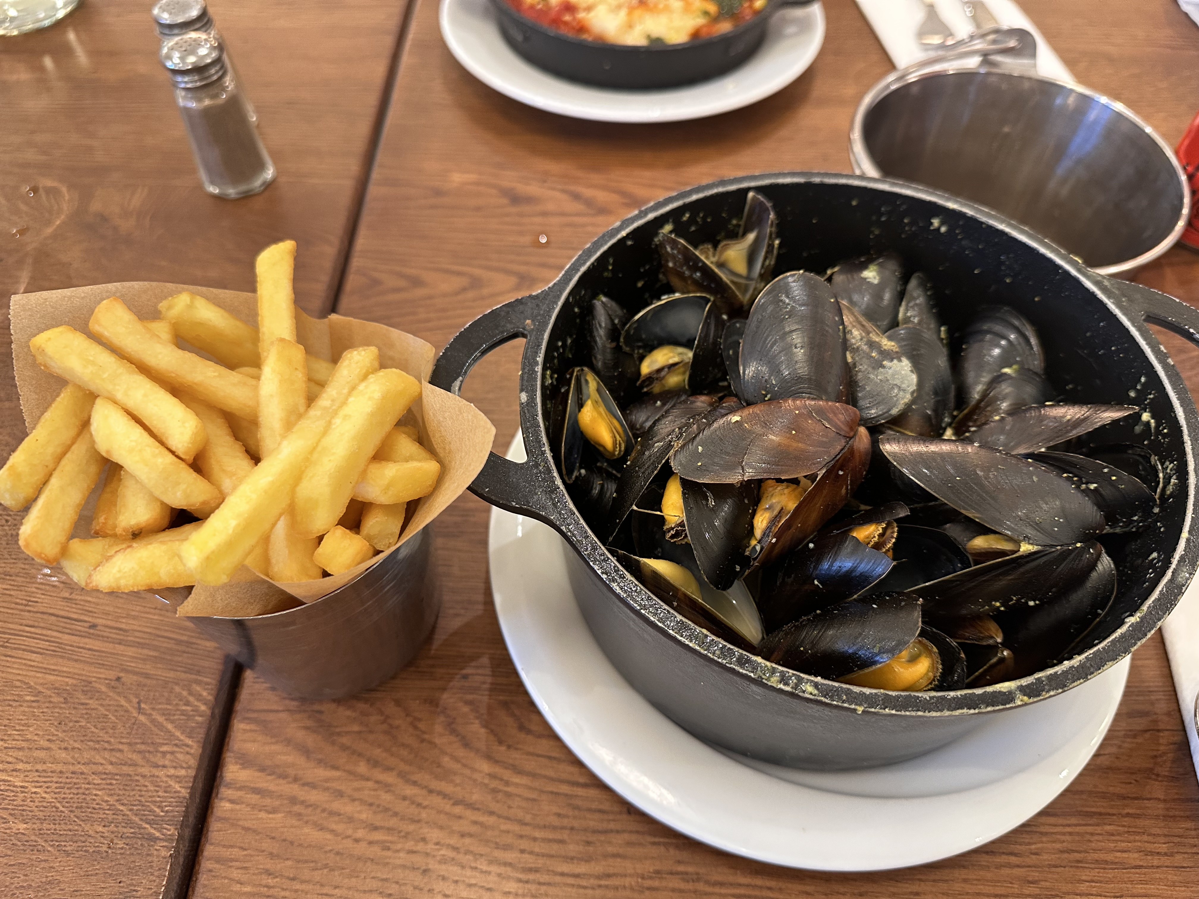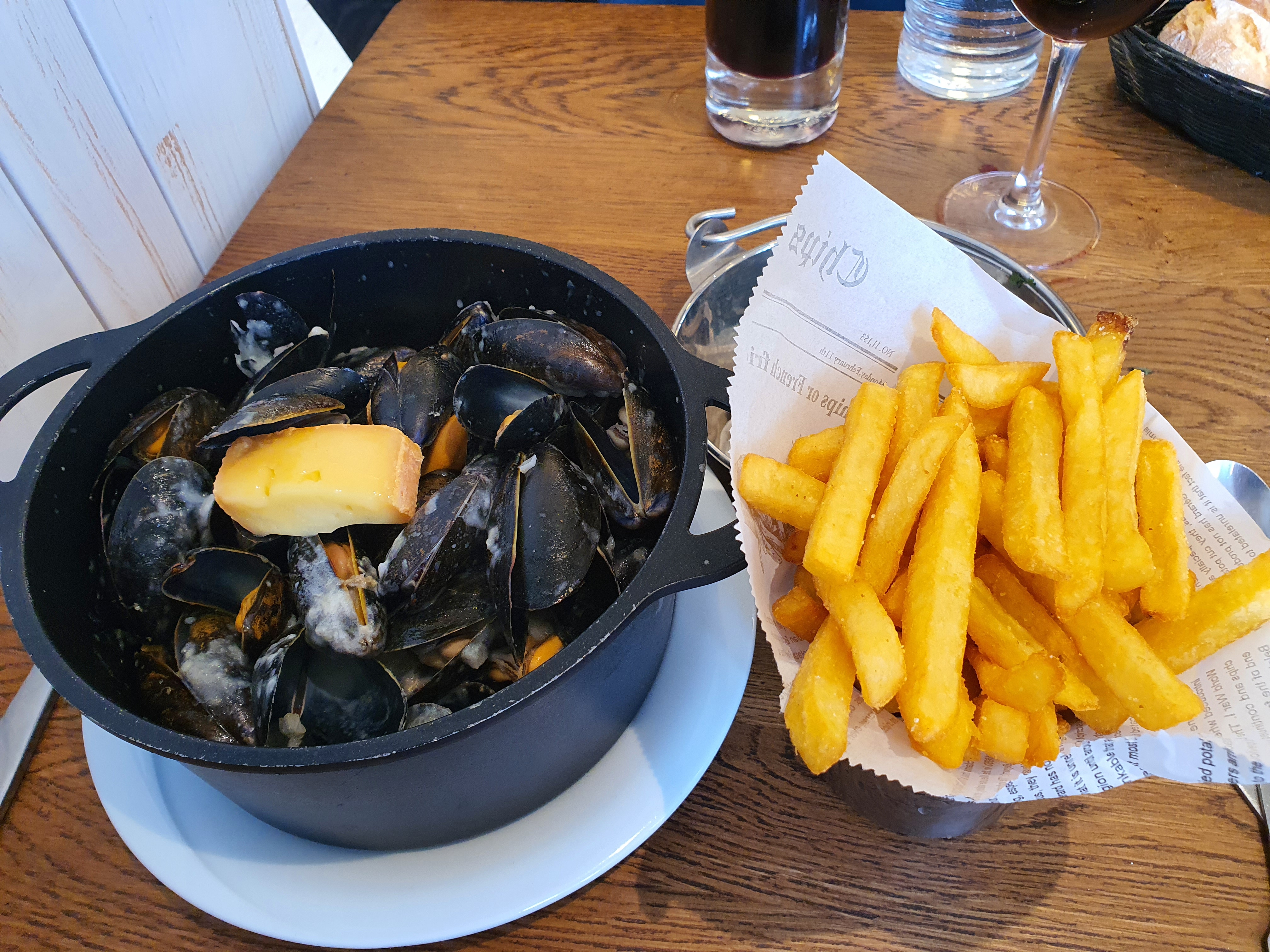 Pas trop de monde et en fin de service. On a commandé hors menu. Les poissons frites ( un régal) et bien entendu mules marinières (classique) et roquefort. La cuisine c’est mêlé les pinceaux et après demander confirmation au serveur sur le goût d’un des cocotes. j’ai dû obliger le serveur de goûter pour lui confirmer que c’était pas mules marinière sinon curry ce qu’il m’avait servi, car il affirmait le contraire et pas fácil de le faire comprendre sans lui faire goûter car y’avait déjà fait sentir et il conformai marinière. Il s’ai défait en excuses et il m’a confirmé l’erreur. 15 min après j’avais mon plat de mules. Au top