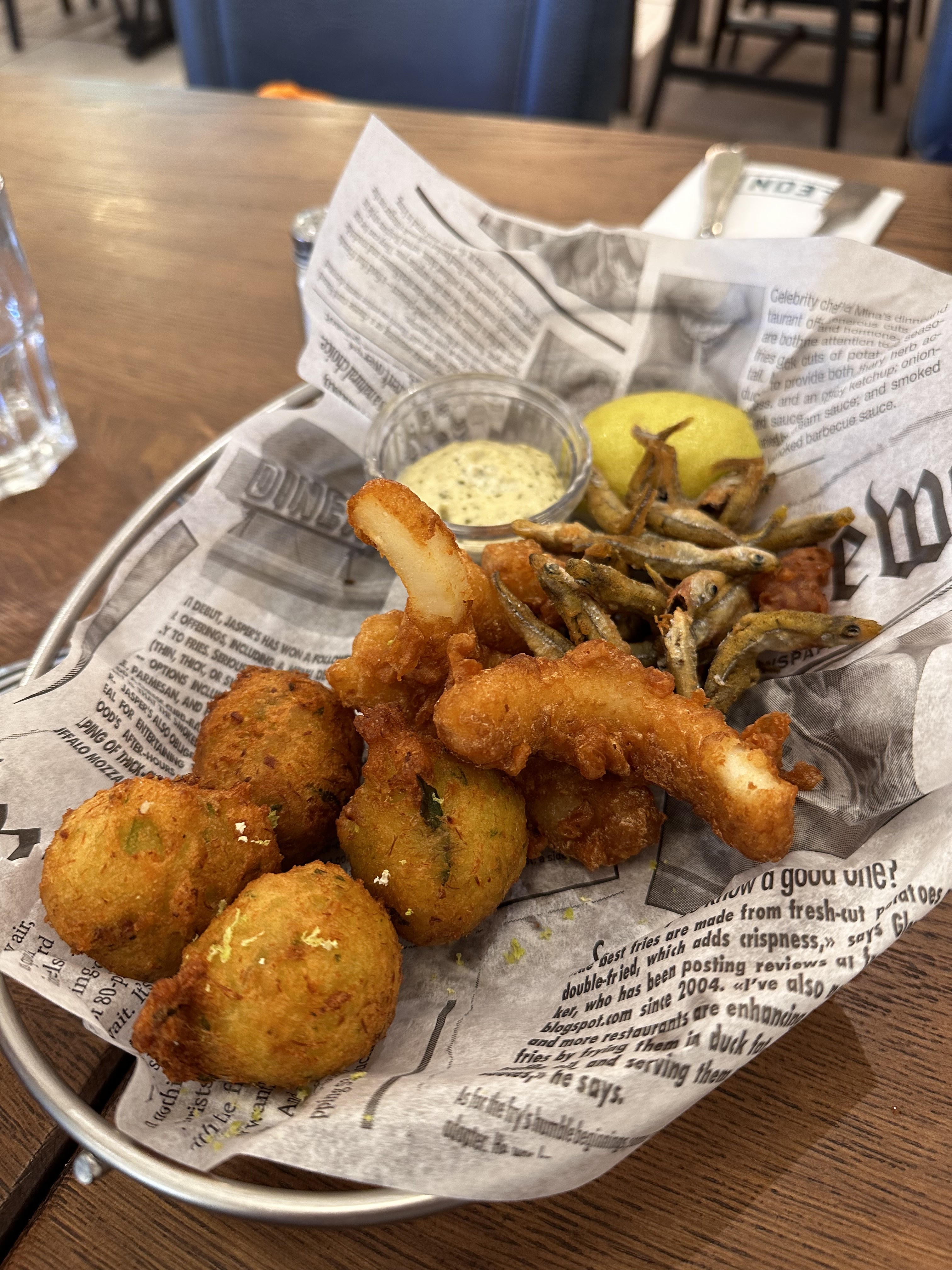Je retire surtout des points pour le mauvais accueil du gros monsieur chauve à l’entrée pour préciser . Le serveur était très agréable et la nourriture était moyenne: le burger crevettes était assez bien, les frites étaient vraiment mauvaises donc à éviter et les rings de calamar étaient bof et en toute petite quantité.