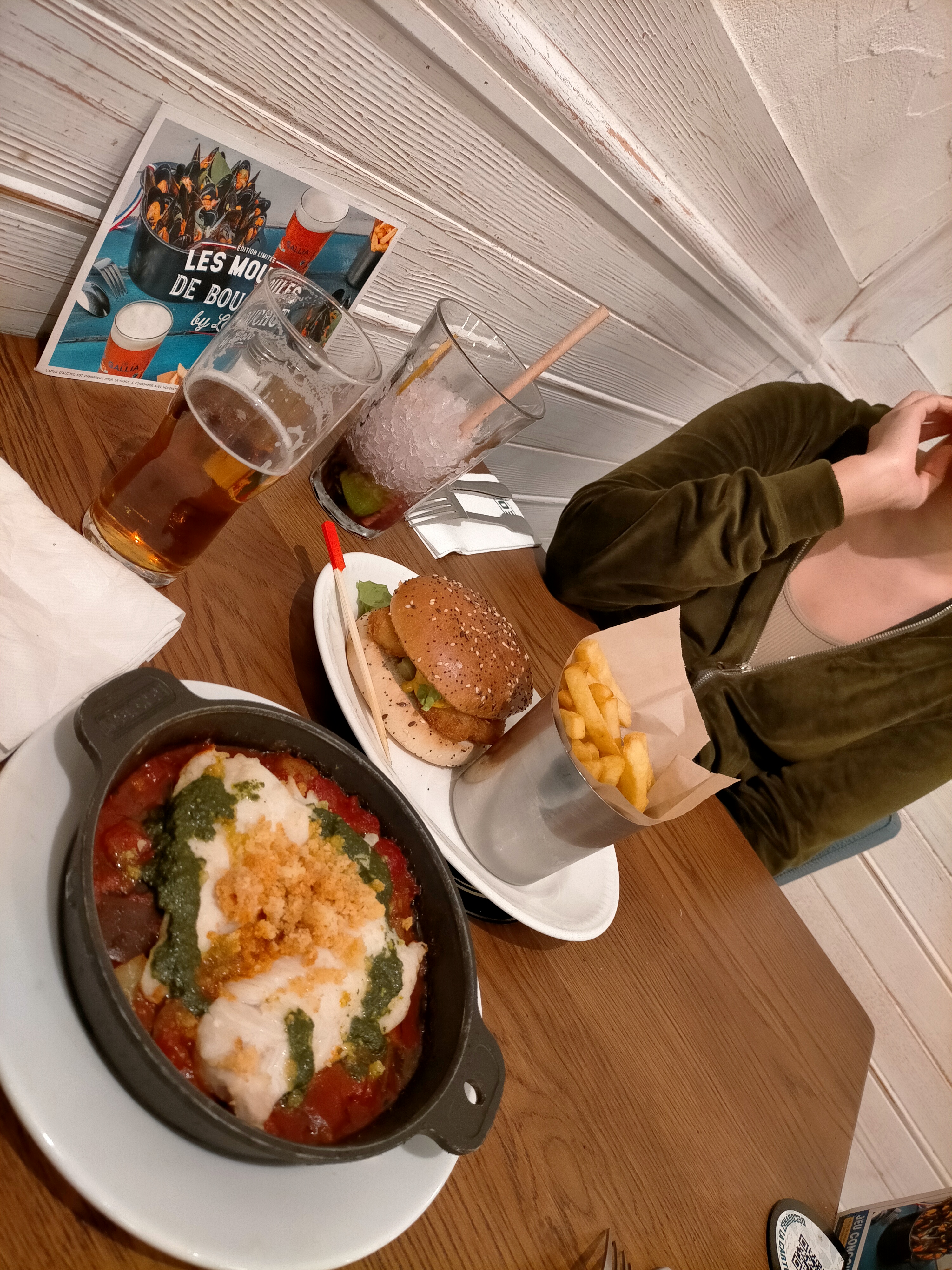 Cuisine : si vous venez pour les moules elles sont bonnes, par contre j’ai pris un tartares de saumon la quantité est trop faible , j’ai cru que c’était une entrée.. Service : A revoir, le sourire et l’accueil sont la base, je n’ai eu ni l’un ni l’autre. Ambiance : Assis a 14h15 prise de commandes a 14h45 nous avons failli partir. Avoir de l’attente pour son plat ça arrive ca peut dépendre de l’affluence du moment, mais ne pas venir voir une table, ne même pas regarder ou proposer au moins les boissons c’est très frustrant, on se sent pas bienvenue.