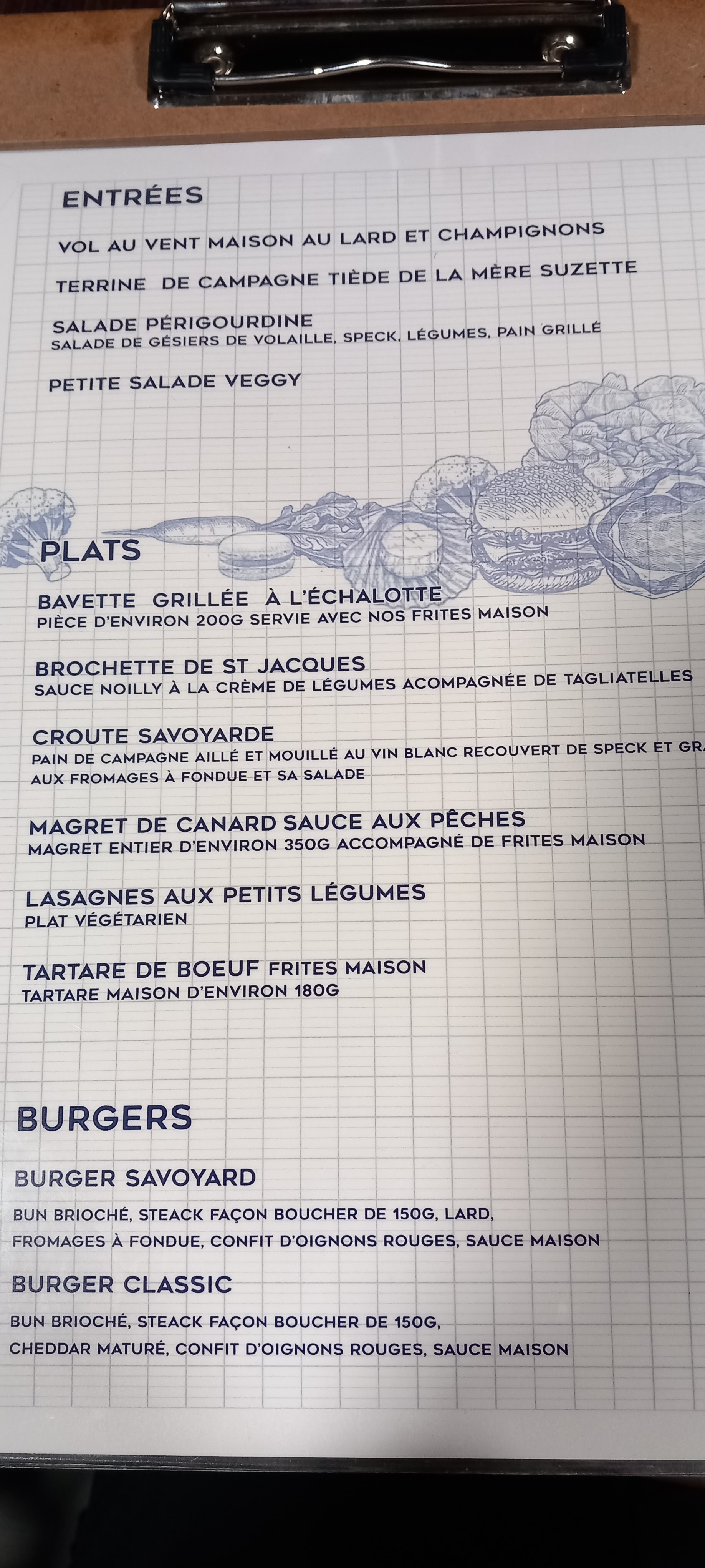 Pour une première visite, choix du 1er plat : brochettes de saint-jacques-chorizo et tagliatelles. 1er constat : saint Jacques à peine cuites et tagliatelles, certainement cuites depuis longtemps car asséchée en surface. Pour la seconde personne : choix du plat : steack-frites, cuisson assurée à la demande, mais frites repassées en cuisson plusieurs fois avant d'être servies et beaucoup trop foncées. Quant à l'assiette de fromage. Que dire... Trois bout de fromages sans beurre, sans saveur et surtout pour 7 euros. Je le trompe, je suis dans un gastro en se qui concerne le prix. J'espère que ces remarques vous permettrons d'avancer et de perdurer. Bonne continuation.