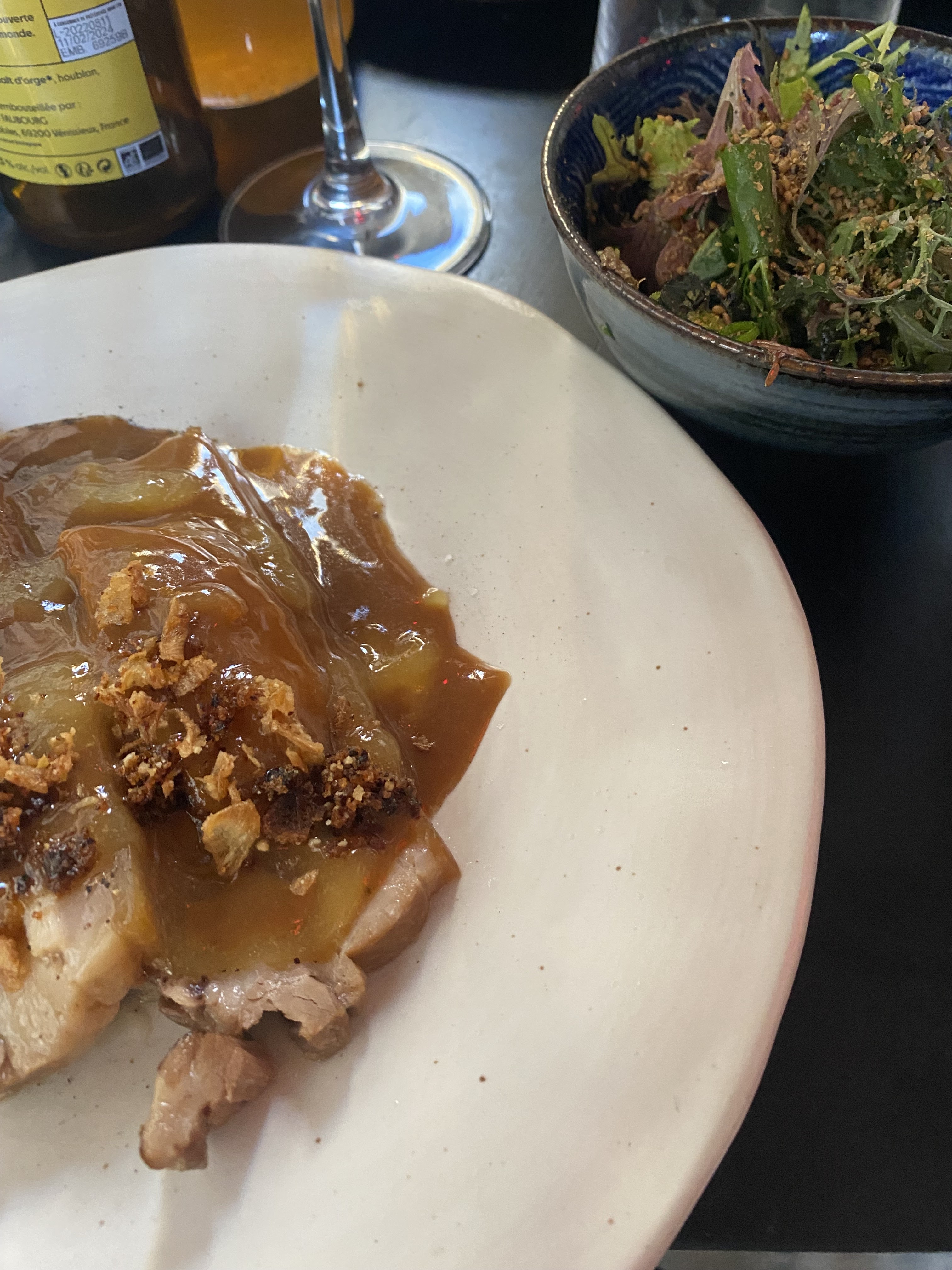 Leptine désoriente, Leptine surprend, Leptine régale. Cuisine incisive mais pas agressive, originale sans tomber dans le m’as tu vu, on se perd entre les fermentations, les Kosho, Ume et consorts… Au bout du compte on s’y retrouve avec le cochon tendre à souhait et le maigre aux algues. Et puis un endroit qui passe de Jorja Smith à Démon one, ce ne peut être qu’un bon endroit. Bravo et merci.
