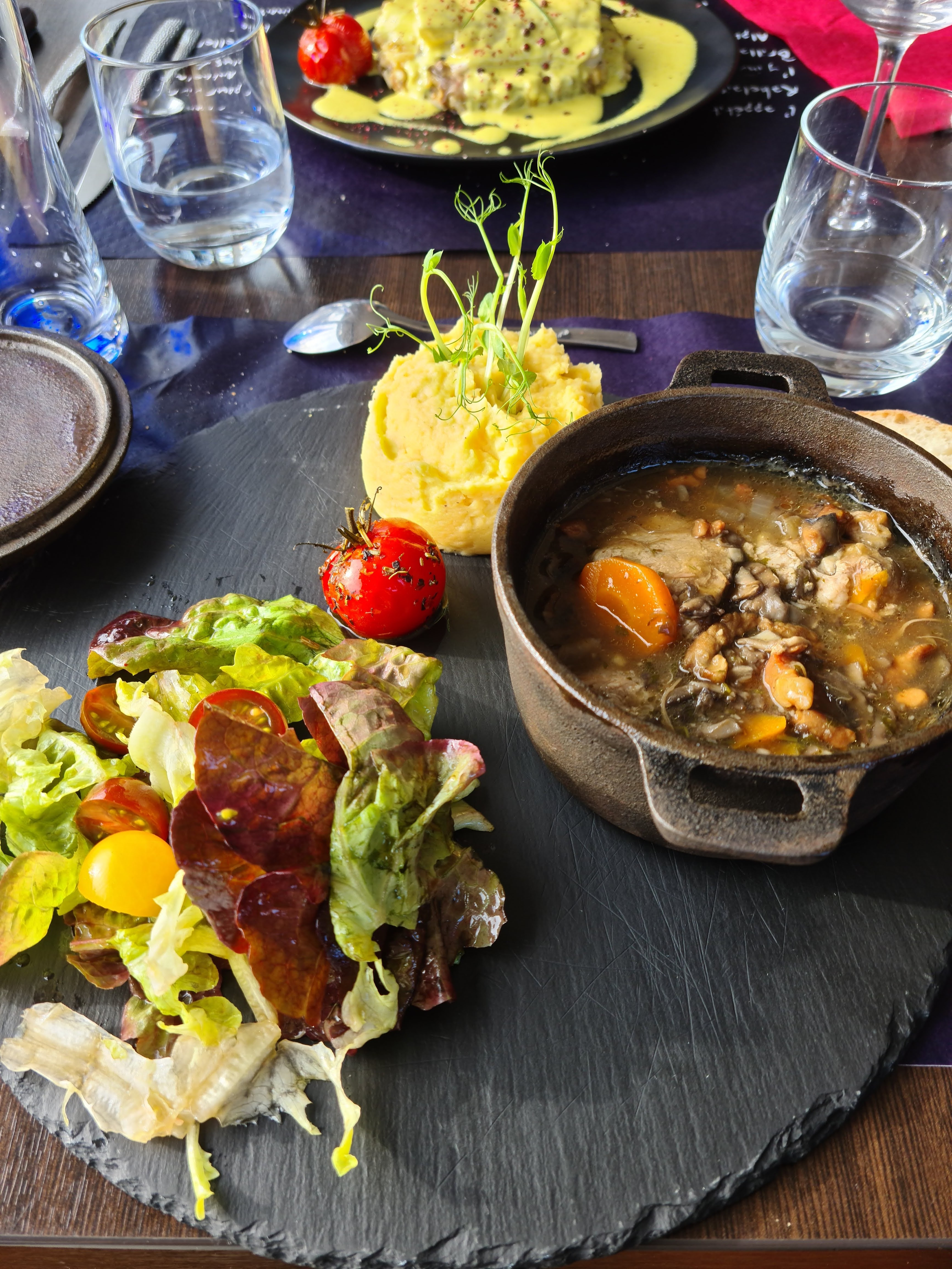 Excellent,fait maison, super vue,cocktail Camembert au four, profiteroles et moelleux au chocolat caramel beurre salé nous reviendrons avec le soleil 😁🌞