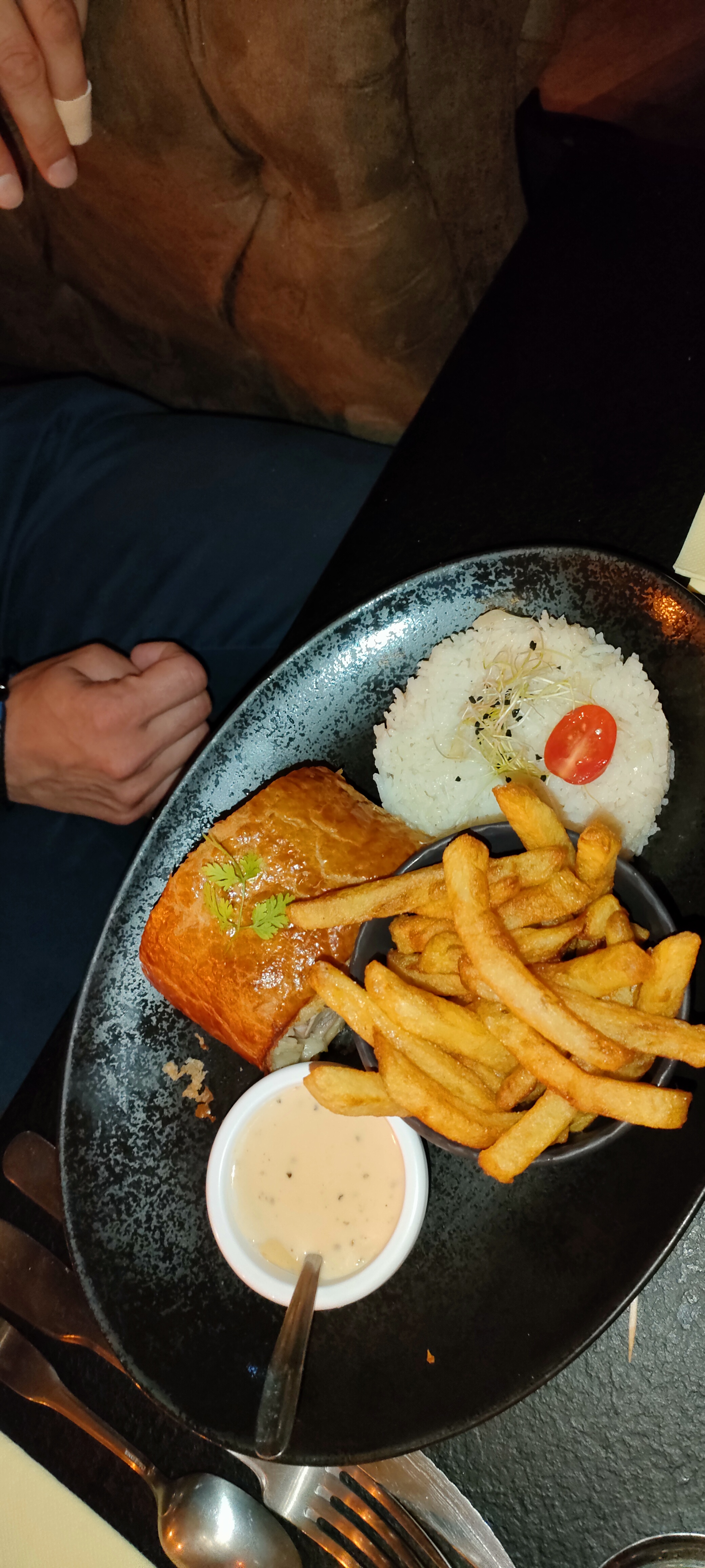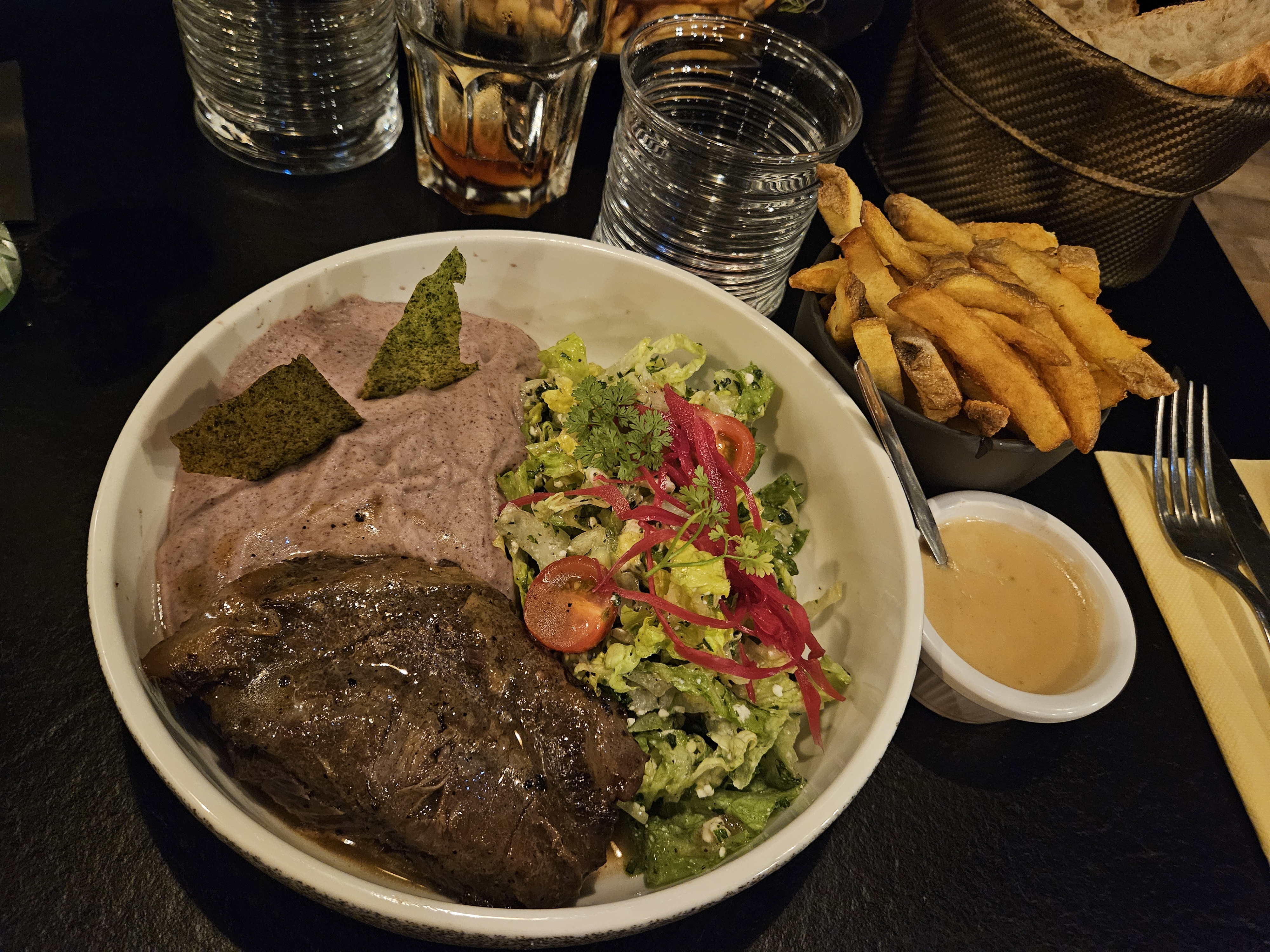 Beau cadre, serveur cool. Petit détail à notre demande il manquait un verre pour apéro et ensuite pas de couverts avec une assiette,pas bien grave. Je souhaitais du boeuf il n'y en avait plus,ensuite agneau pareil et choix du magret de canard 🦆 bon mais manque en quantité. Je recommande,chacun doit se faire un avis. Il y a mieux mais sûrement pire. 😋