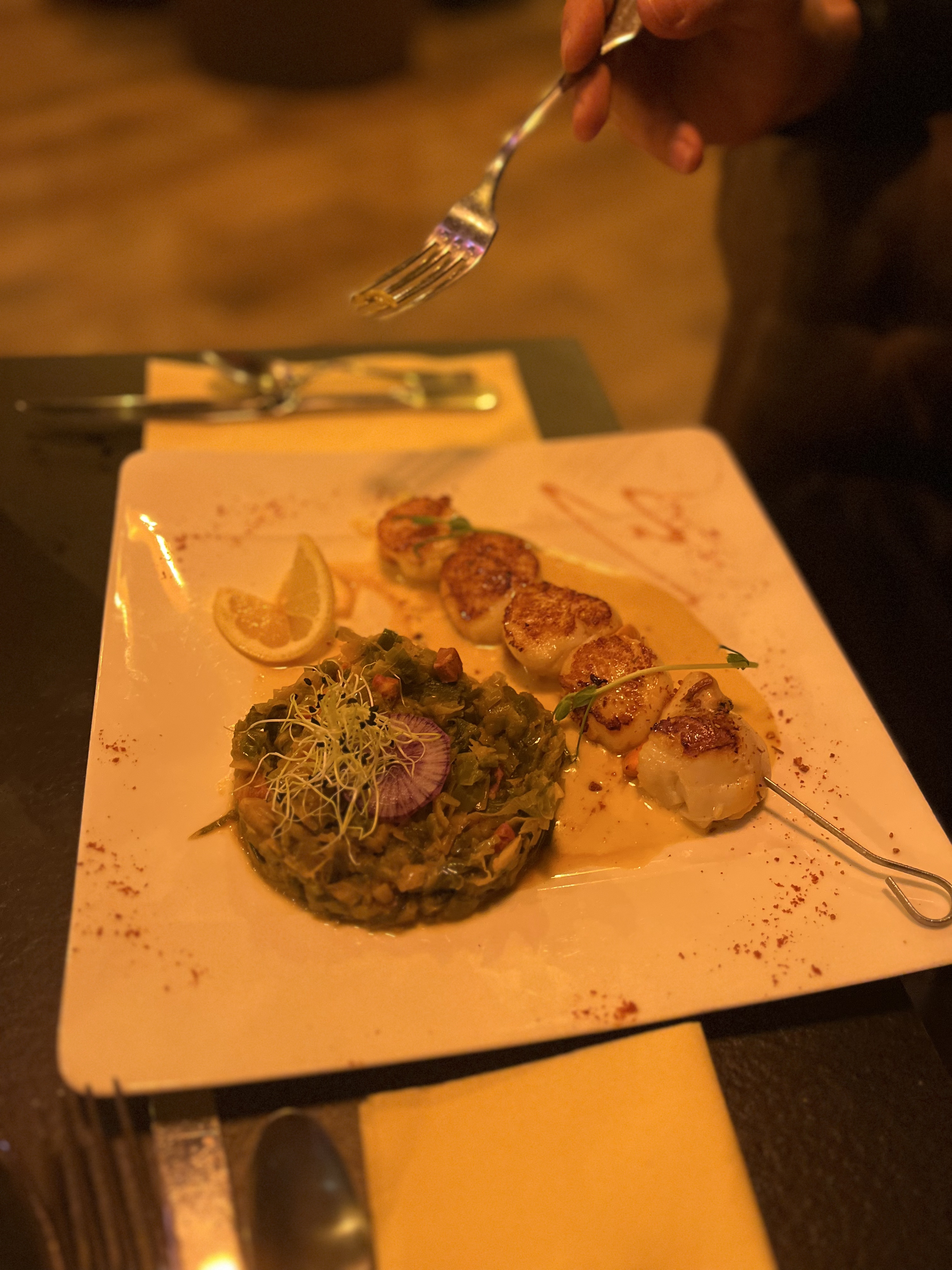 Super nous sommes allés dîner avec mon mari et nous avons été ravi, l'ambiance est romantique et c'était délicieux. Carte simple, peu de choix pour les desserts mais tout est très bon
