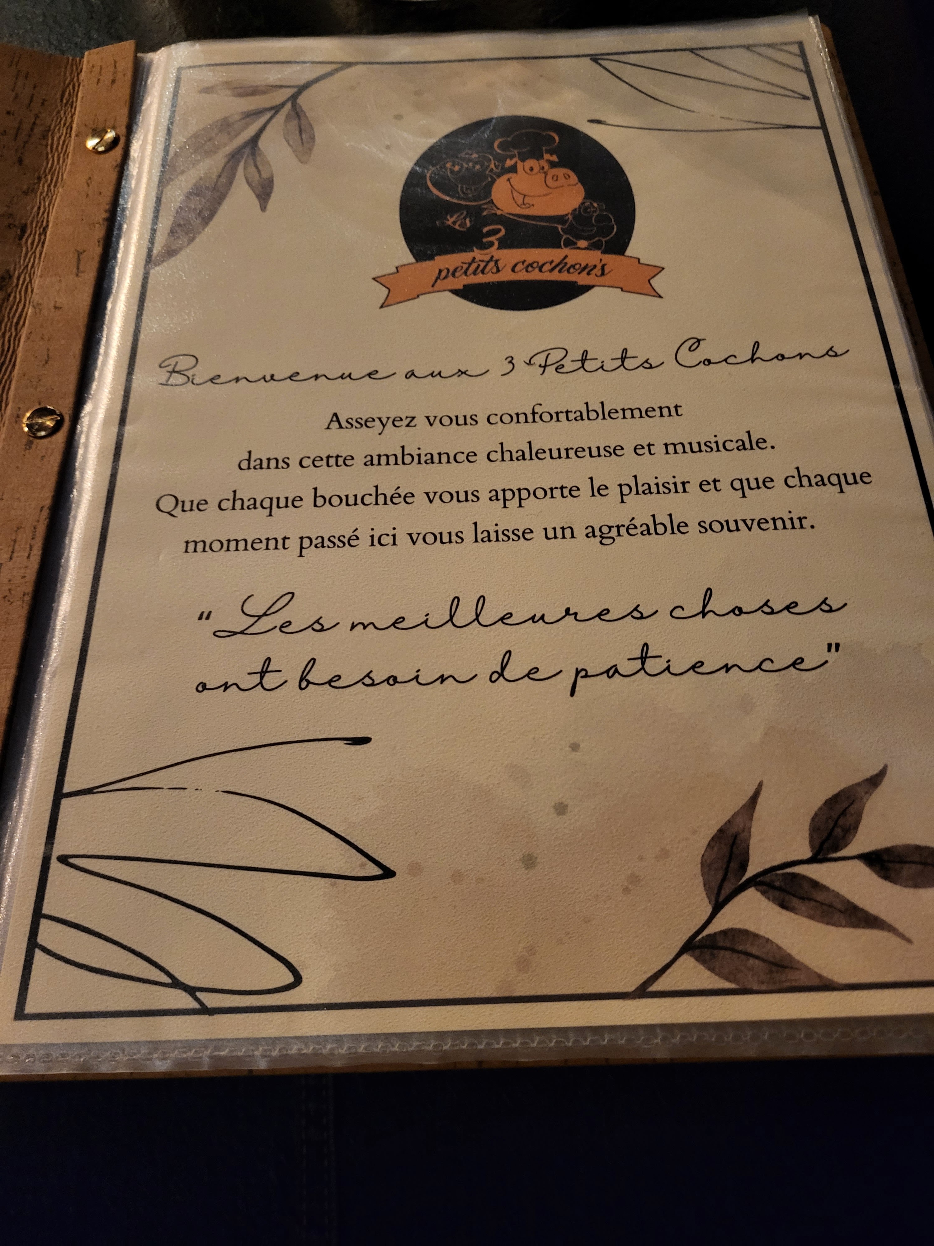 Encore un très bon moment passé aux trois petits cochons. Accueil au top. Toujours un sourire. Repas excellent comme d’habitude. Pas besoin du pain ou de l’eau pour que qq nous serve. Ça fait toujours plaisir de constater qu’un restaurant n’est pas q’un endroit pour manger mais aussi un lieu d’échange et de service pro. Encore bravo pour l’ambiance et l’accueil. Continuez comme cela, cela vous va bien. On continuera à venir toujours avec autant de plaisir. Julien J