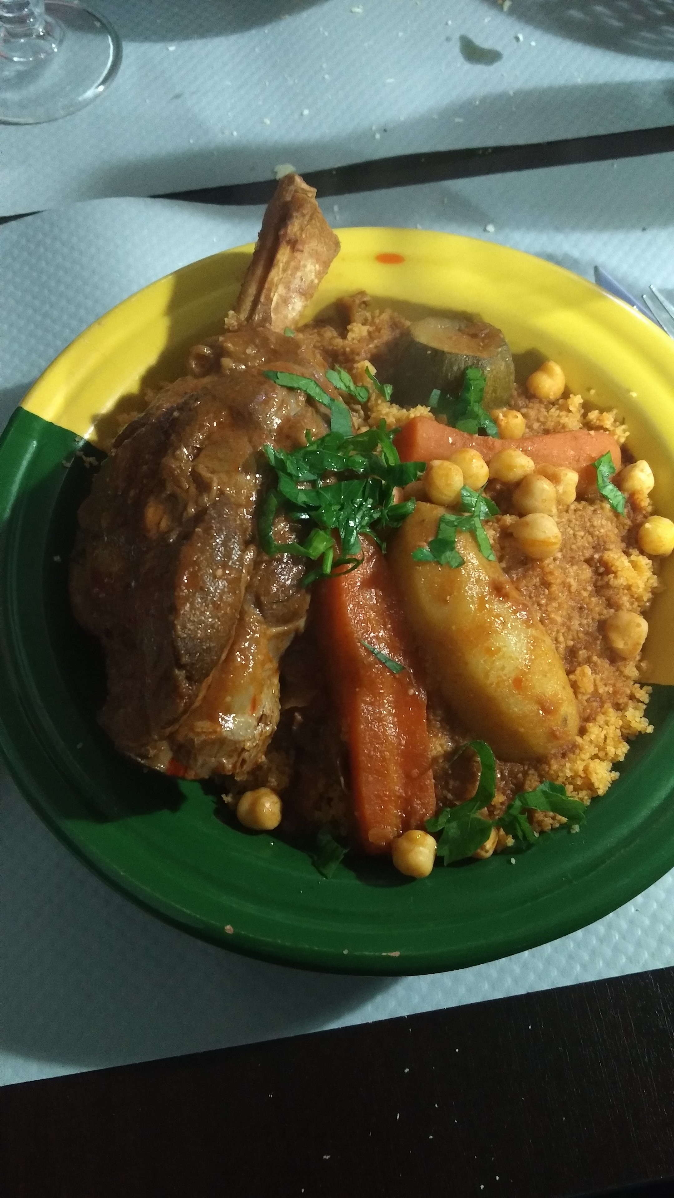 Excellent Couscous. Accueil agréable, Un seul regret MAIS IMPORTANT, l impossibilité de boire du vin . Incompréhensible dans un pays de liberté.