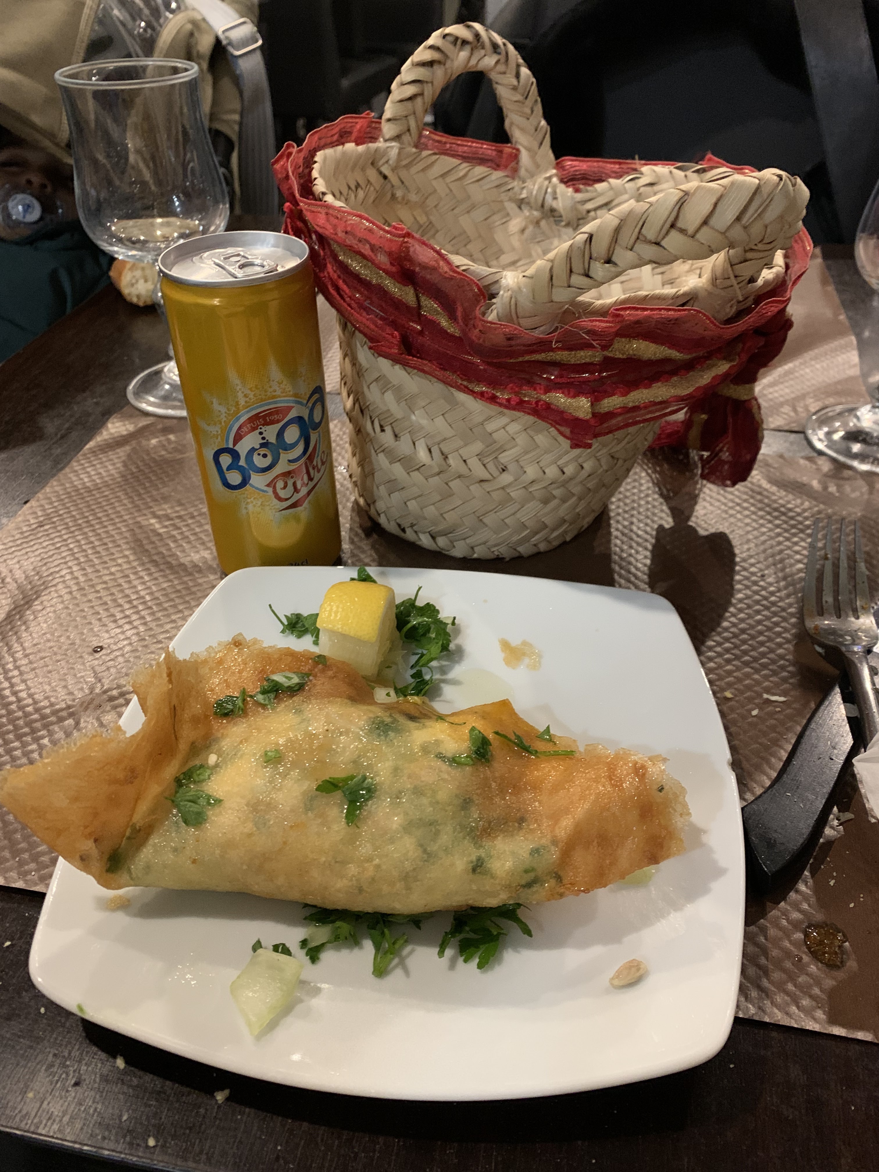 Plats tunisiens authentiques: chorba, riz djerbien au calamar un régale, brick, coquelet au riz, dessert d’exception ktayef et harissa louz Je le recommande, à consommer sans modération.