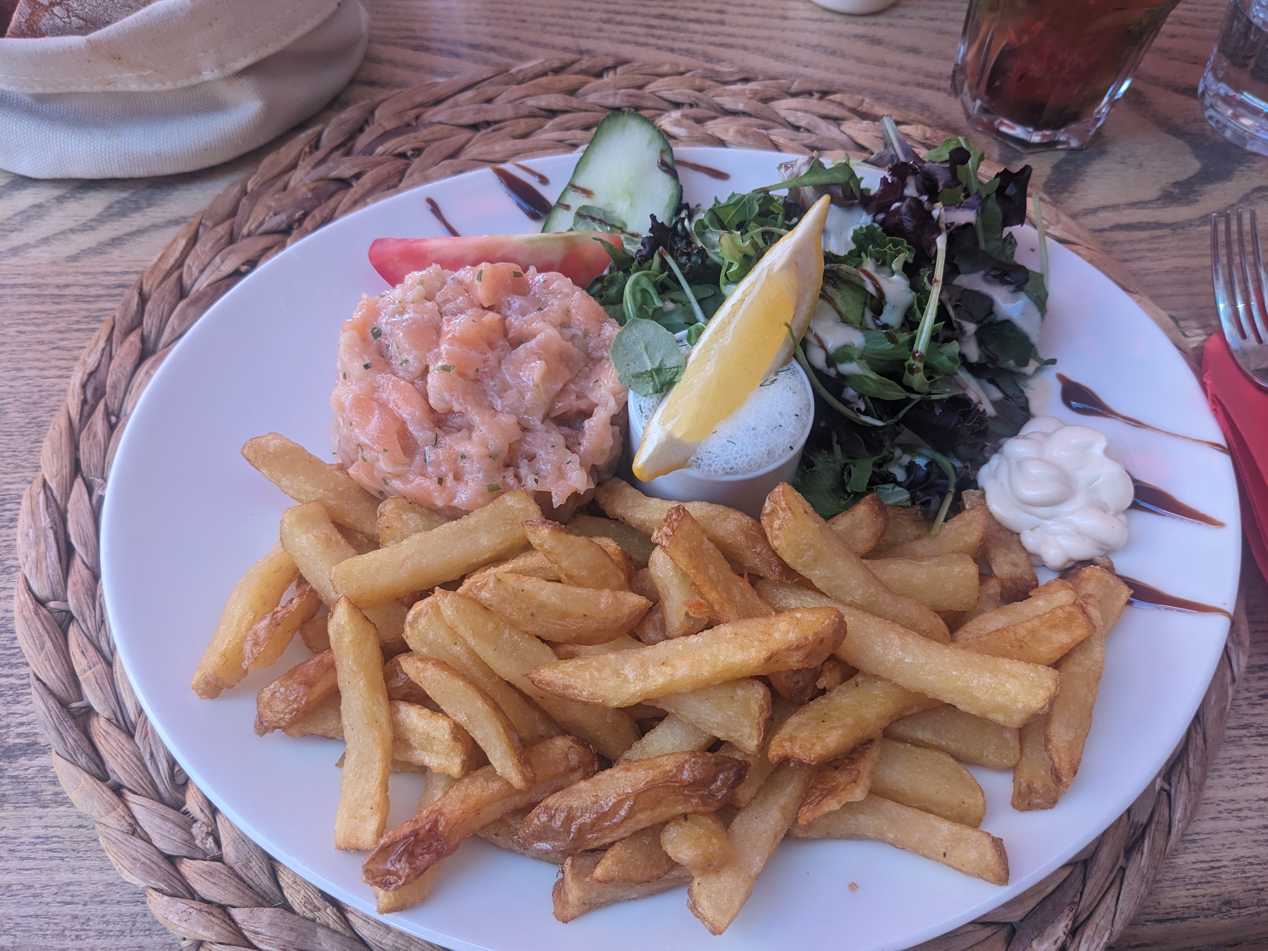 Accueil chaleureux dans ce restaurant proposant une cuisine maison. Le tartare de saumon était vraiment excellent, la mousse d’aneth était succulente et les frites maison étaient bien dorées. La terrasse est agréable. Bon choix de vin. Je re recommande vivement !