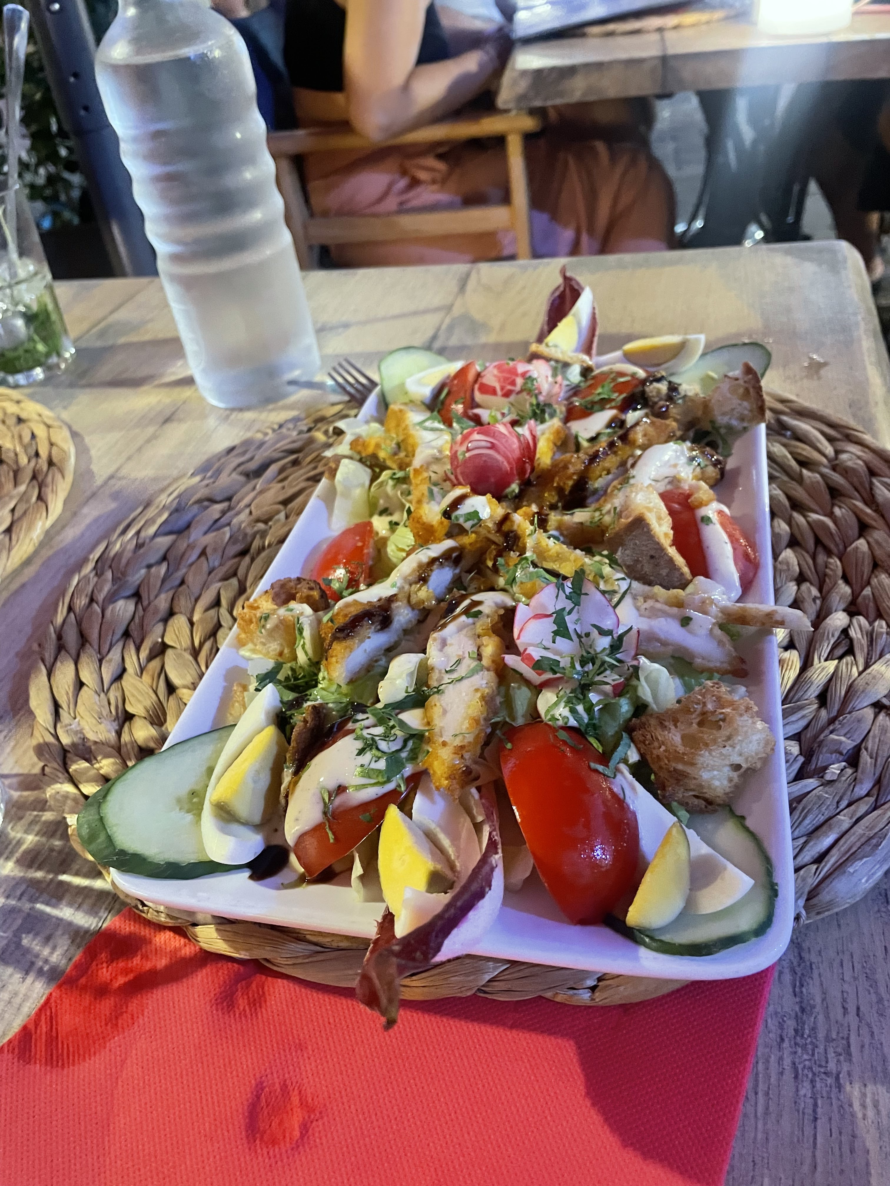 Nourriture délicieuse, un Schnitzel est également possible (c'est ce qu'on appelle une escalope). Les portions sont grandes. Les entrées sont presque deux fois plus nombreuses qu'aux Pays-Bas. Vous pouvez également demander deux assiettes avec l'entrée à partager. Le repas comprend également du riz et/ou des frites. Délicieuses tagliatelles à la sauce tomate épicée avec le Schnitzel. Le service est sympathique et fluide. Les chaises sont confortables. Les réservations sont obligatoires, sinon assurez-vous d'être là avant 19h15 pour avoir toujours une place. Veuillez noter; le restaurant n'ouvre qu'à 19h00. Vous pouvez bien sûr vous asseoir à l'avance, mais vous ne serez aidé qu'après 19 heures. Après de nombreuses déceptions concernant la nourriture ici, nous sommes très satisfaits de ce restaurant. Tellement bon que nous y avons mangé plusieurs fois pendant nos vacances. Les crevettes sont avec têtes et queues et dans une sauce crémeuse. Un peu brouillon mais savoureux. Le carpaccio était très bon et il est également accompagné de frites, donc même s'il est inclus dans les entrées, il s'agit en fait d'un repas complet.