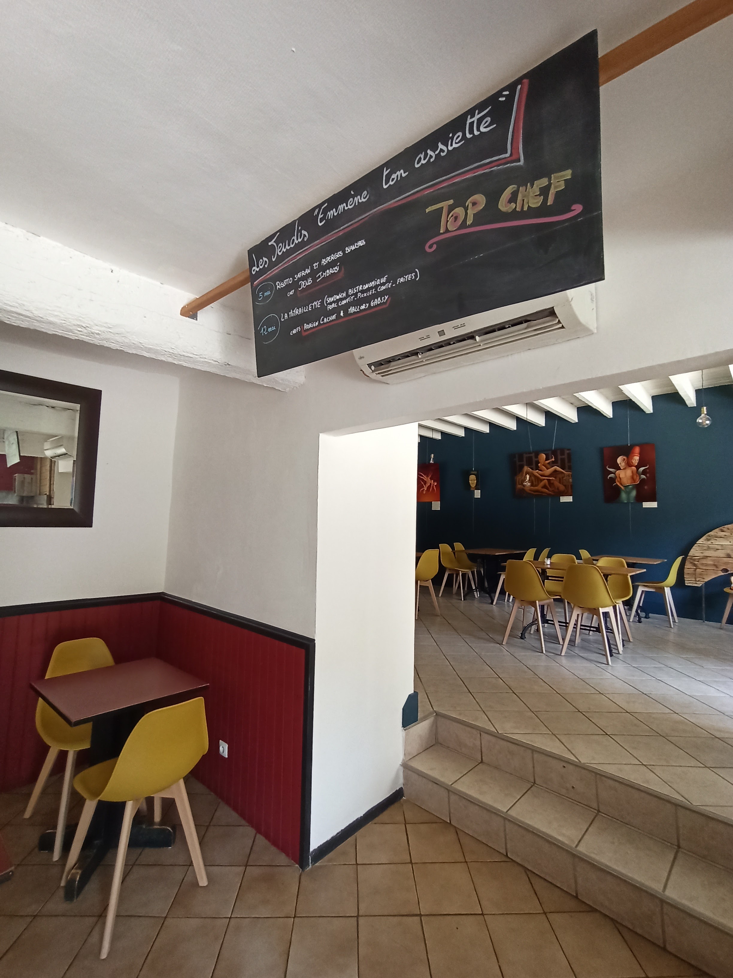 Très agréable terrasse, joliment agencée et bien ombragée. Salades composées délicieuses et pleines de saveurs. Viande très bien cuisinée. Produits locaux et frais de qualité. Le concept de café associatif avec pleins d'animations est une belle idée. Enfin le coin livre et jouets est très appréciable pour les enfants!