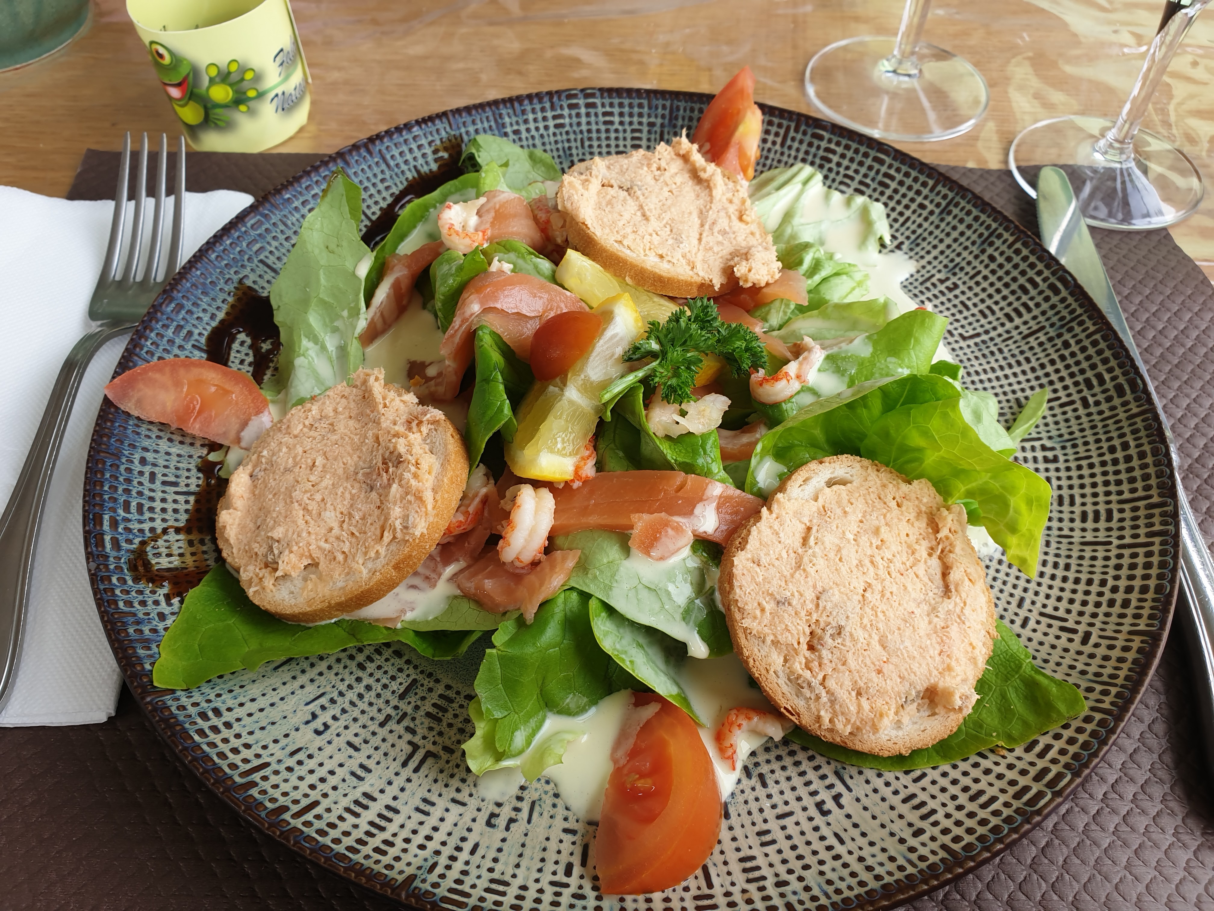 Cuisine fait maison. Salade fraîche et généreuse avec saumon fumé, écrevisses et tartines aux rillettes de saumon. La friture de silure était bien exécutée sans excès de gras. Les desserts étaient excellents en particulier le sabayon. Nous avons été très bien accueilli malgré une arrivée juste avant 14 heures et après avoir essuyé d'autres refus.
