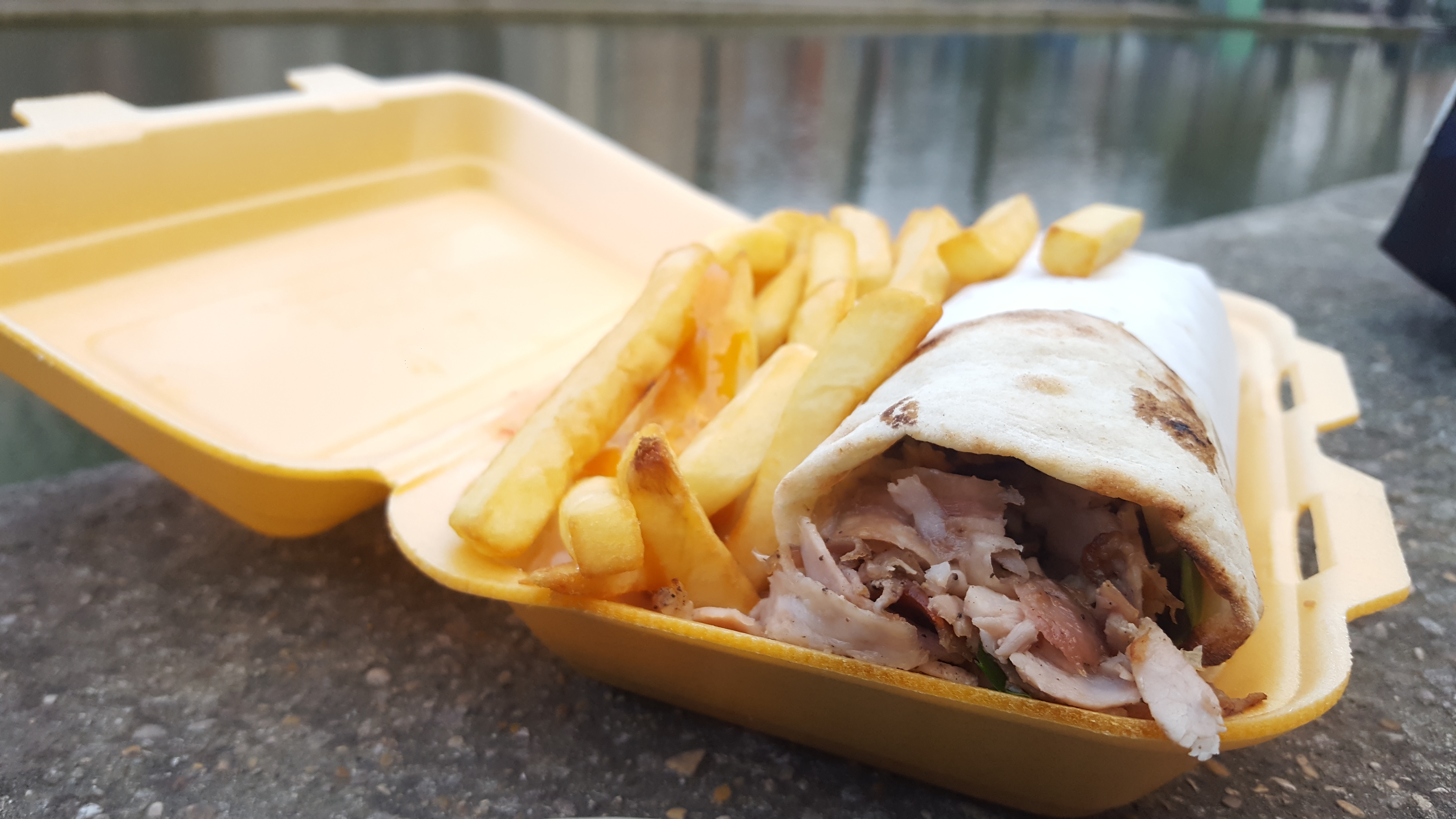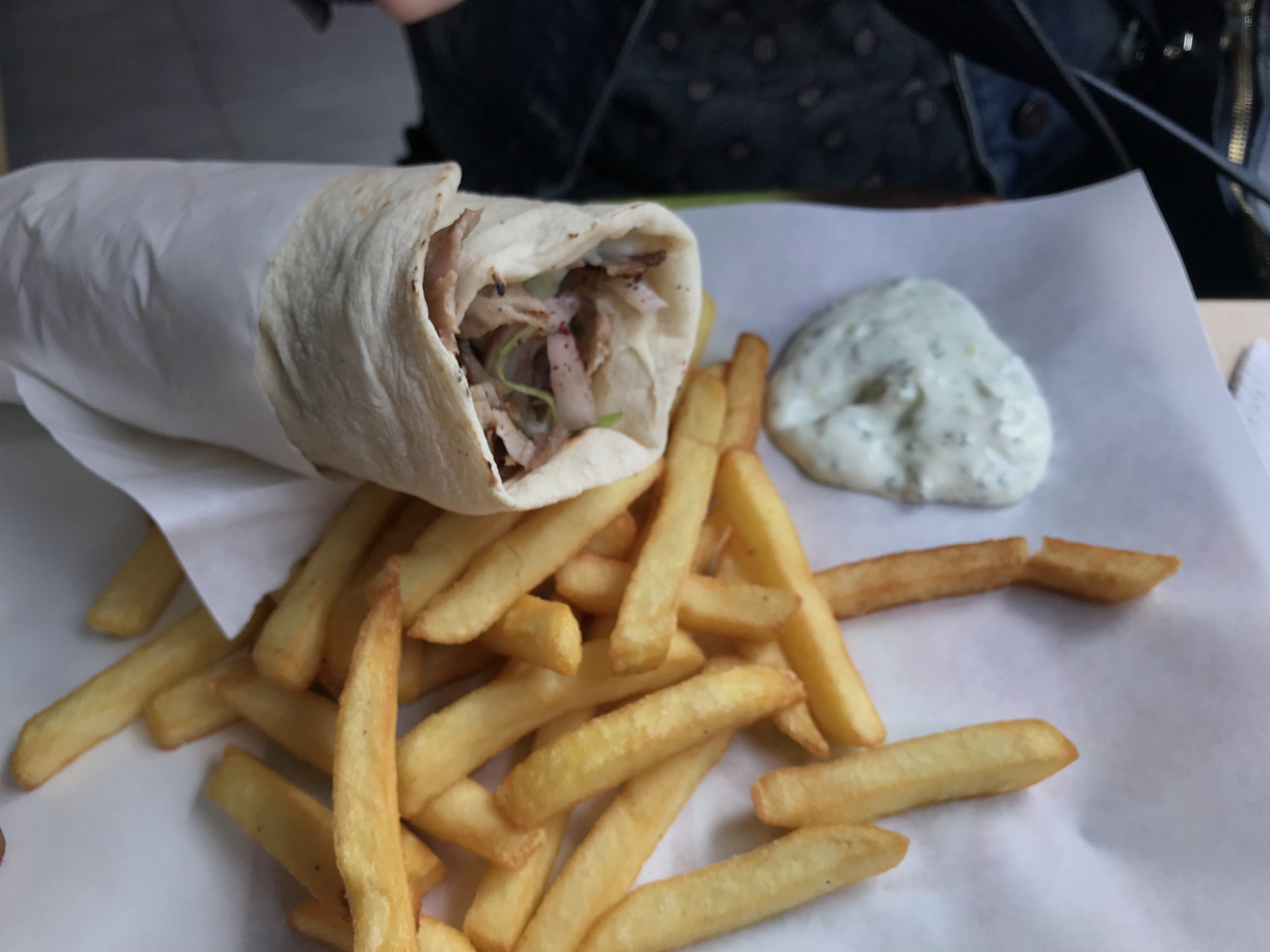 Enfin. Ce kebab était tellement agréable que je m'en suis léché les doigts. Doré et croustillante étaient les frites, la tomate était juteuse et la sauce accompagnait parfaitement le tout. Merci, Chef.