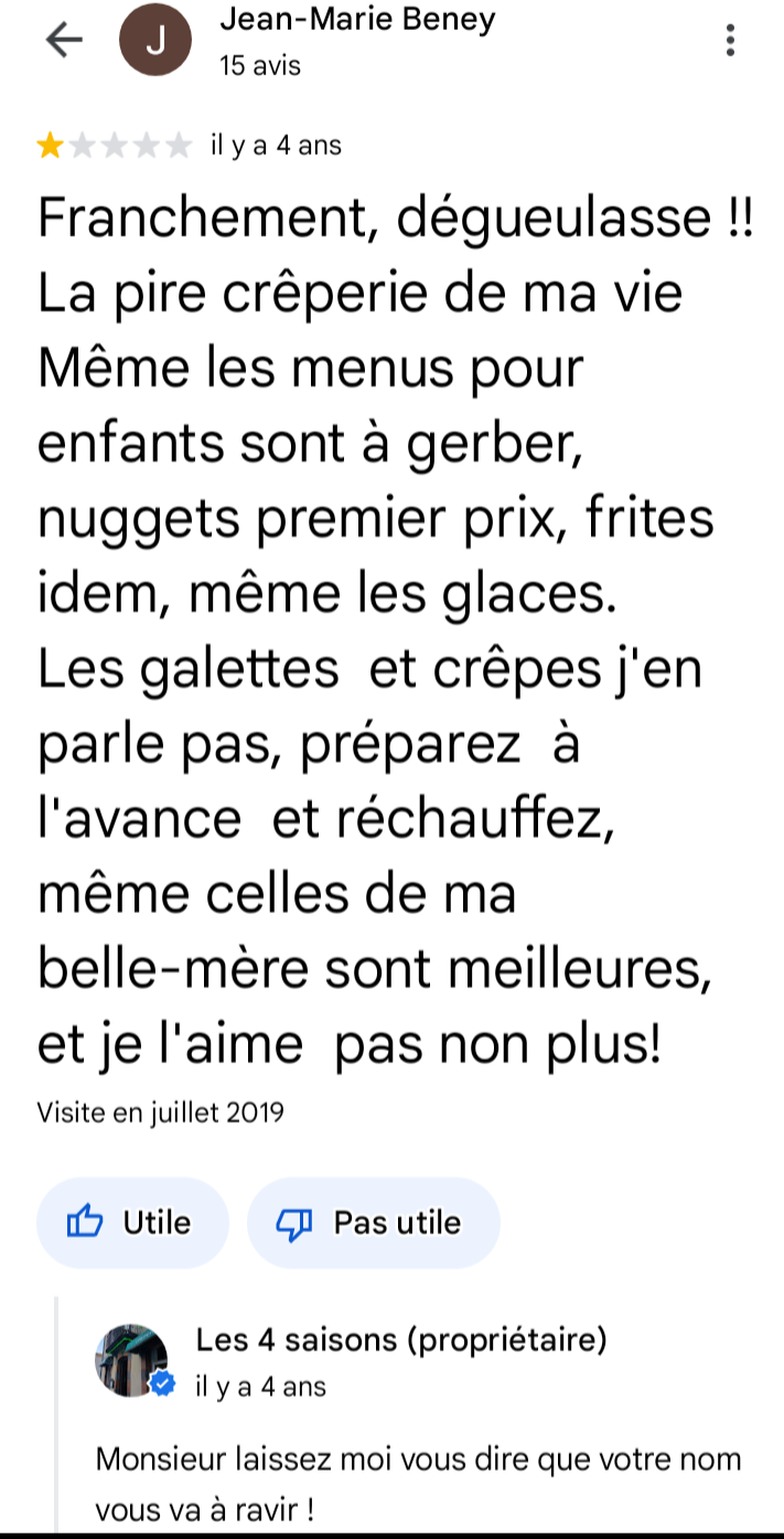 Franchement, dégueulasse !! La pire crêperie de ma vie Même les menus pour enfants sont à gerber, nuggets premier prix, frites idem, même les glaces. Les galettes et crêpes j'en parle pas, préparez à l'avance et réchauffez, même celles de ma belle-mère sont meilleures, et je l'aime pas non plus!
