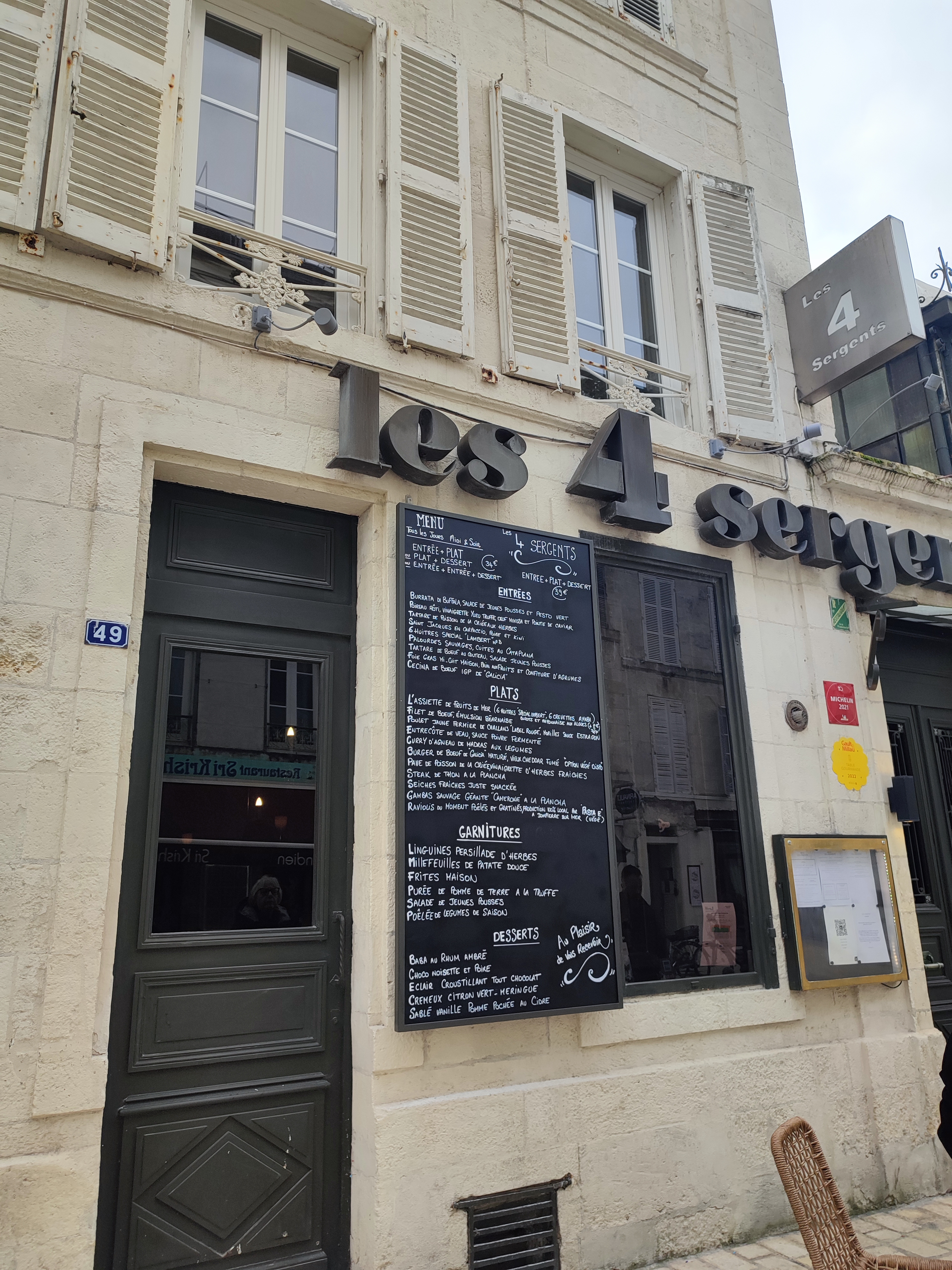 De passage à La Rochelle pour nos vacances estivales, nous avions jeté un petit coup d'œil aux restaurants du coin. Véritable institution et curiosité historique nous nous sommes décidépour Les 4 Sergents. Le lieu est atypique, magnifique et hors du temps. Un véritable plaisir pour les yeux. L'accueil et le service chaleureux et efficaces. Quand à la nourriture... Elle est délicieuse... Une véritable plaisir pour les papilles. A tel point qu'il a été pendant quelques minutes question de commander une 2nde fois le thon ! Avant de se décider pour un sublime pavlova.