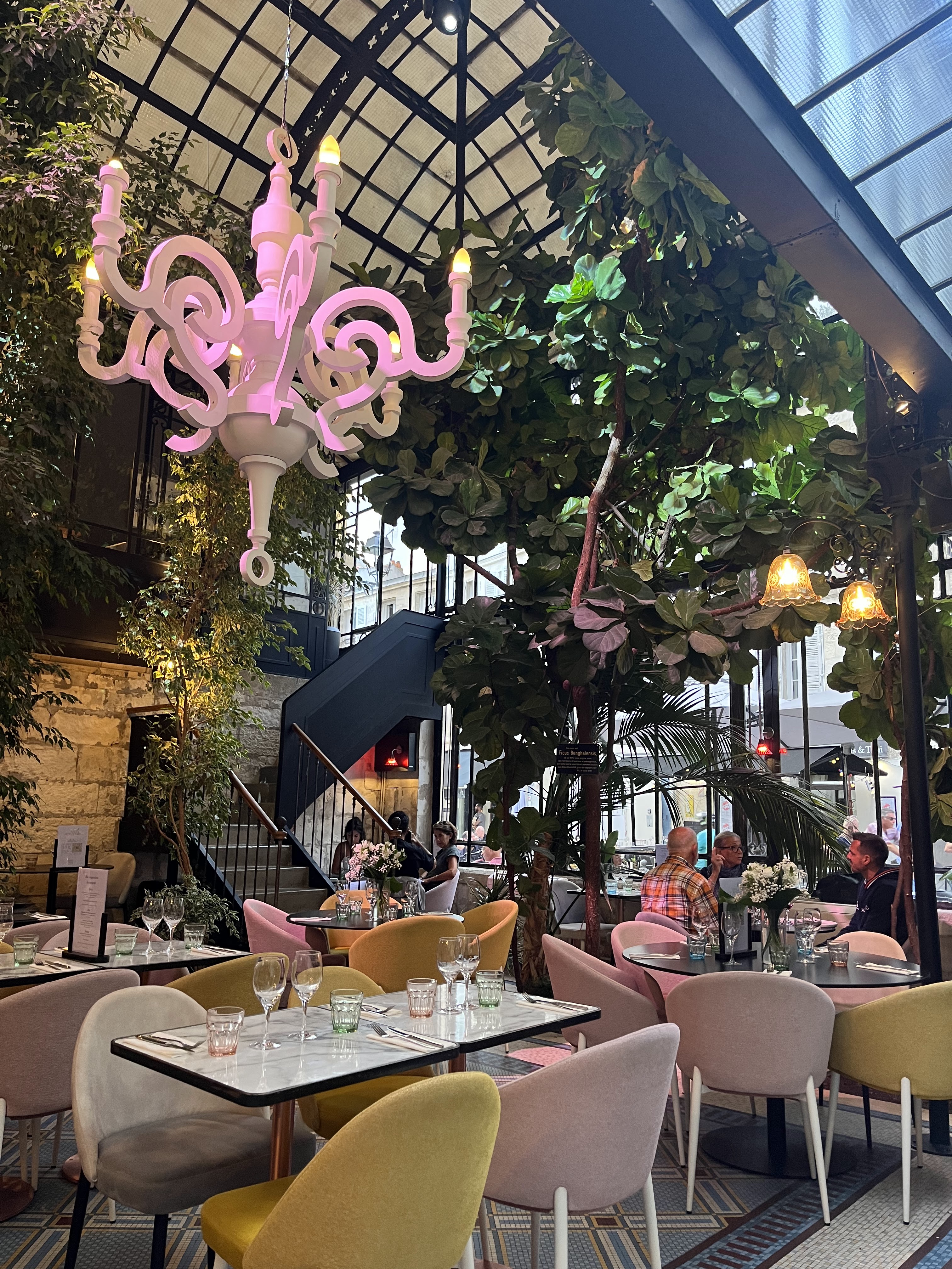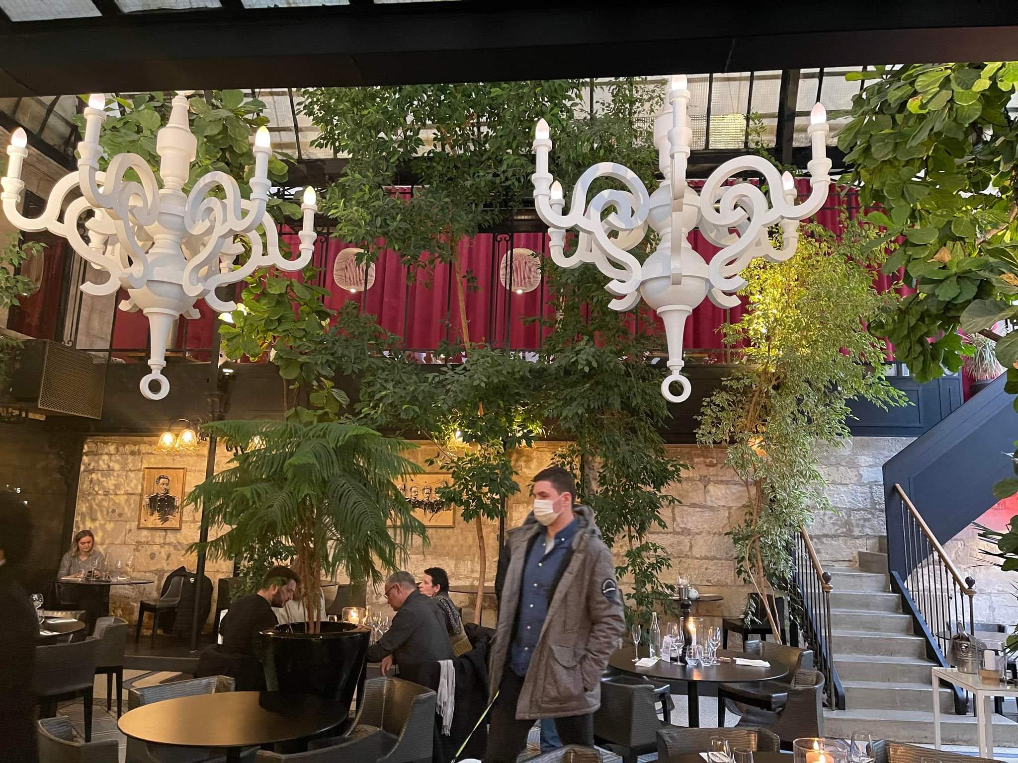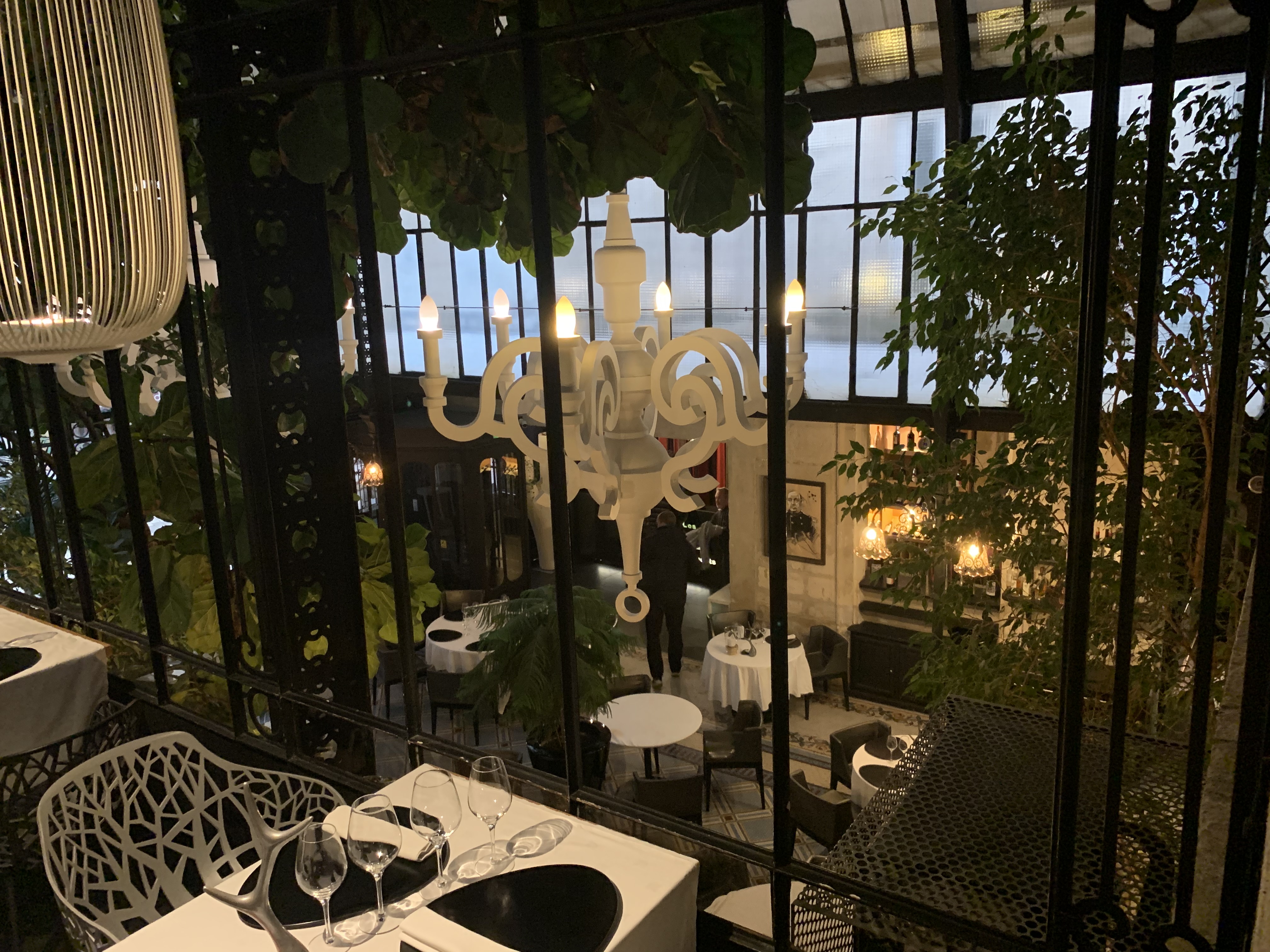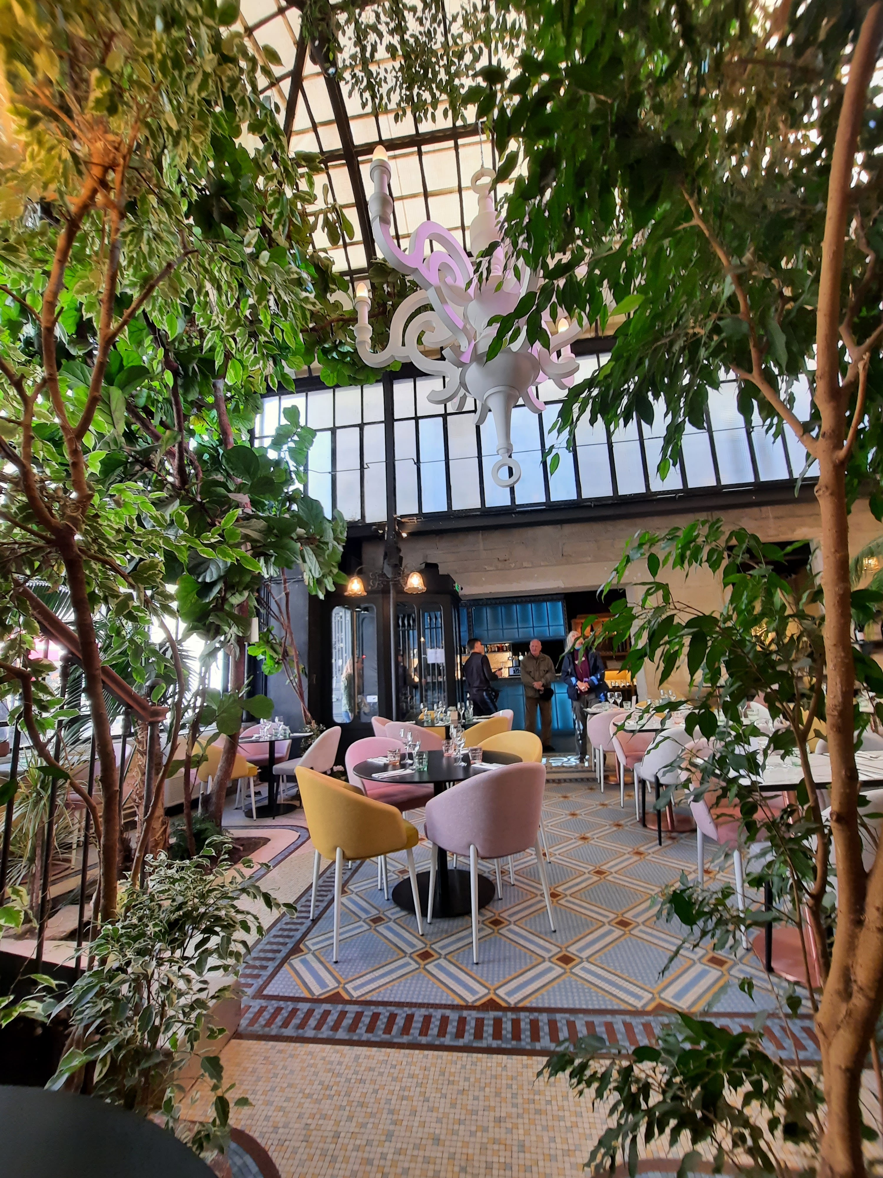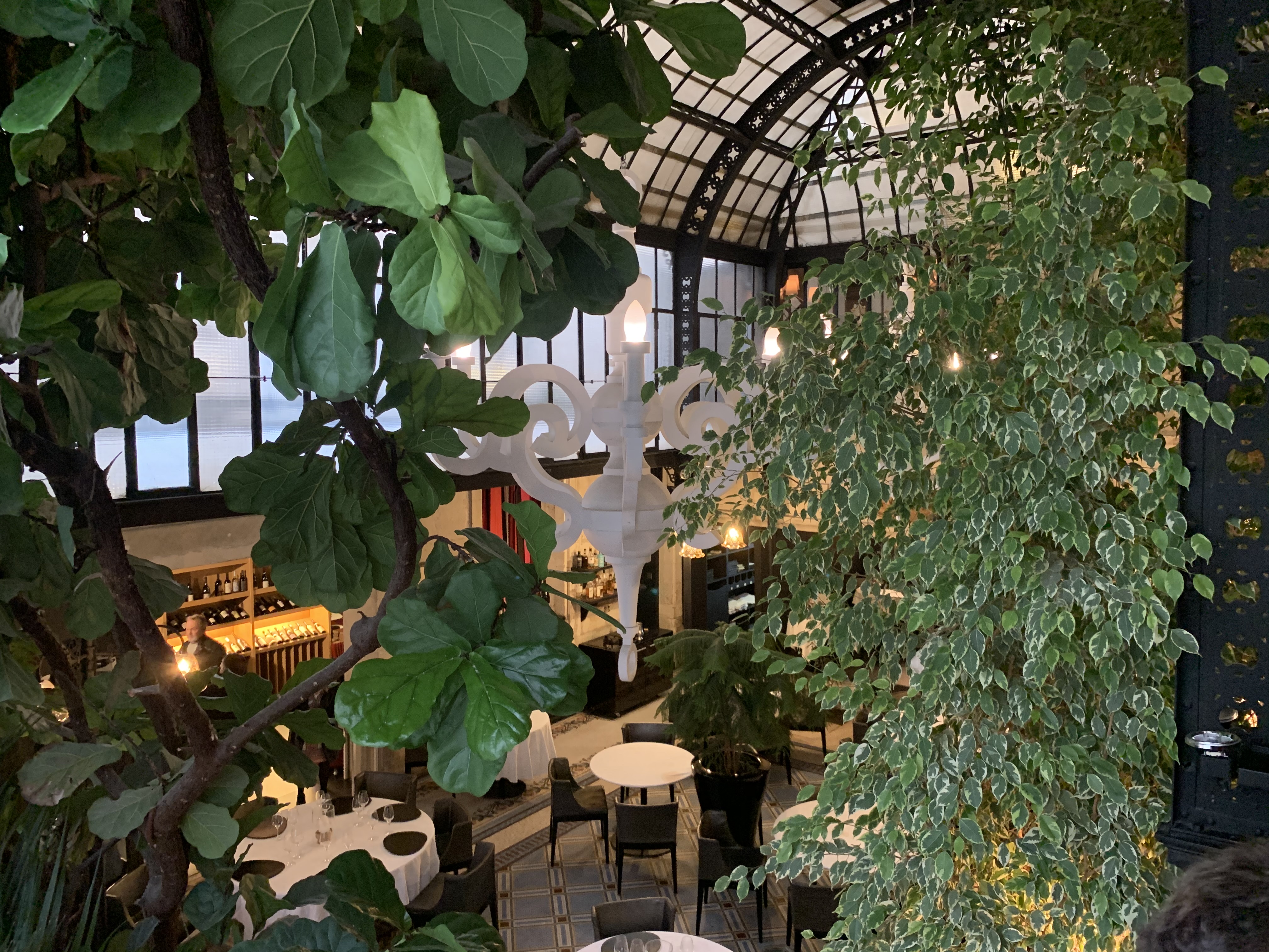 Le cadre est exceptionnel, ambiance jungle éclairé par des lustres géants et atypiques. La hauteur de plafond de la verrière garantit une ambiance sonore tamisée. La cuisine est raffinée et délicieuse. Bref, une belle expérience.
