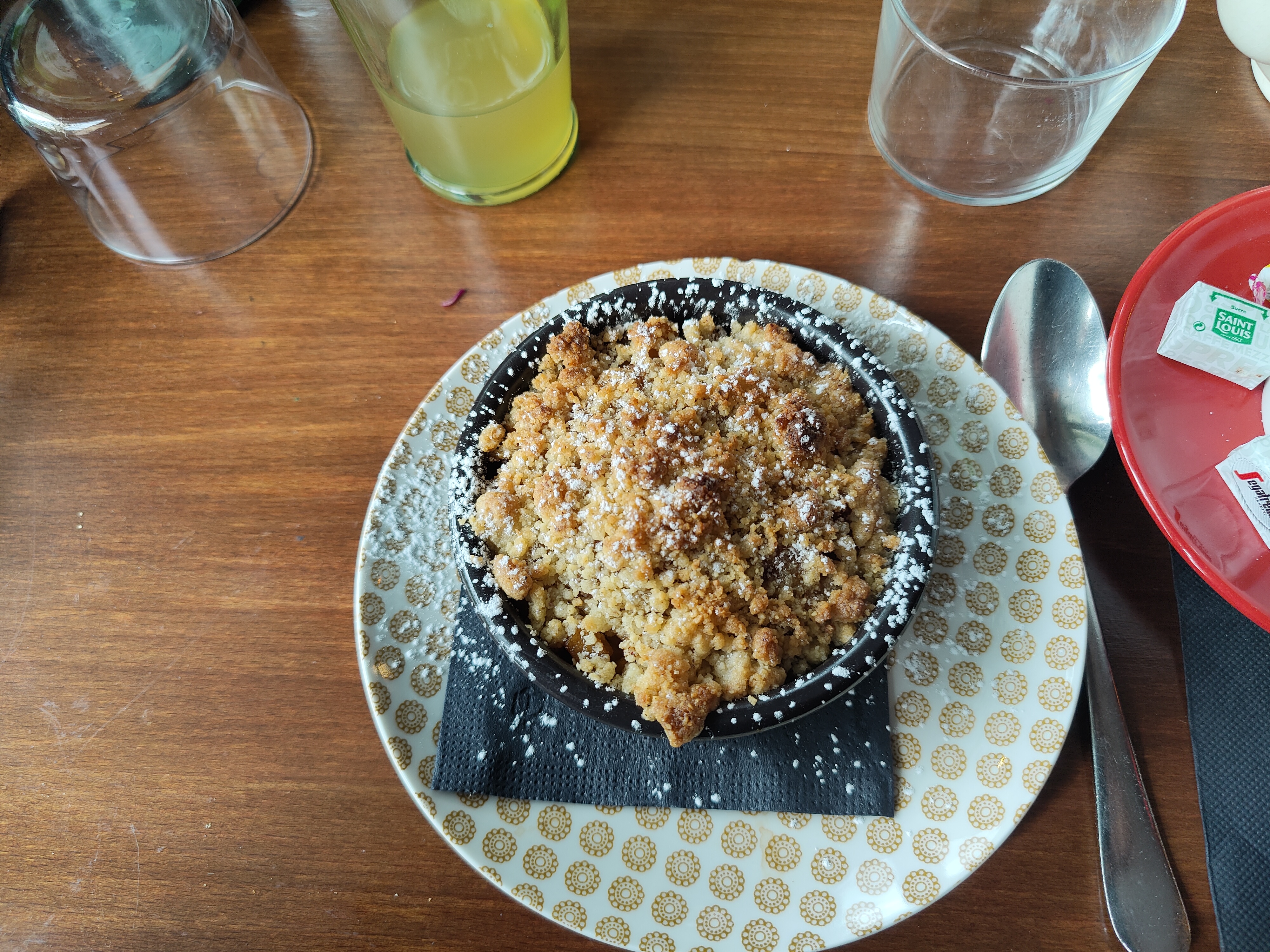 Curieux, ce serveur qui nous dit à 13H50 dans la même phrase : je vais voir en cuisine si encore possible de vous servir et je ne peux pas vous laisser la table de 4 (libre et seule à l’ombre) ? On a donc été déjeuner (bien), ailleurs...