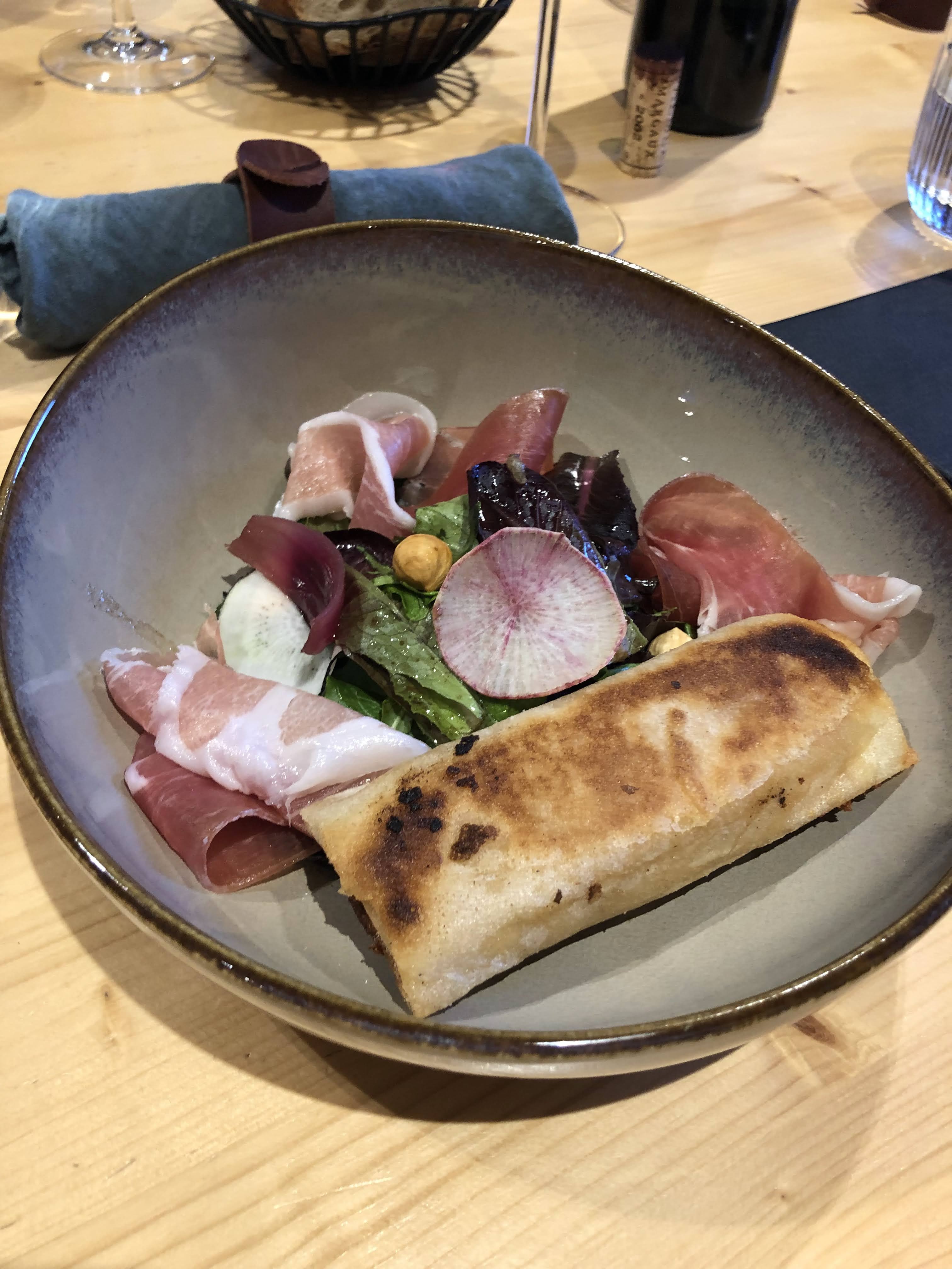 Au restaurant (il y a aussi quelques hébergements )Une carte courte mais de très sympathiques compositions, atypiques sans être farfelues. Tarifs très raisonnables. Service rapide et efficace. Manque un petit peu de développement sur la carte des vins, mais la maison est très récente et en devenir.