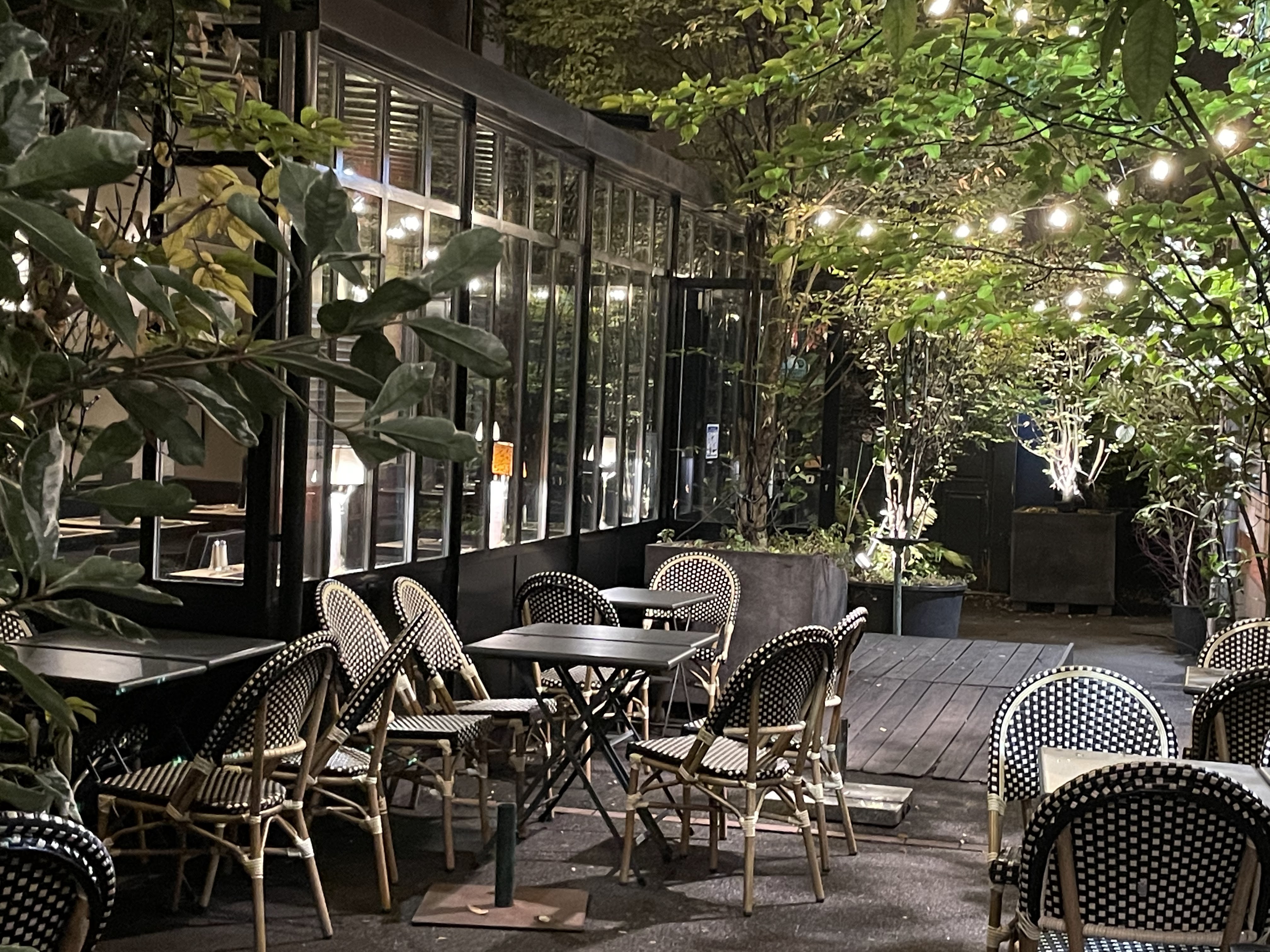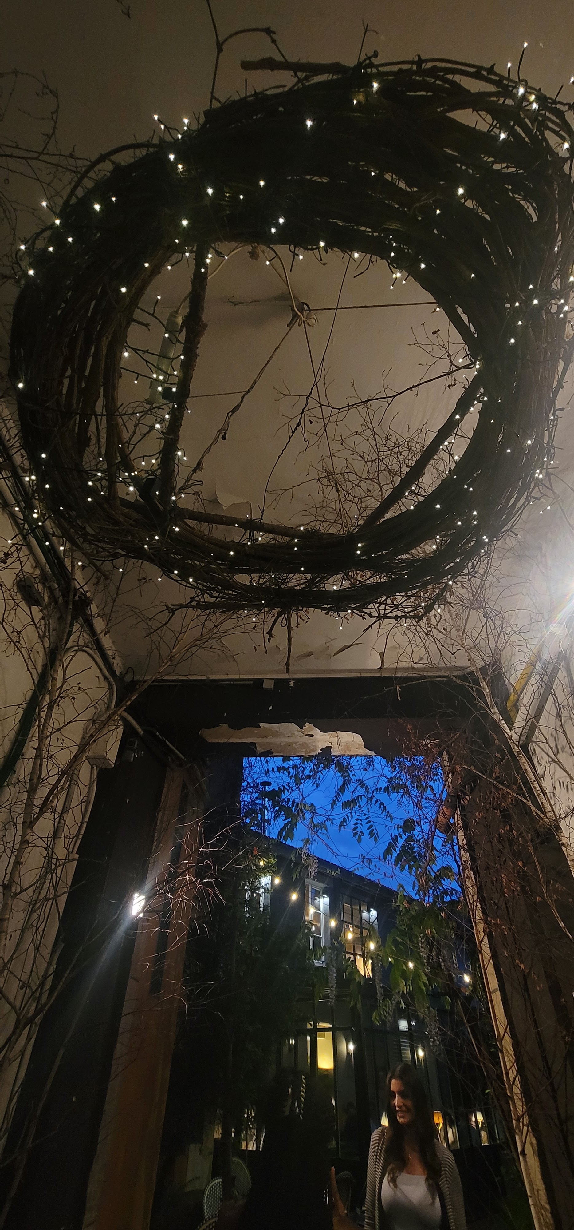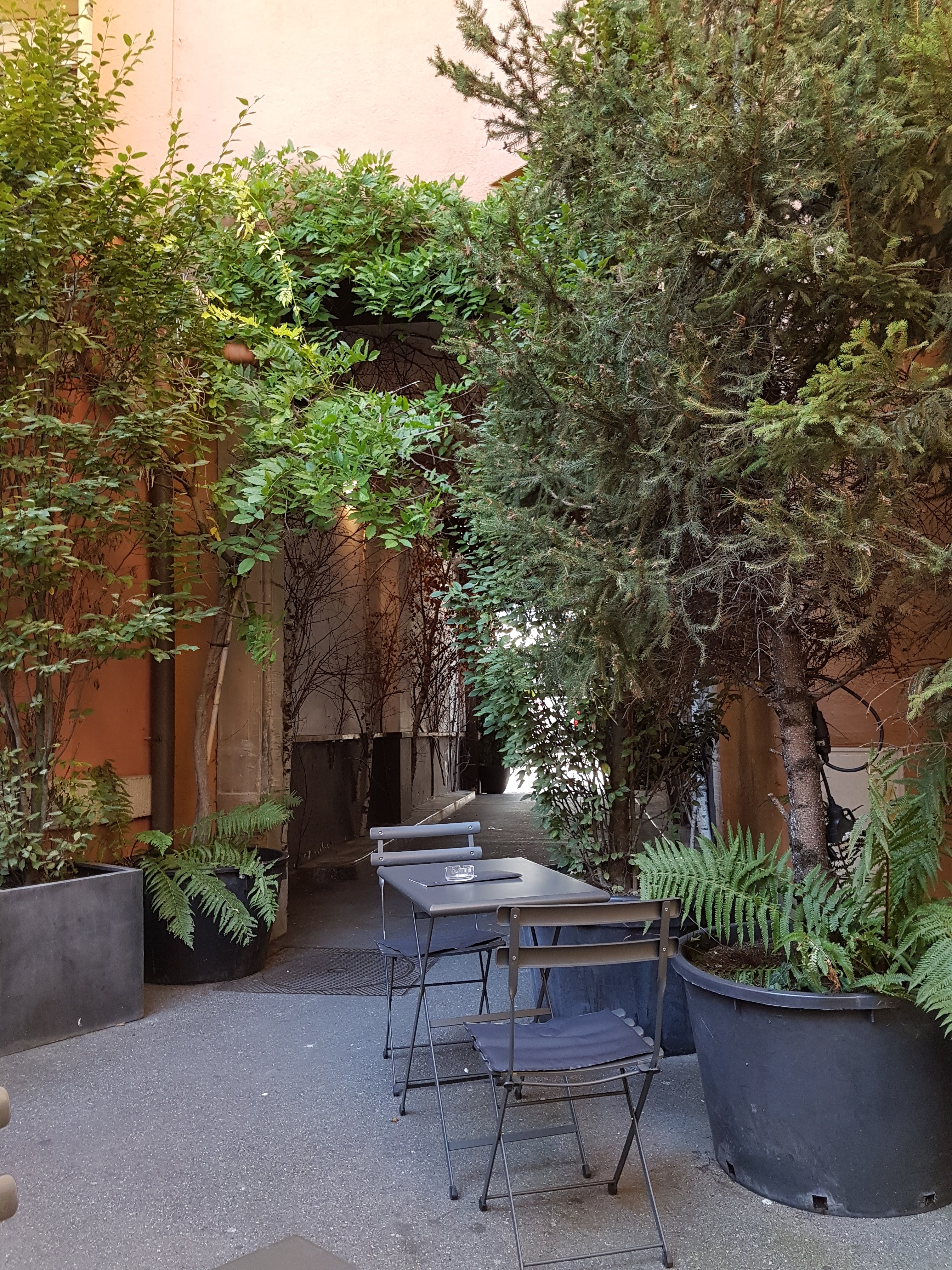 C'est un joli endroit. On passe sous un porche dont les murs sont habillés de verdure et à la voûte duquel il y a des suspensions lumineuses. La véranda est belle et feutrée mais les tables sont vraiment très rapprochées. A l'étage le bruit est insupportable. Comme souvent quand c'est the place to be. Côté consommations c'est vraiment pas à la hauteur. J'ai pris un chocolat chaud insipide (sûrement une solution soluble à l'eau). De l'urine au sol des toilettes et pas de papier hygiénique. Bref le décor ne fait pas tout... Déçue.