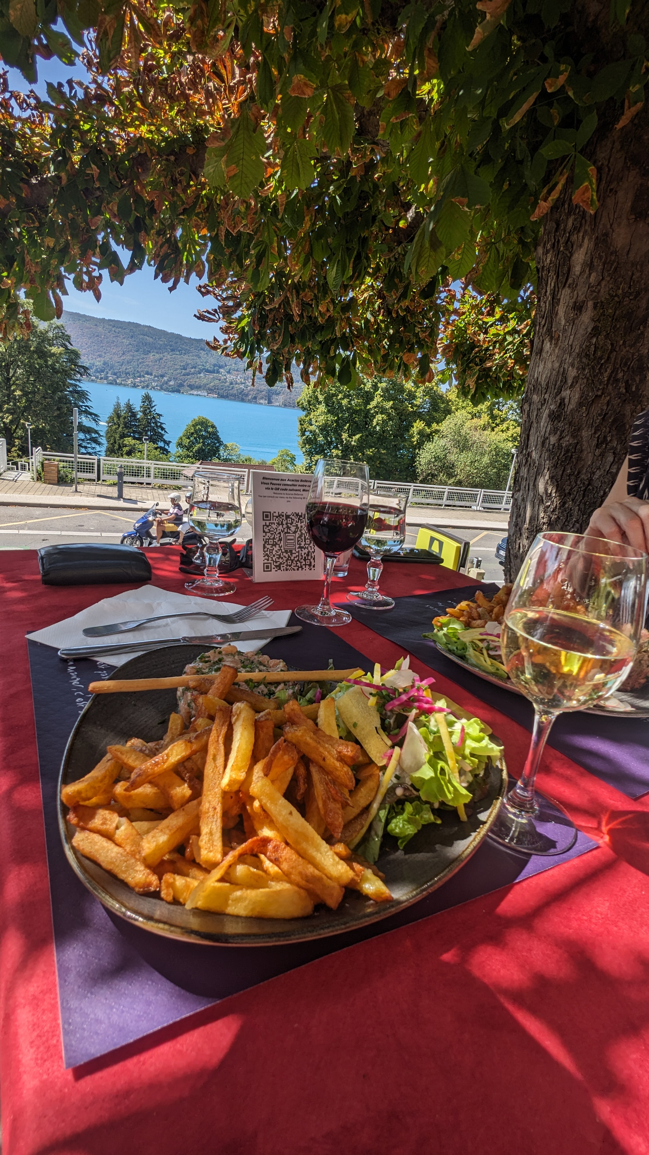 Lieu chaleureux et authentique. Terrasse ombragée sous les marronniers.. Cuisine simple et goûteuse ( frites maison) . Bonne adresse à 2 pas du lac .