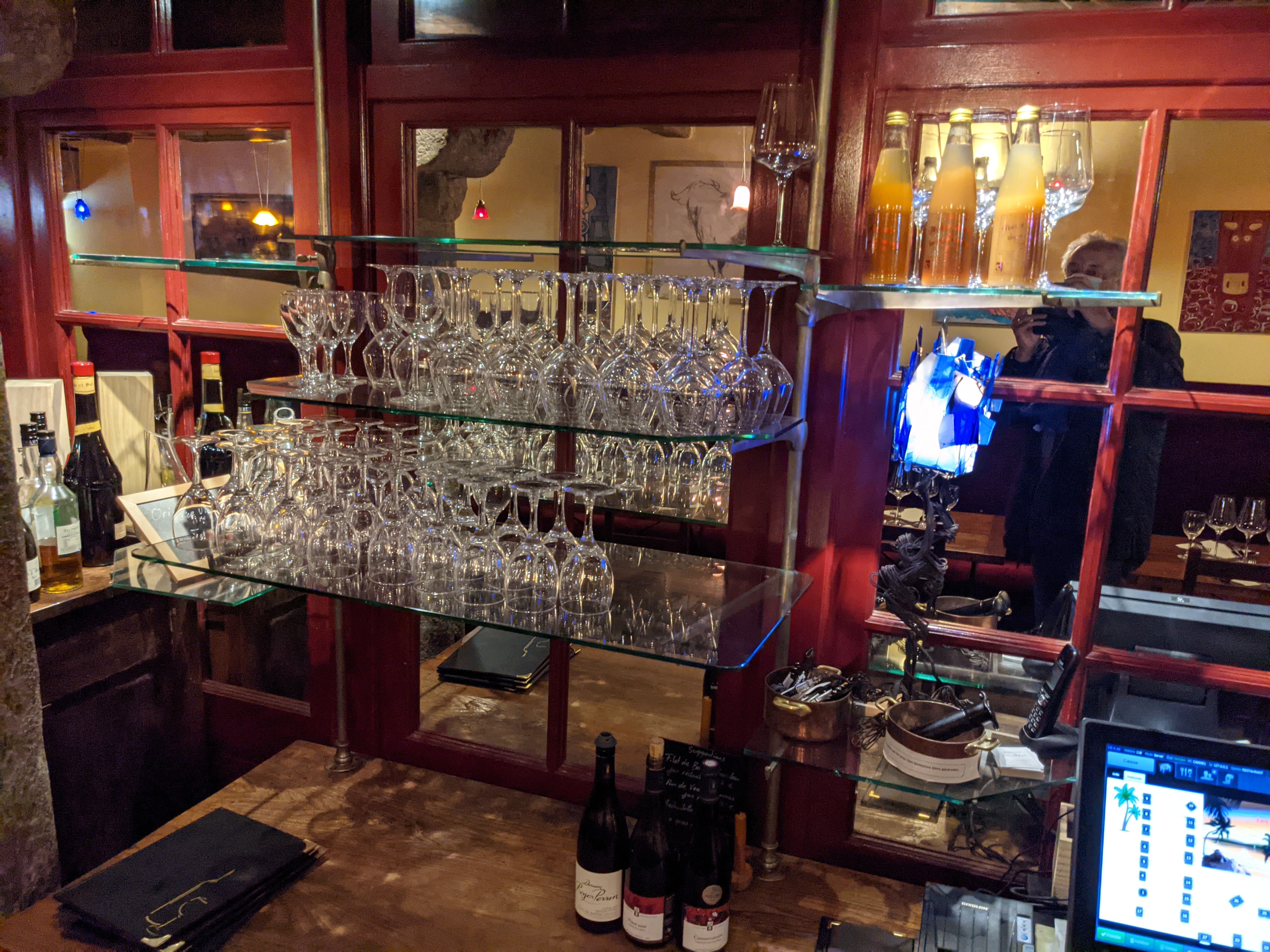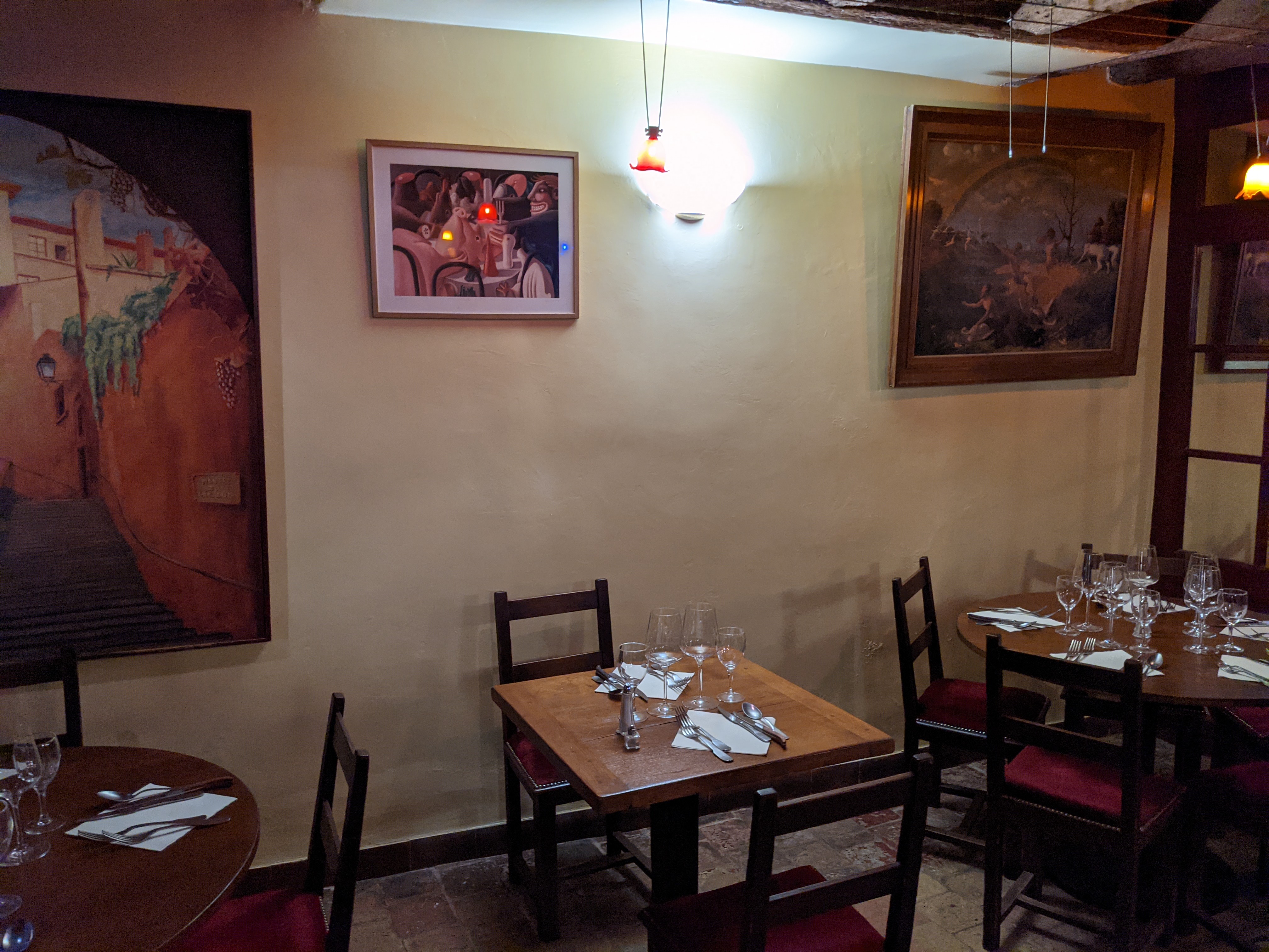 Le menu, plat-dessert, est à 17e environ, la carafe de vin est compris dedans. Les plats sont délicieux. Il n'est proposé que 2 ou 3 plats. Je trouve cela mieux pour la qualité. La déco est rustique, ils ont mis en valeur la beauté de la bâtisse. Les wc valent le détour. Vous empruntez un escalier en colimaçon. Vous y apercevez des portes en bois qui donnent chez les voisins. Je trouve ce lieu charmant. Pour certains jours, je vous conseille de réserver. J adore. C'est un restaurant réputé.