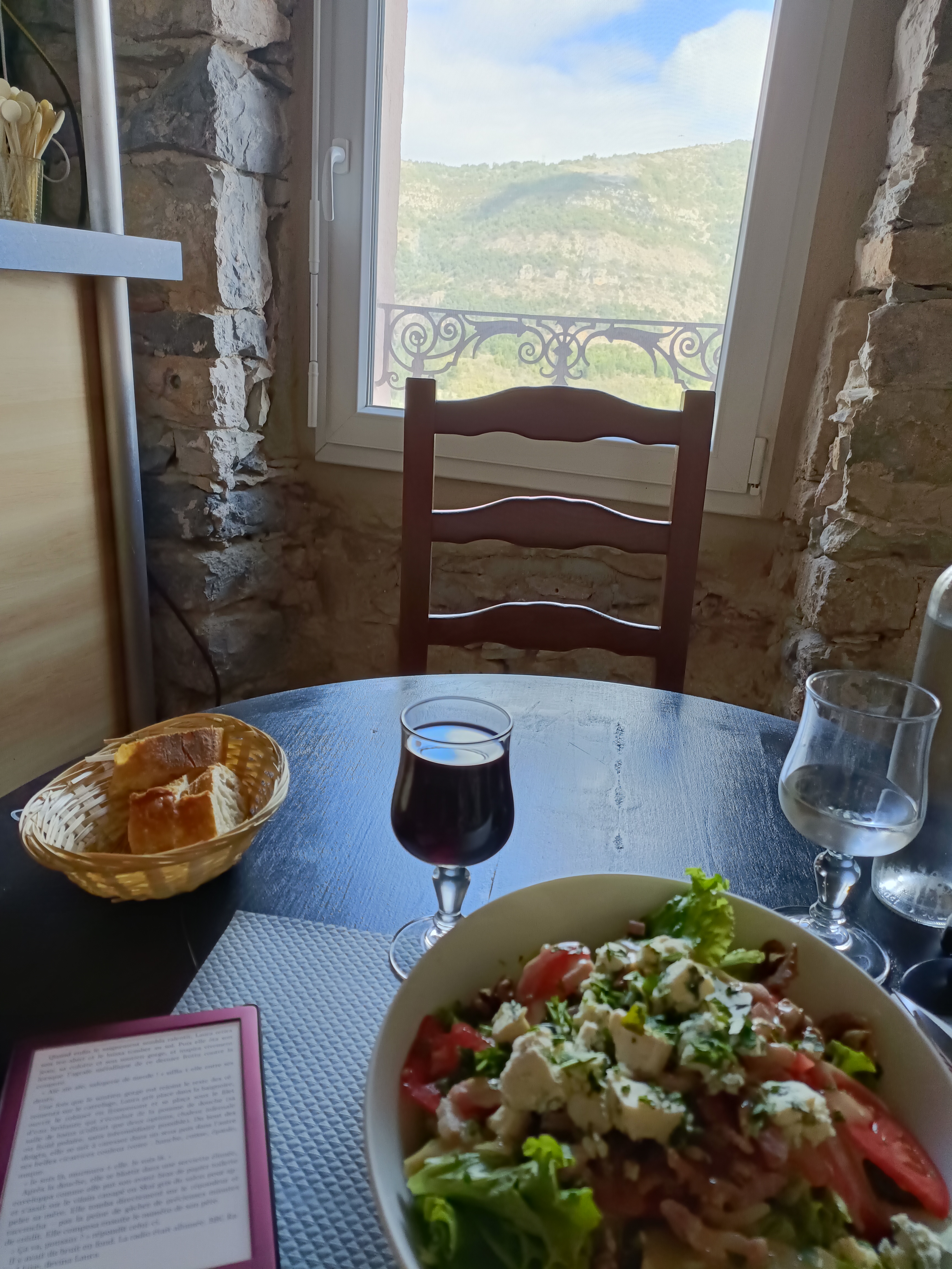 Halte déjeuner après avoir visité les caves, salade au roquefort sympathique, lieu un peu poussiéreux, l'accueil pourrait être plus souriant