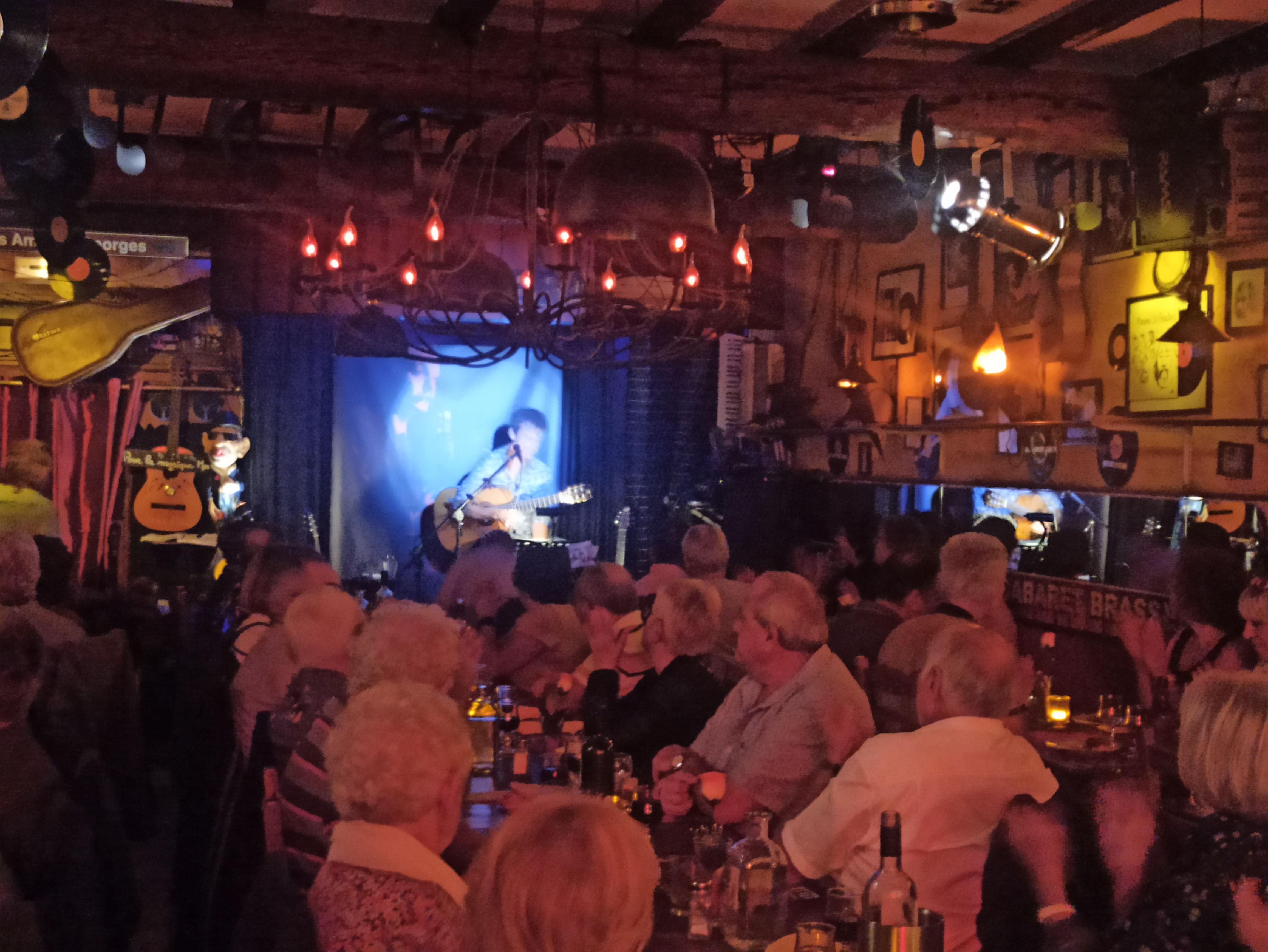 5 décembre 2015, salle d'environ 75 personnes très serrés, on voit que le patron aime l'argent quitte à risquer la vie de ses clients en cas d'évacuation urgente ... Sinon, service très pro, mais sans aucune chaleur, les 2 filles qui servent ne sourit à aucun moment ! La qualité du repas est moyenne, le prix est correct pour un cabaret. Quant au spectacle, étant en fond de salle, je n'ai rien entendu du diaporama. Puis quand le patron a pris sa guitare, j'entendais un petit peu plus, mais cela reste inconfortable en termes de qualité. Ce qui est sympa, c'est le choix des chansons que la salle connait par cœur Bref, concept sympa mais des améliorations sont vraiment à réaliser