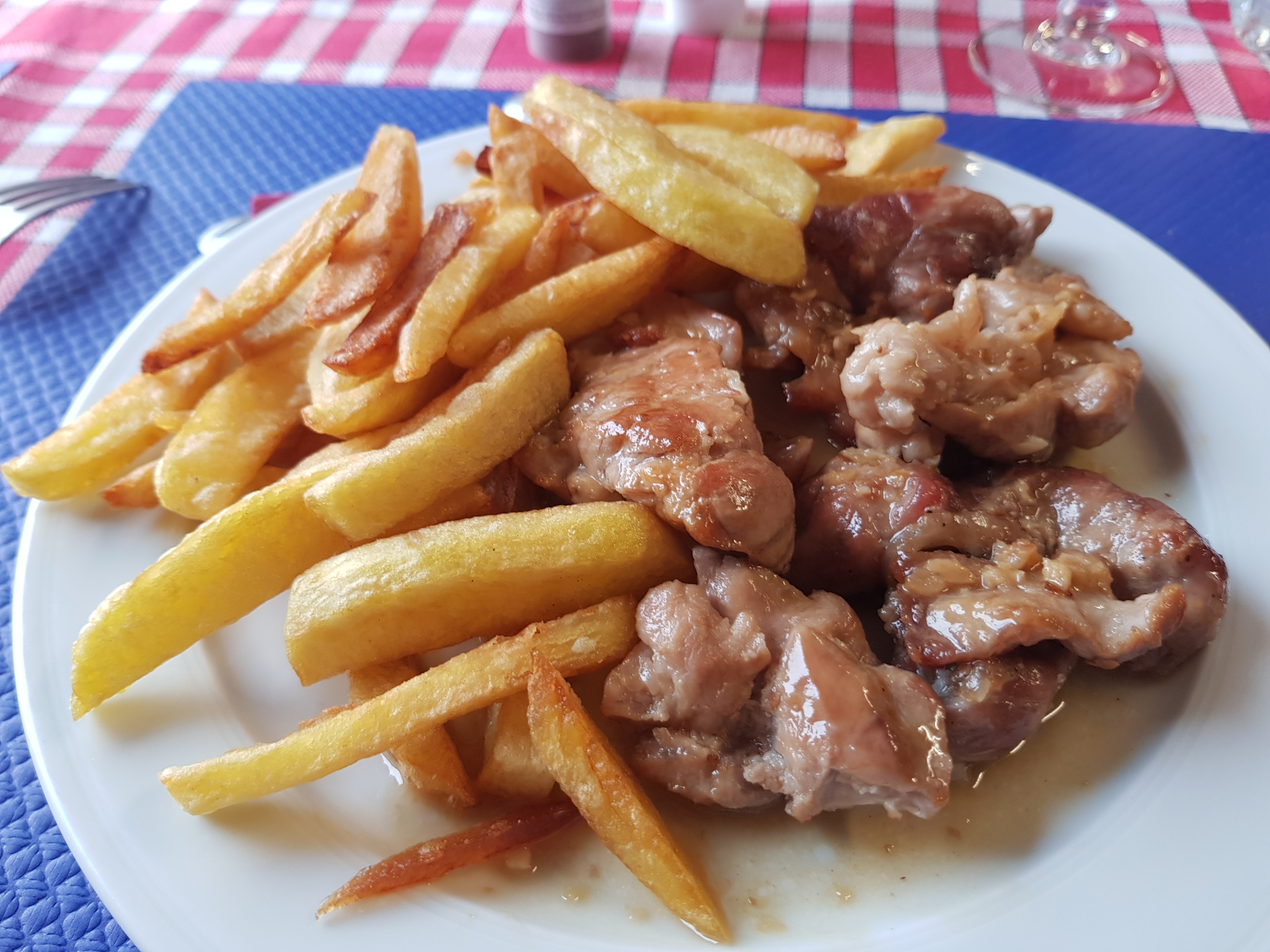 Pas d'airs, pas de grâces. Nourriture à manger. Entrées dans des assiettes sous la glacière, plat maison, fromage sur plateau bien garni, dessert et vin, 14,50€. Servi midi et soir. Par temps chaud, les repas sont servis dehors, sous les arbres. A recommander pour une halte repas.