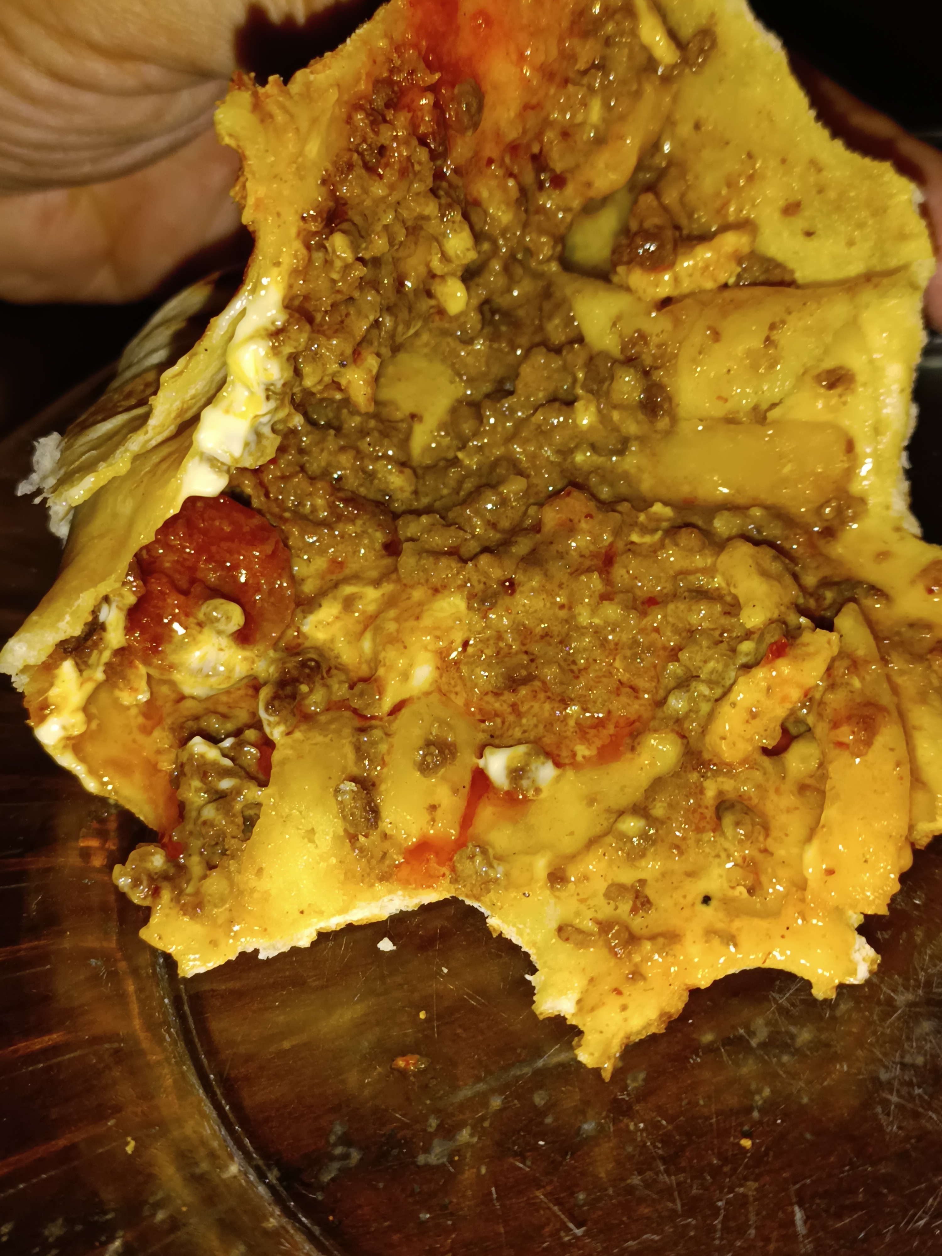 Punaise, c'est collé a la maison, au début c'était drôle de répéter 20 fois les commandes pour finir par avoir un tacos aux ingrédients non demandés, mais là c'est trop. On a les bons ingrédients mais sans sauce fromagère cette fois, 4 tacos commandés et pas un seul avec du fromage. Je ne vais même pas finir le mien, il baigne dans le jus de viande cuite et la harissa, franchement un tacos sans sauce fromagère, il aurait pu dire qu'il ne pouvait pas faire de tacos plutôt que de servir ça....
