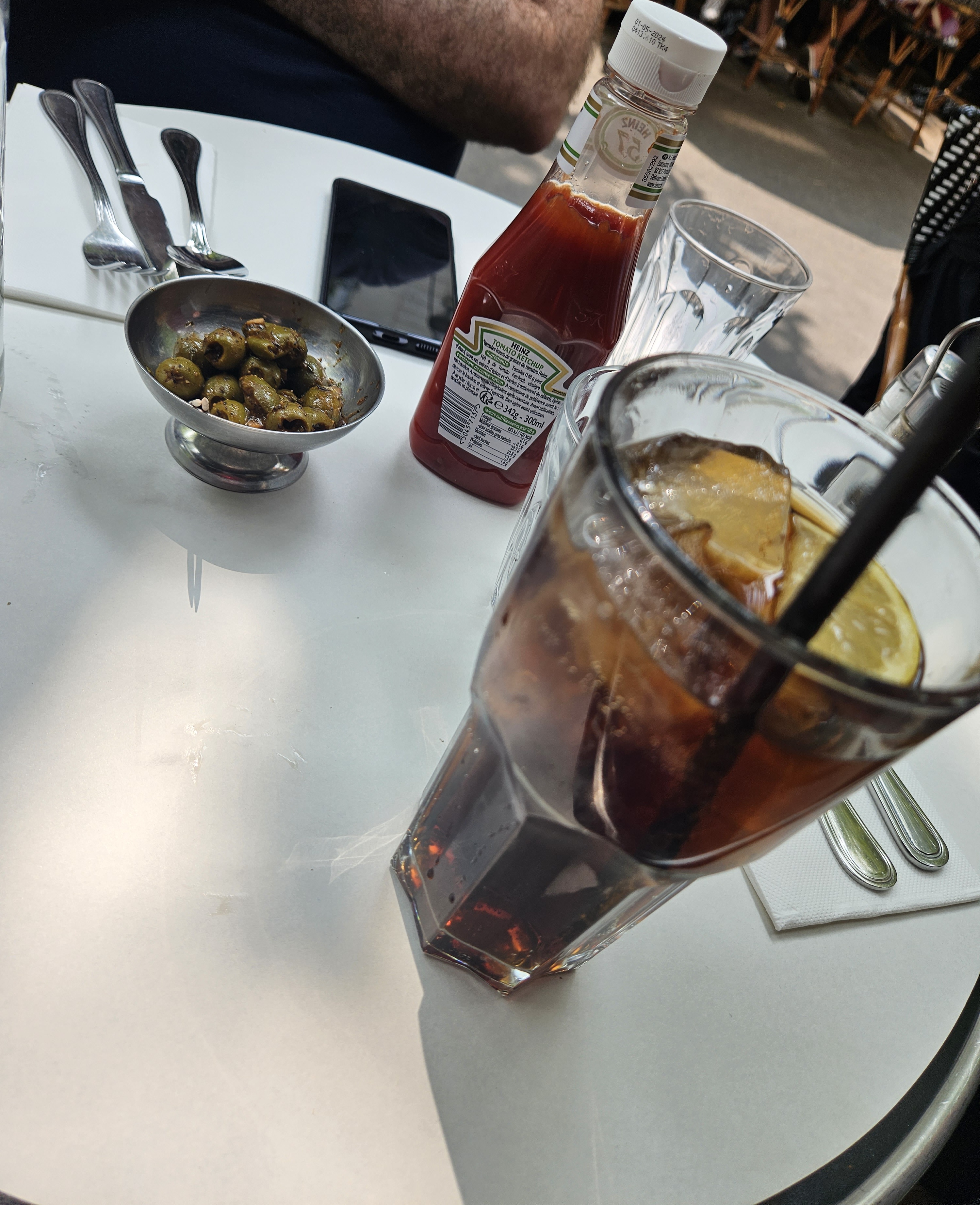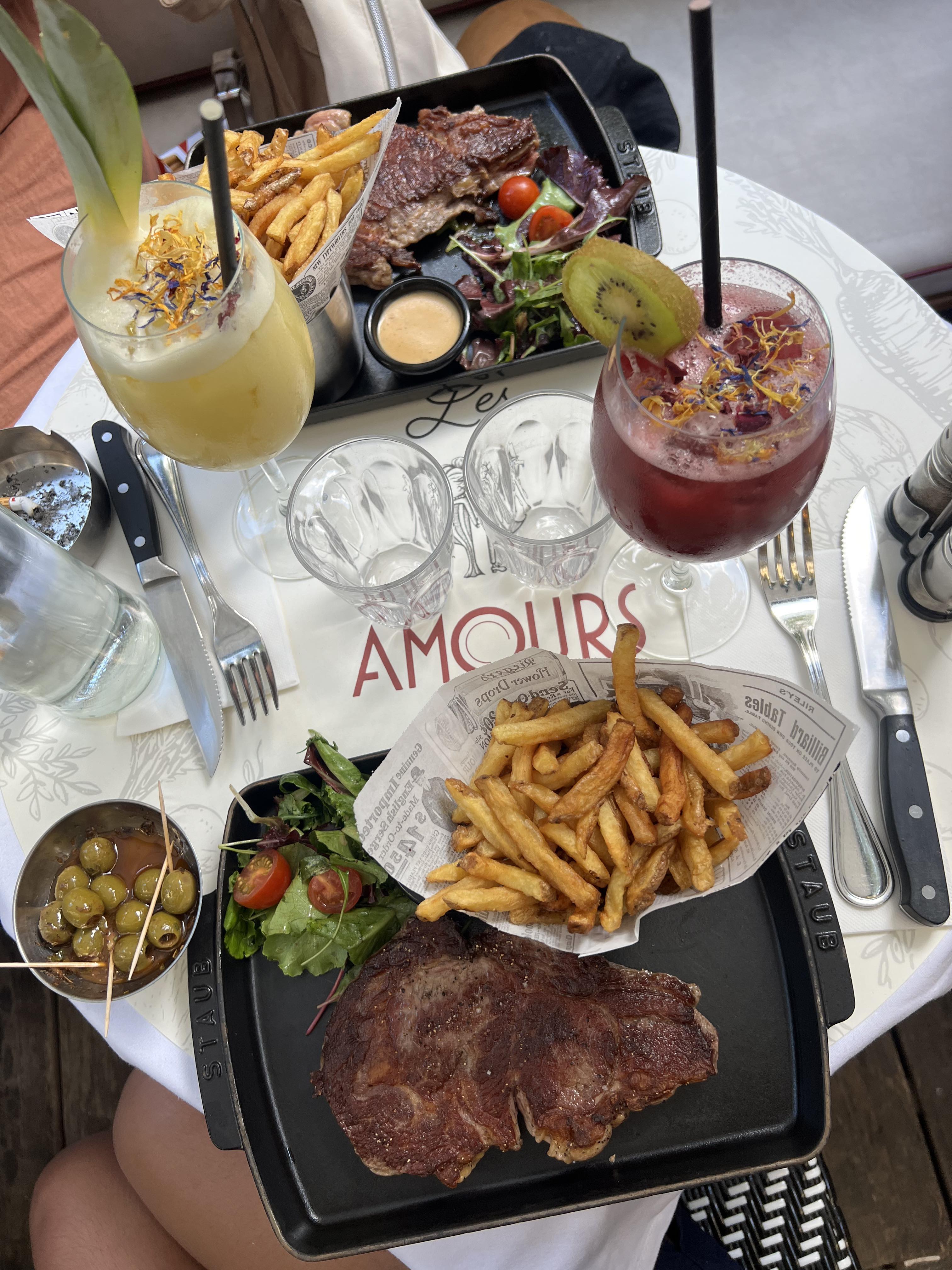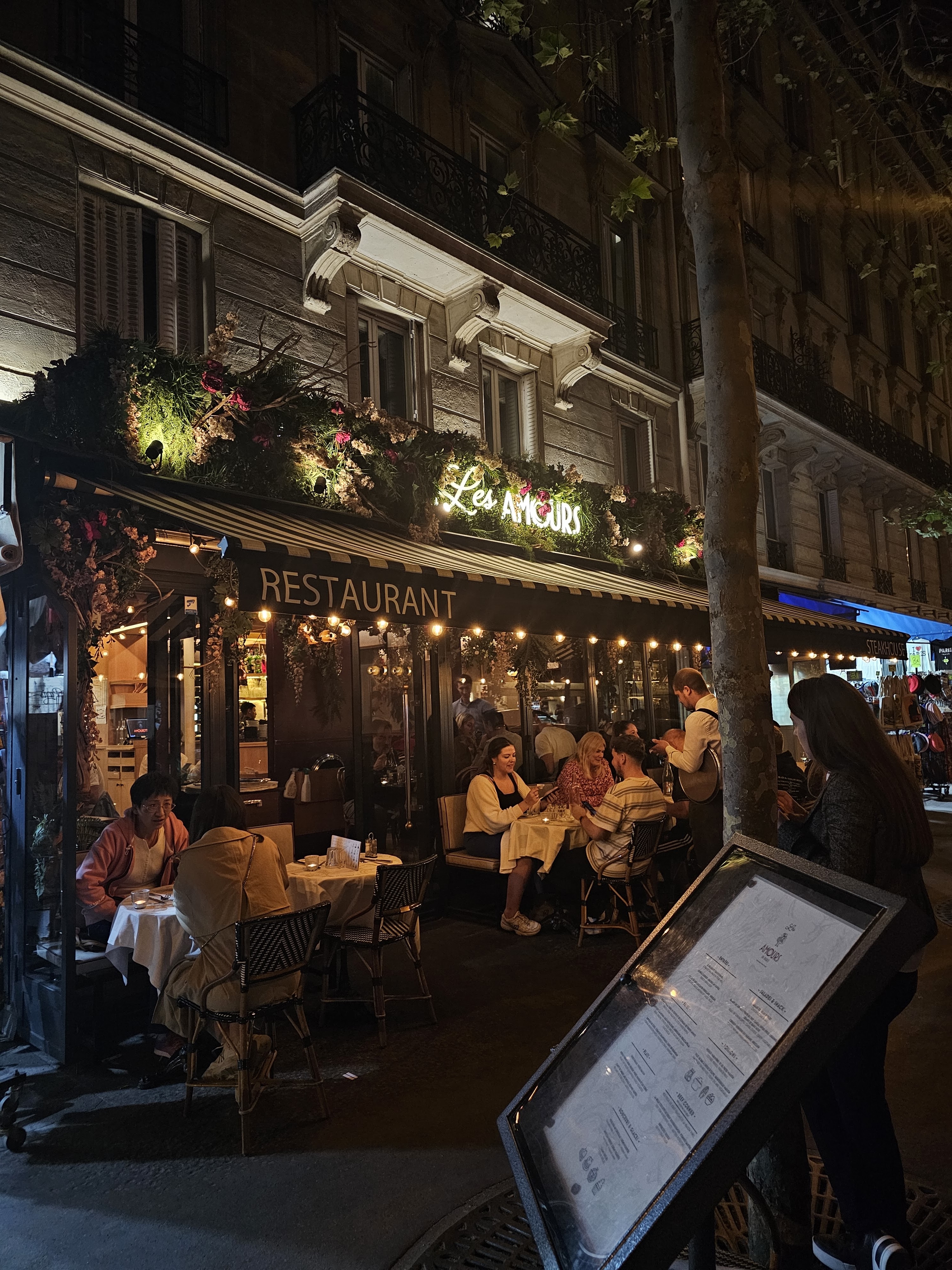 Très bien situé et ambiance mais extrêmement cher. Nous nous sommes presque sentis arnaqués. Le serveur nous a demandé si nous voulions de l'eau, nous avons répondu que l'eau du robinet serait bonne, nous avons découvert plus tard que l'eau nous avait été facturée 10,50 euros. Paris a beaucoup d'autres endroits abordables, je resterais à l'écart des Amours à l'avenir, sans rapport qualité-prix.