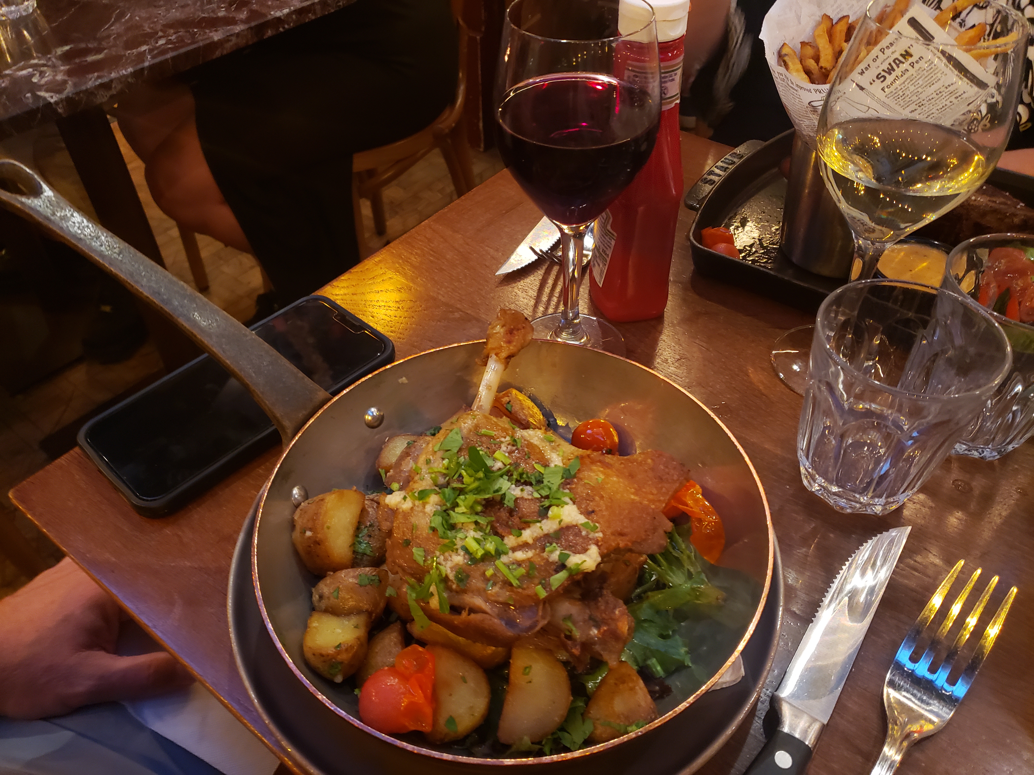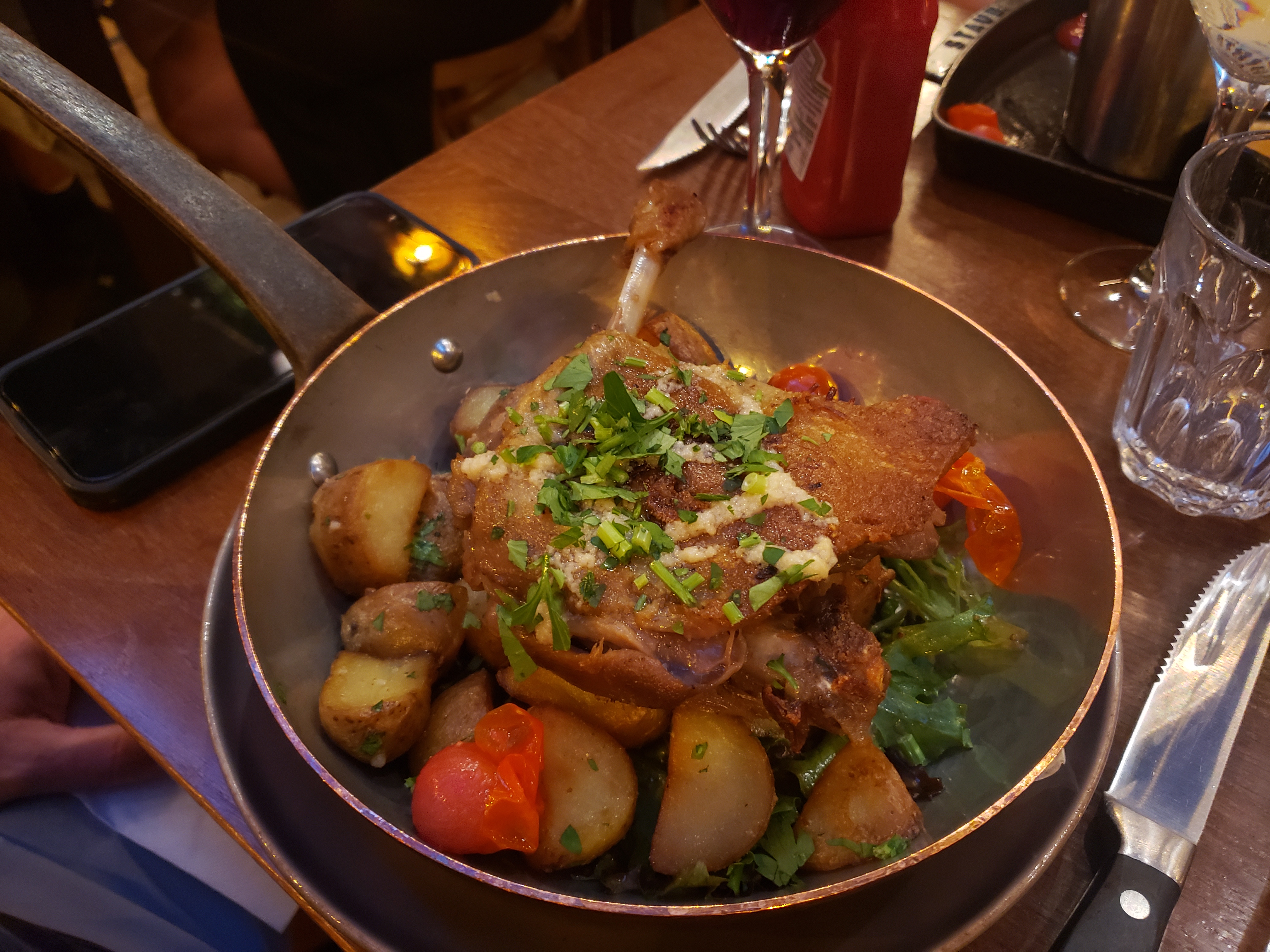 J'étais en tournée à arrêts multiples avec un temps très limité. J'avais recherché ce restaurant à l'avance car je cherchais un endroit servant du canard à proximité de la tour. J'y suis allé directement et ils ont pu me faire entrer tout de suite. J'ai commandé la cuisse de canard confite et le pain à l'ail. J'ai reçu ma nourriture en moins de 10 minutes ! Le canard était super tendre, facile à manger et les pommes de terre étaient délicieuses ! J'ai mangé jusqu'à être rassasié ! Excellent service, très poli, connaissait l'anglais. Et j'ai pu prendre le bus à l'heure car il est très proche de l'arrêt de bus !